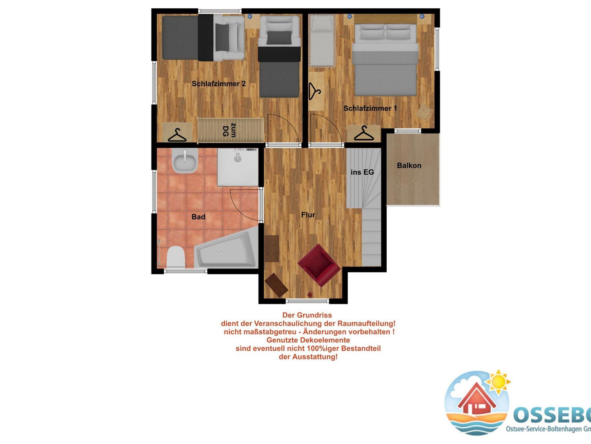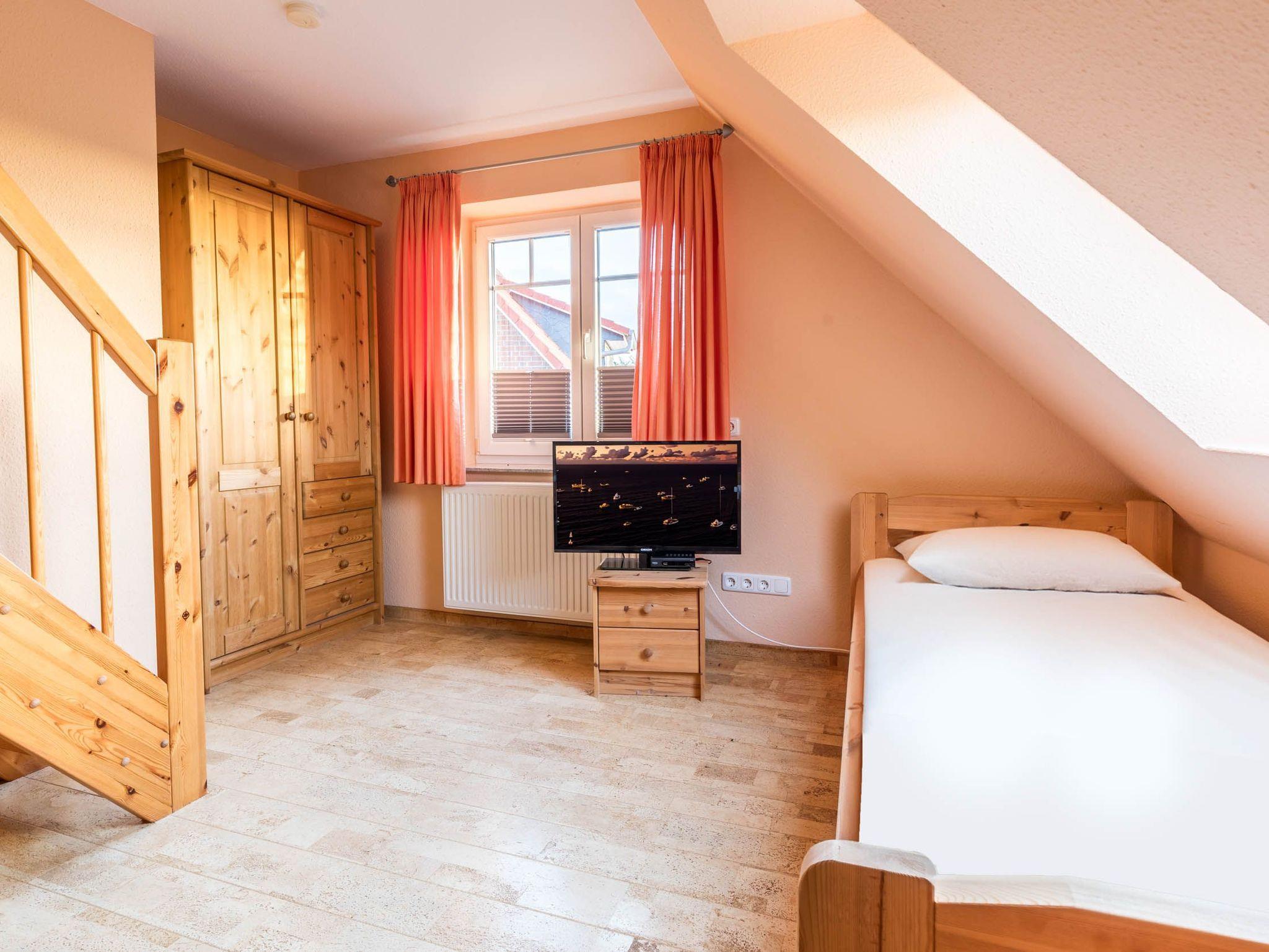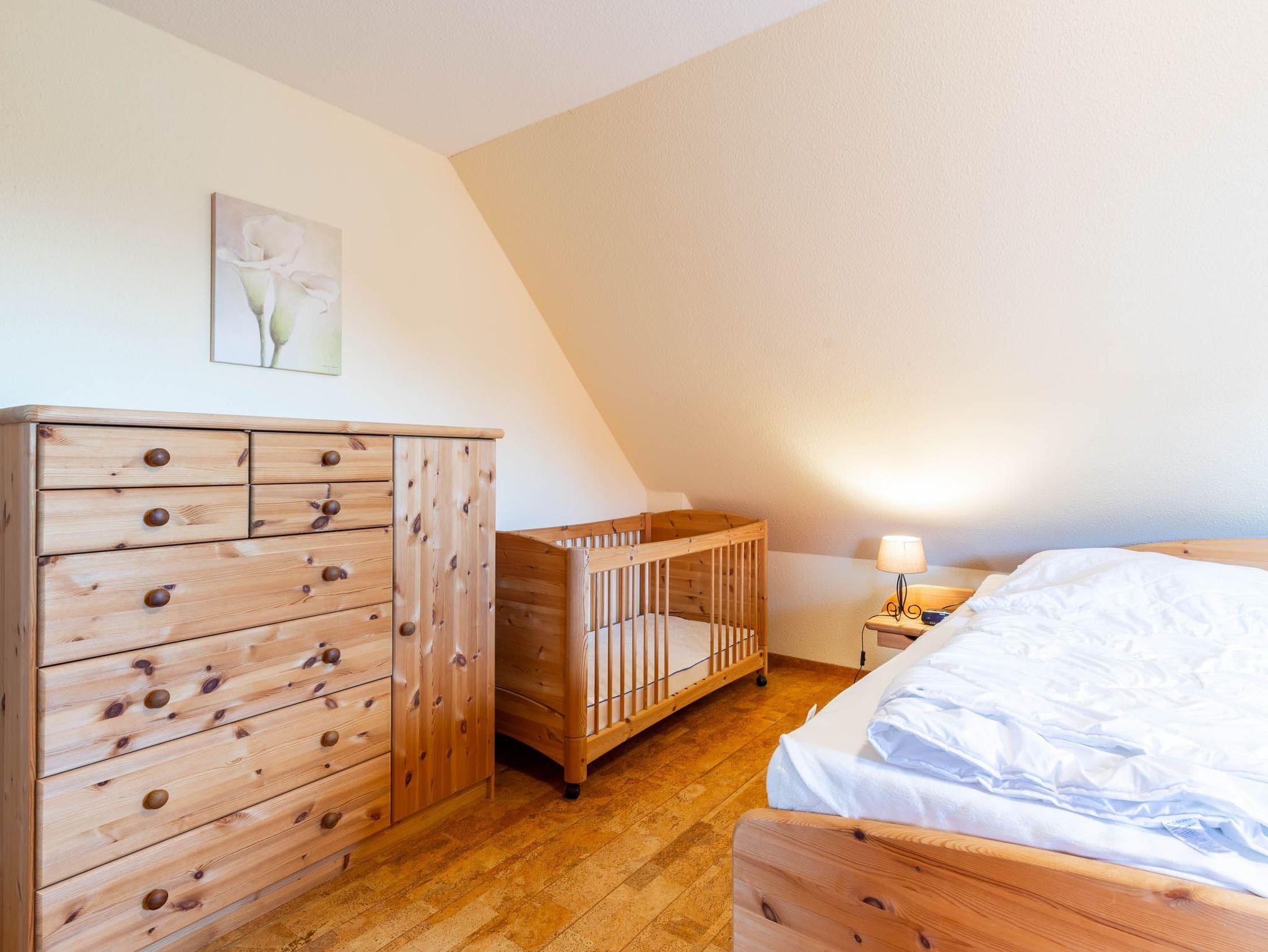 Weiterhin finden Sie auf der oberen Etage zwei separate Schlafräume. Das große Schlafzimmer ist mit einem Doppelbett, einem festen Holzgitterbett, einer Kommode sowie einem Kleiderschrank ausgestattet. Im Gäste-/ Kinderzimmer befinden sich zwei Einzelbetten, ein Kleiderschrank, ein eigenes TV-Gerät und ein DVD-Player.