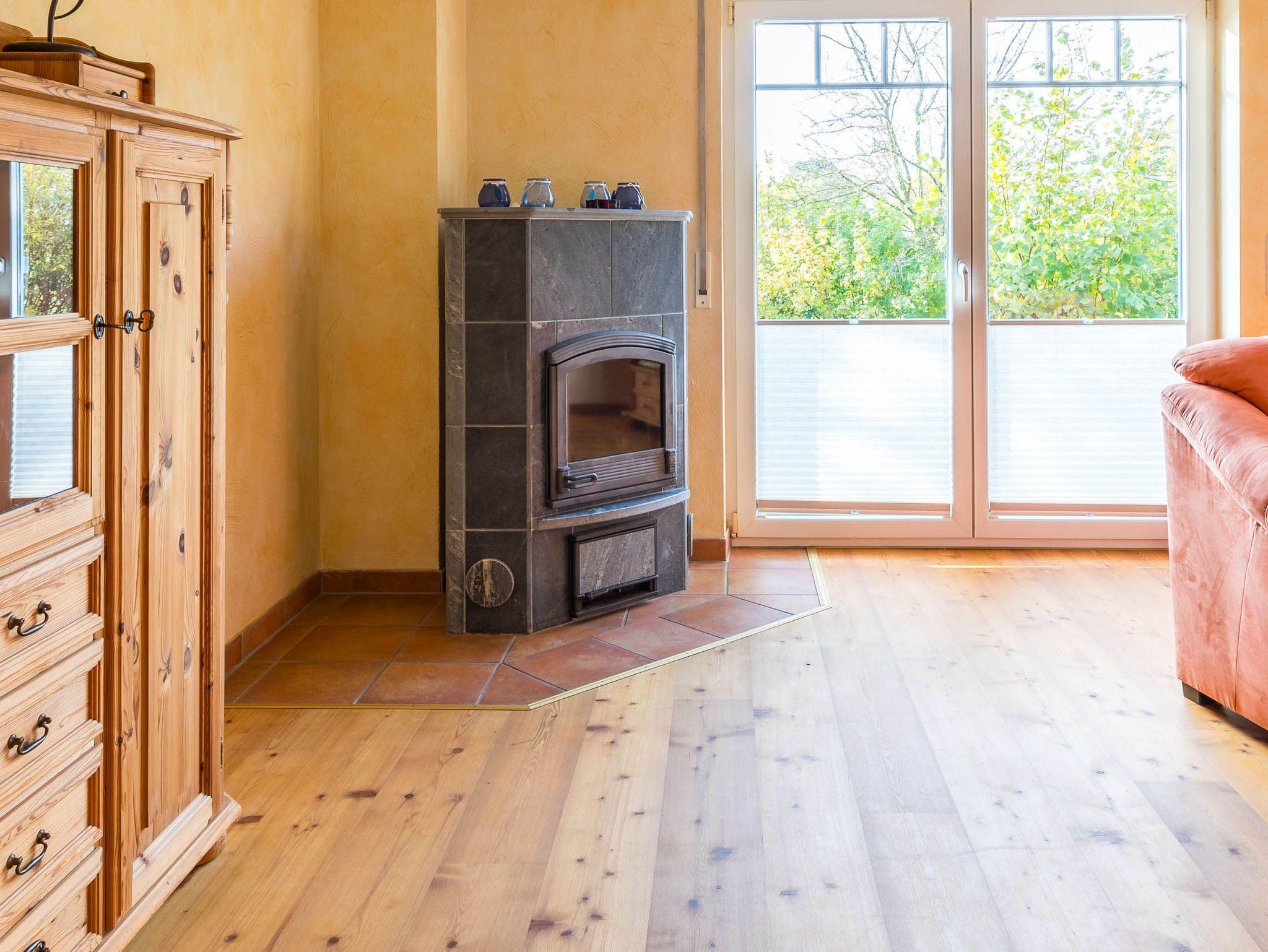 Der Wohnbereich im Erdgeschoss wartet unter anderem mit einem wunderschönen Kaminofen, zwei Sofas und einem Sessel auf ? perfekt für den abendlichen Ausklang nach einem ereignisreichen Tag an der Ostsee.