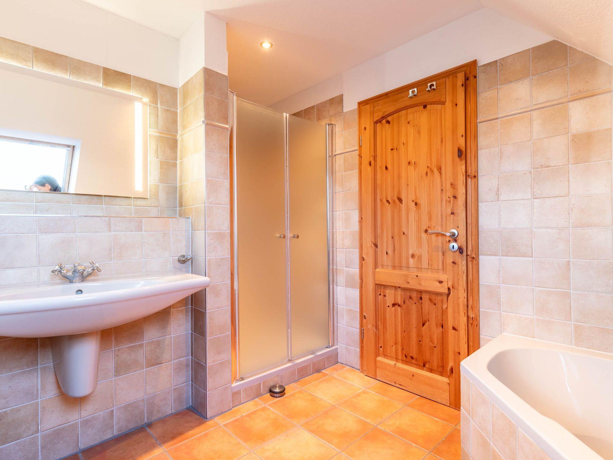 Ebenso gibt es auf dieser Ebene ein Badezimmer, welches mit einer Badewanne, einer Dusche und einem WC ausgerüstet ist.