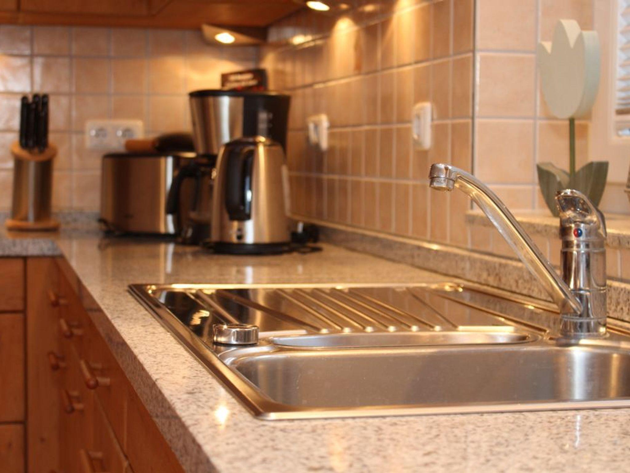 Die separate Küche aus echtem Holz bietet eine gehobene Küchenausstattung und umfasst einen Herd mit Backofen, einen Kühlschrank mit Gefrierfach, eine Spülmaschine, eine Mikrowelle, einen Mixer, einen Toaster, einen Wasserkocher sowie eine Kaffeemaschine ? alles, was für einen komfortablen Urlaub benötigt wird. Darüber hinaus gibt es in der Küche einen Essbereich.