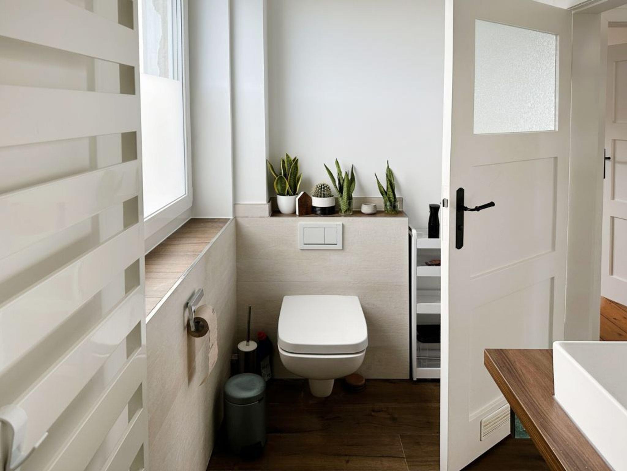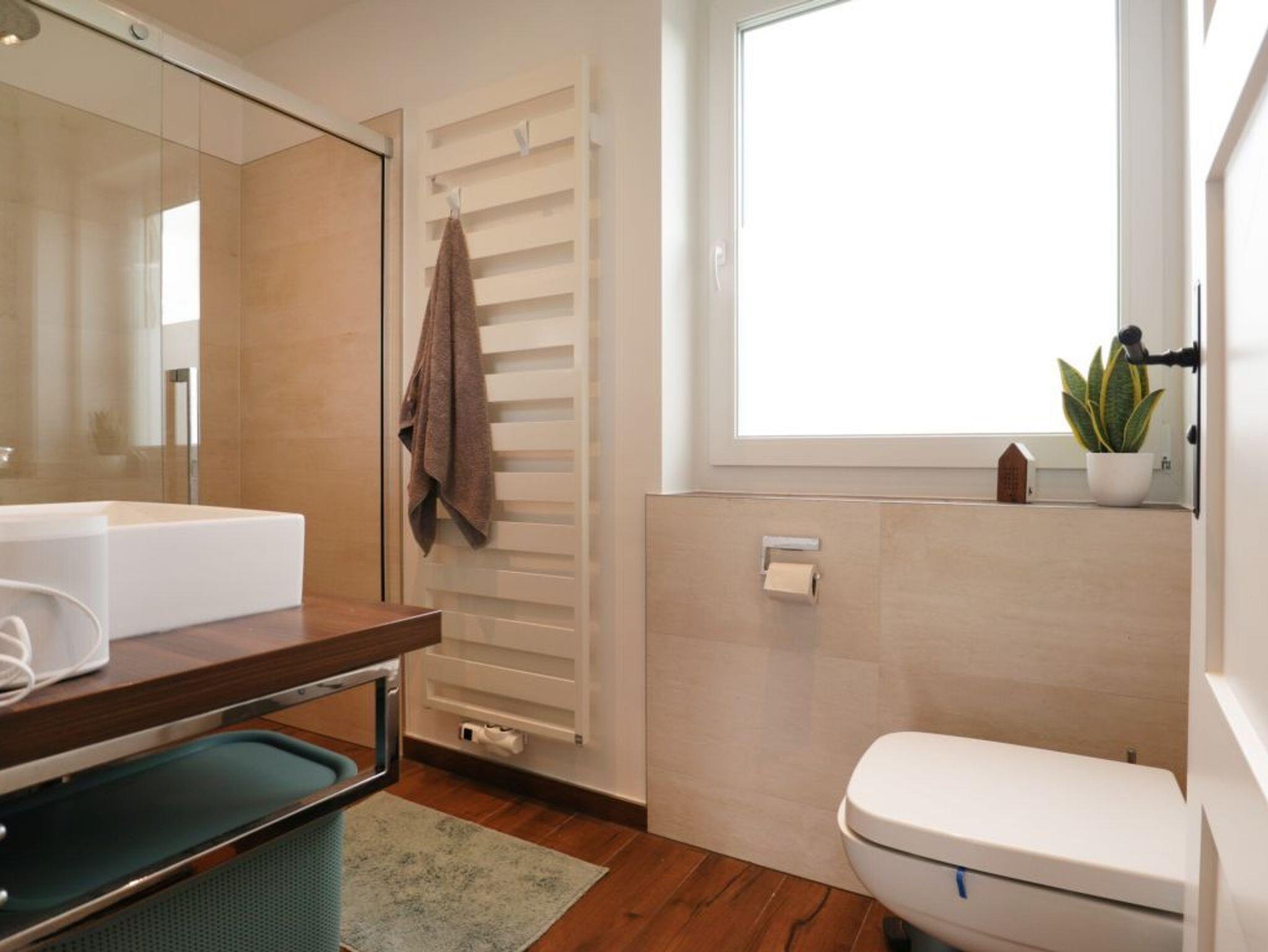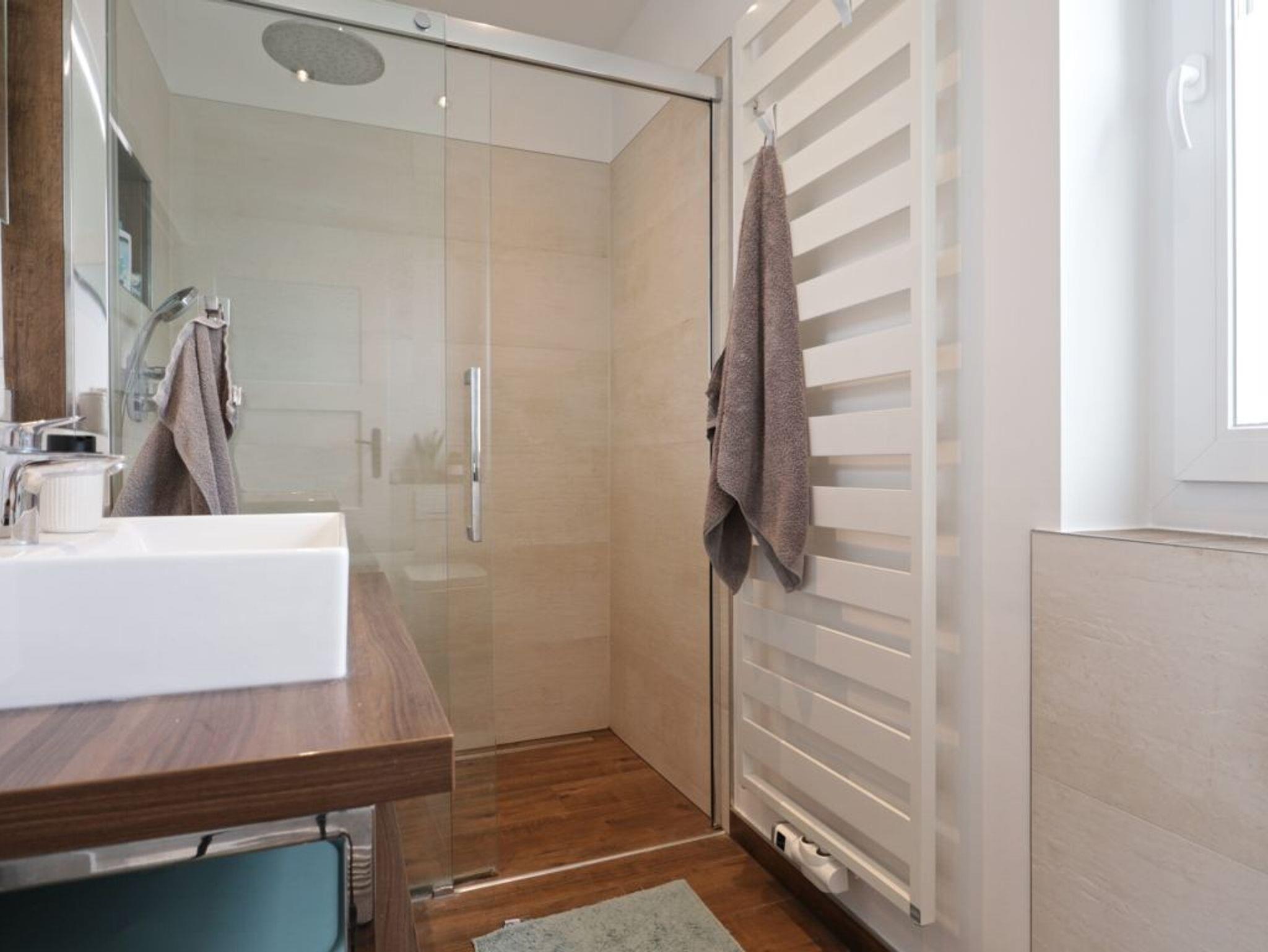 Des Weiteren befindet sich ein modernes Tageslicht Duschbad mit Waschtisch und WC im Erdgeschoss. Ein Waschtrockner, Wäscheständer, Bügeleisen und Bügelbrett stehen kostenfrei bereit.