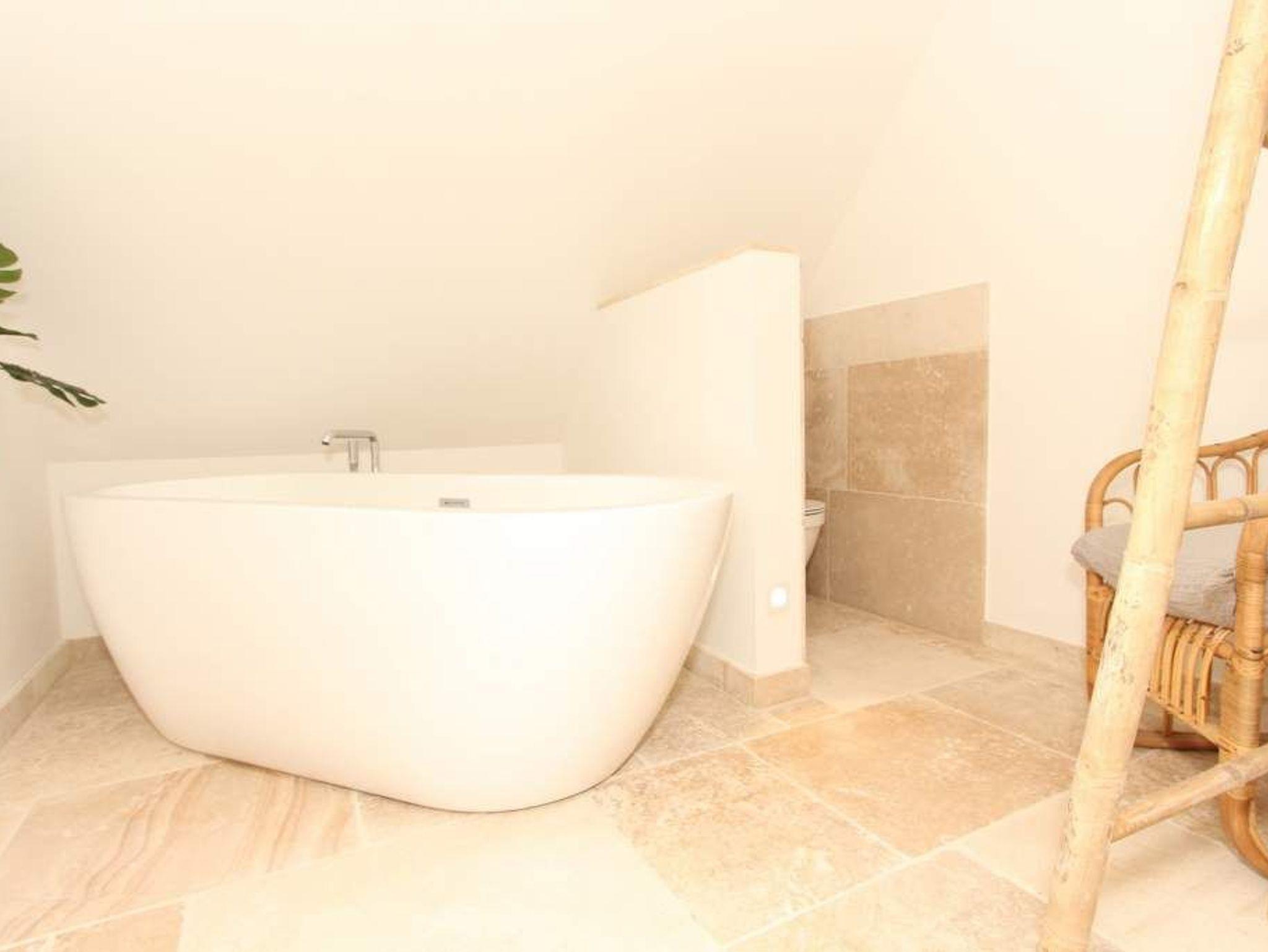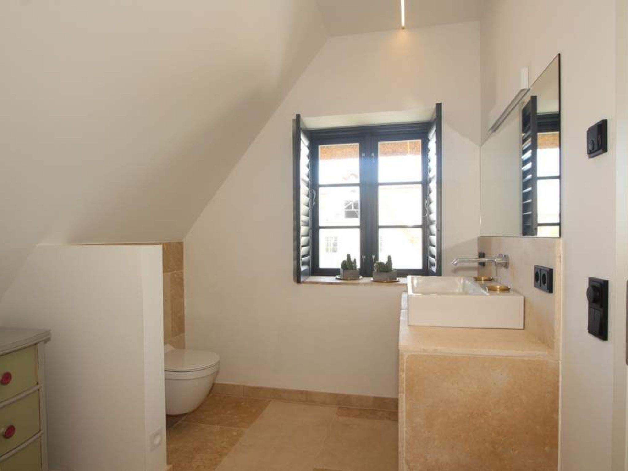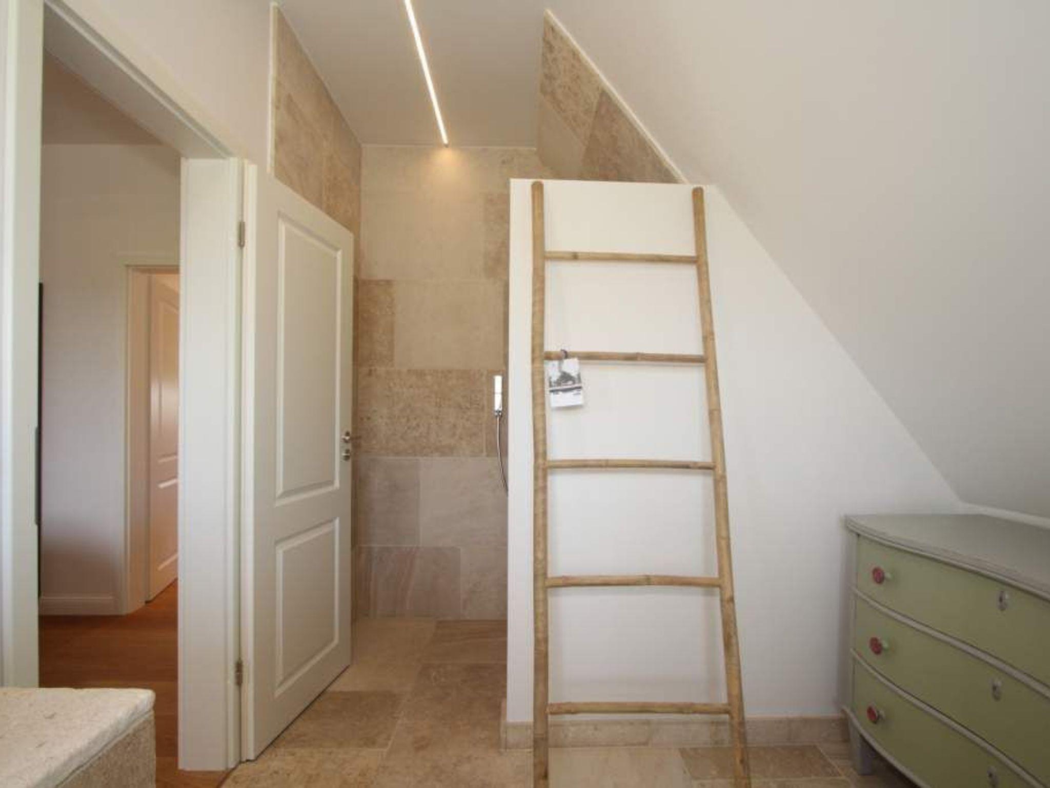 Im größeren Badzimmer auf dieser Wohnebene befindet sich neben dem Waschtisch, auch ein WC sowie eine freistehende Badewanne. Das andere Badezimmer ziert eine Dusche und ein Waschtisch mit WC.