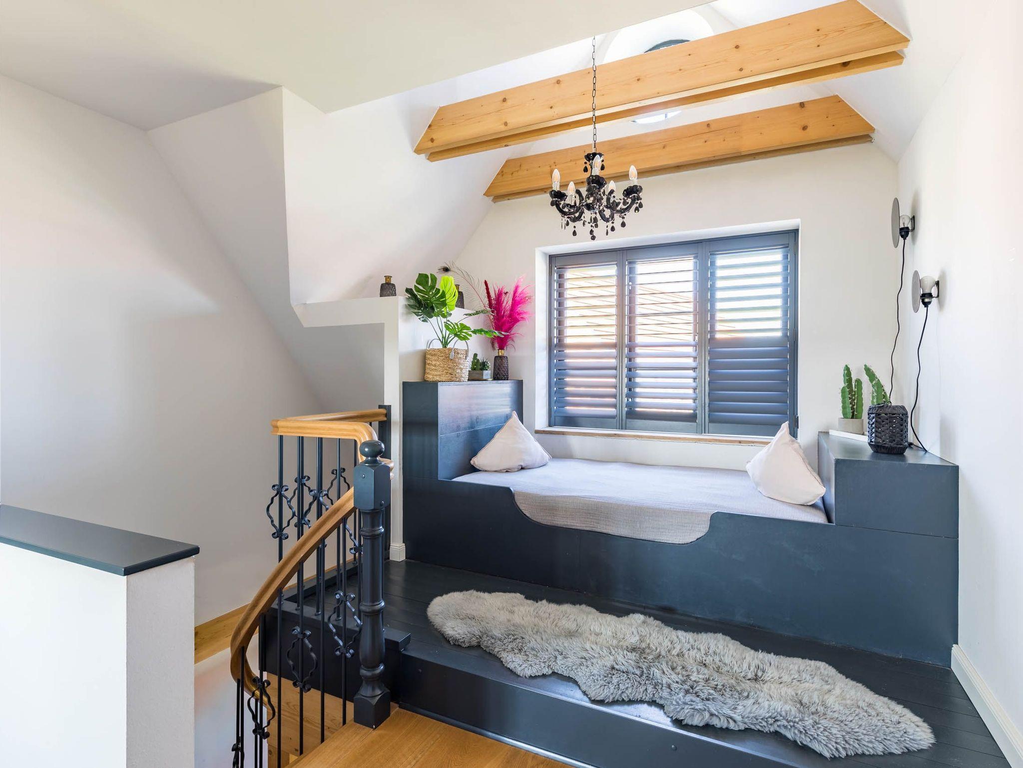 Die Empore besticht durch das große Daybed 120x200cm mit TV. Hier können Sie entspannen, ein gutes Buch lesen oder einen zusätzlichen Schlafplatz entstehen lassen.