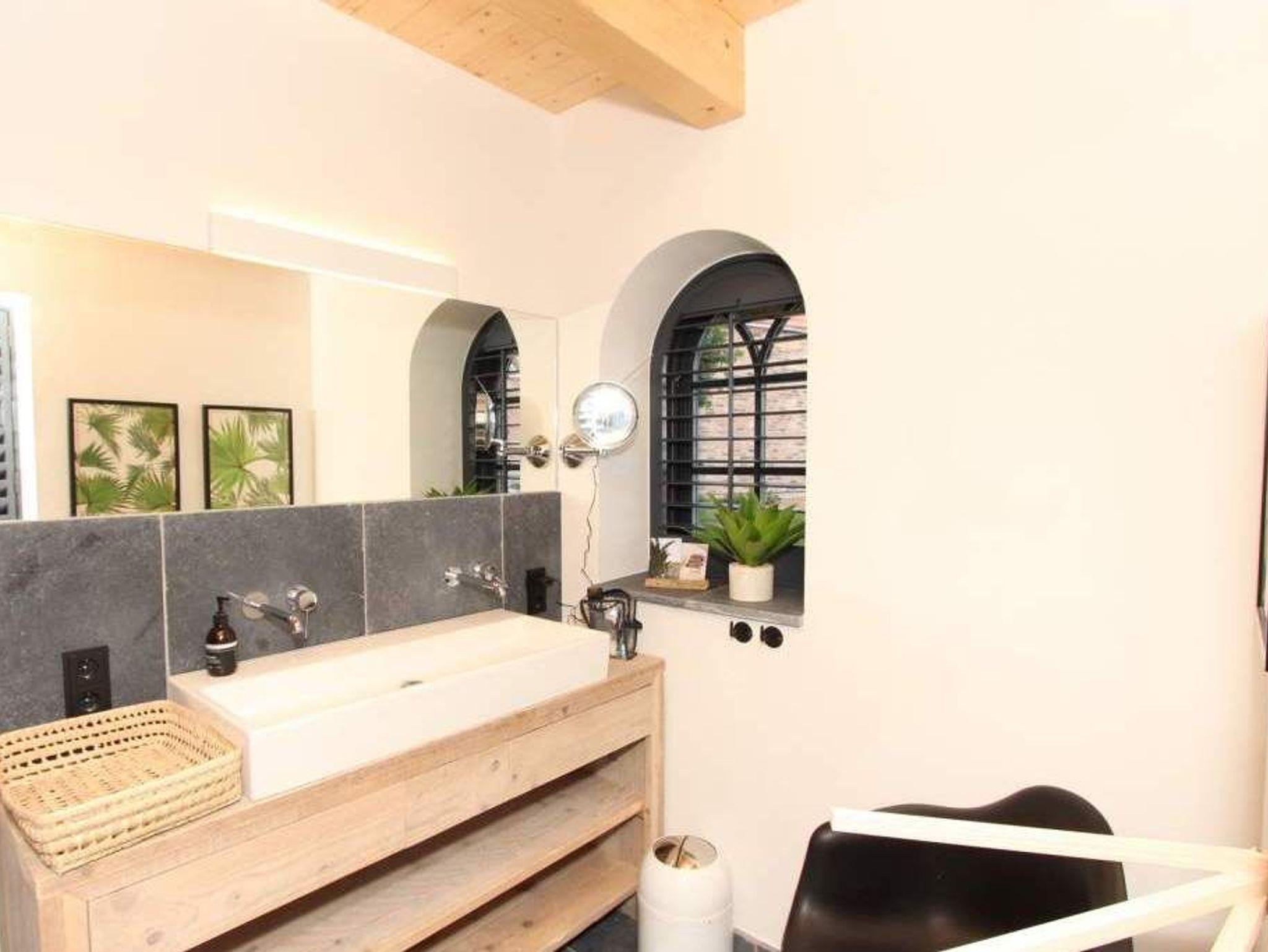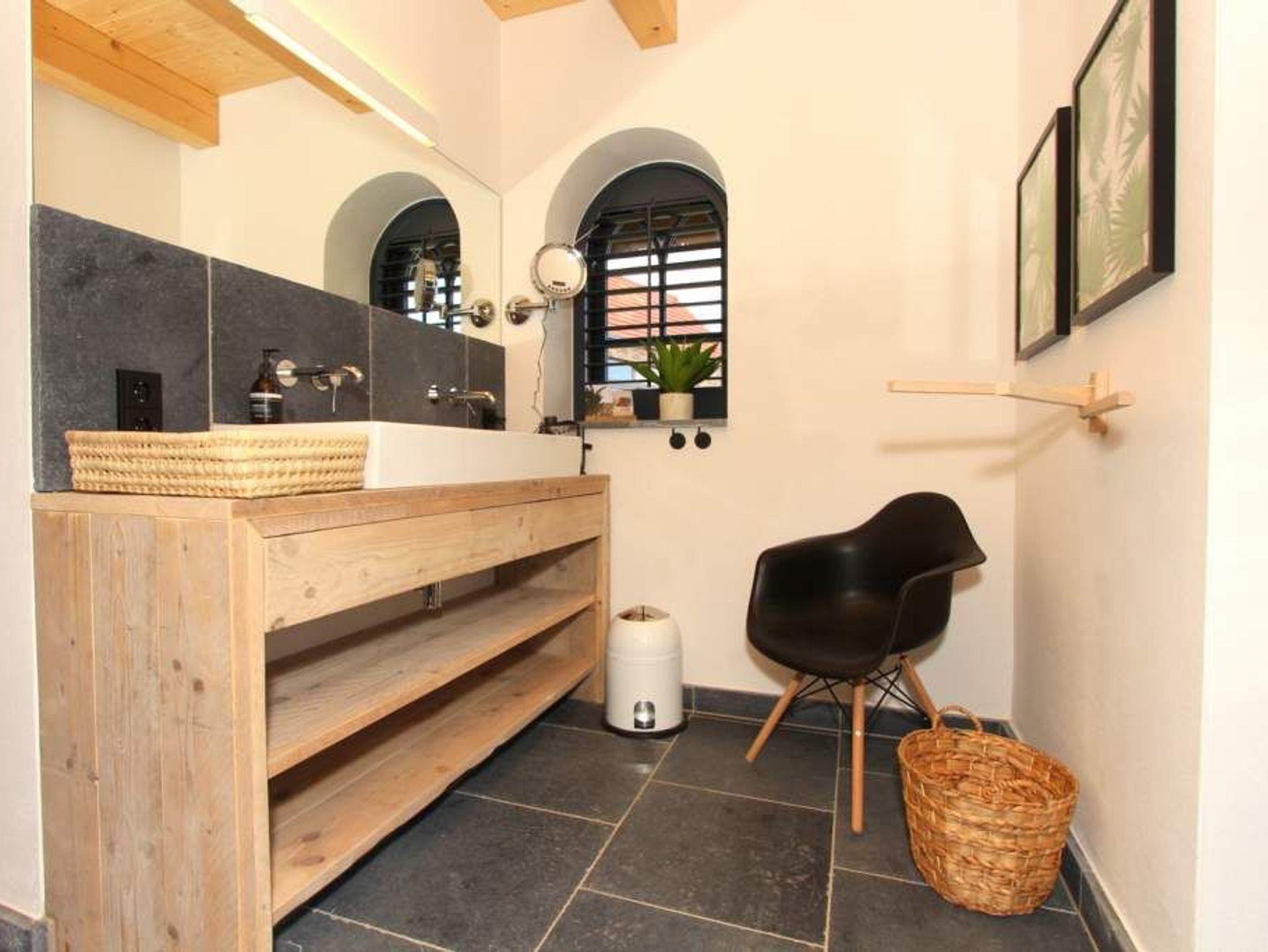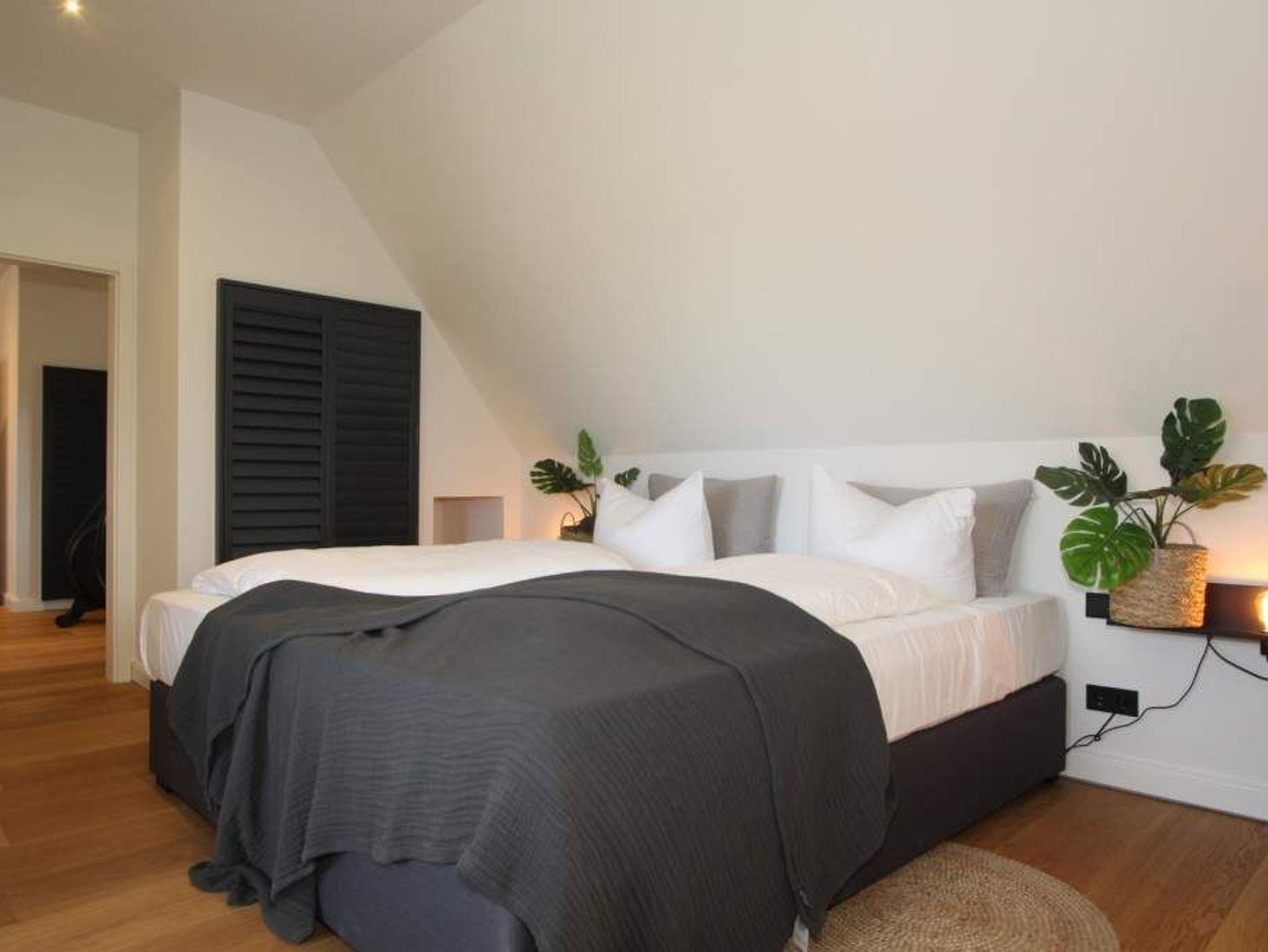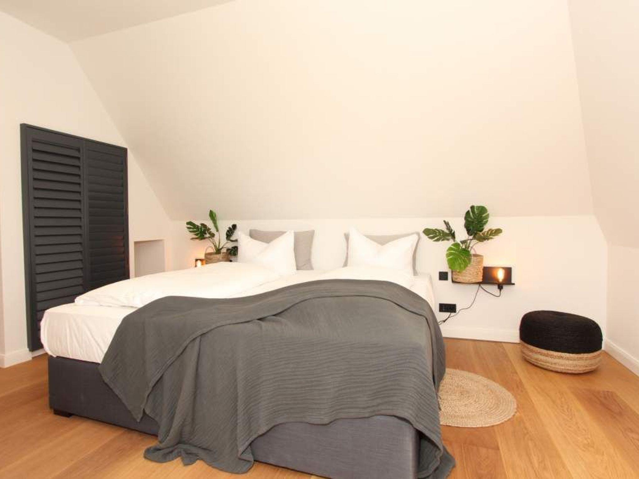 Ein Schlafzimmer mit Boxspringbett 180x200cm und ein passender Kleiderschrank erwarten Sie ebenfalls, wie auch das Badezimmer mit Doppelwaschtisch, WC und Dusche.