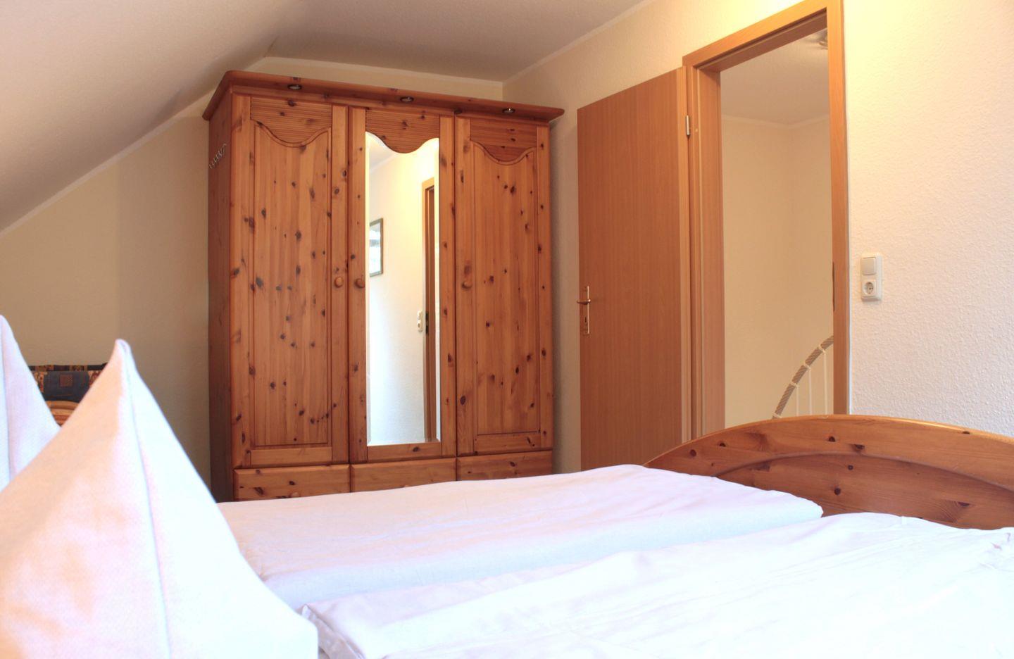 Über eine Treppe gelangen Sie in die obere Etage des Hauses, wo sich zwei separate Schlafzimmer und das Badezimmer befinden. Die Schlafräume sind entweder mit einem Doppelbett oder zwei Einzelbetten und einem Kleiderschrank bzw. einer Kommode möbliert.