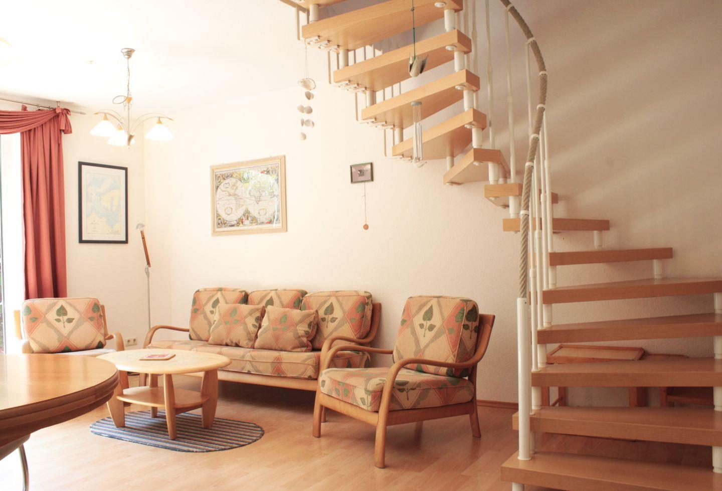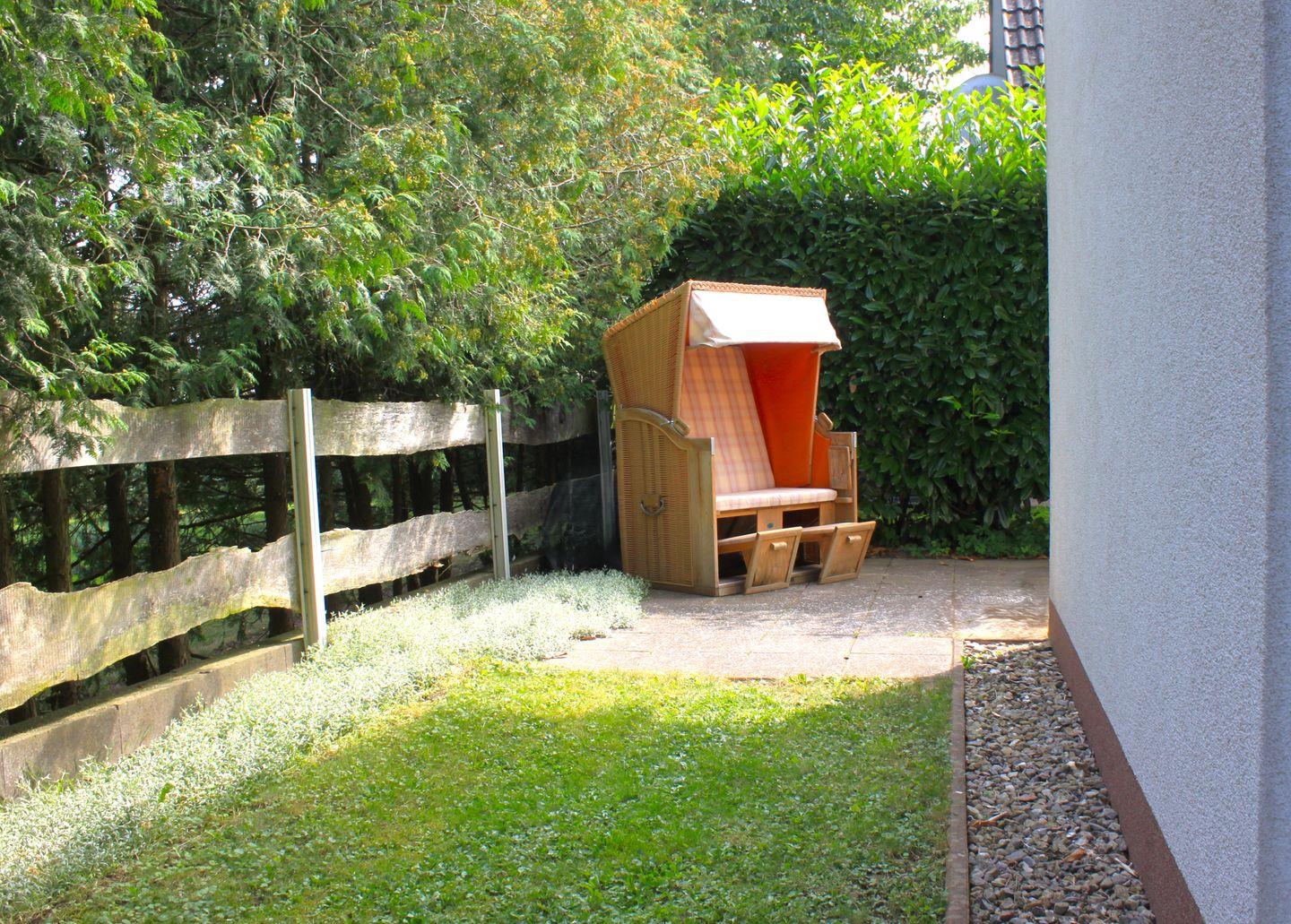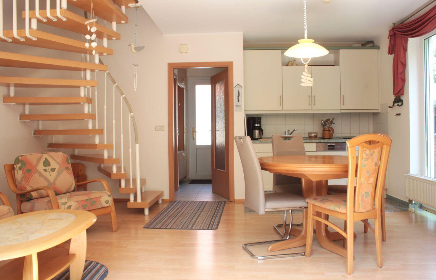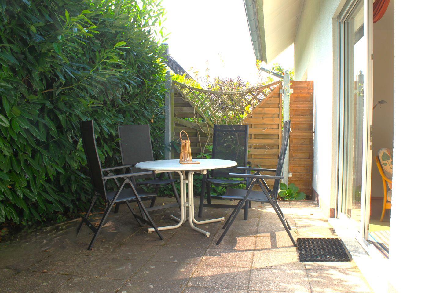 Im kombinierten Wohn- und Essbereich stehen eine Sofaecke mit TV-Gerät und WLAN, ein Esstisch mit Stühlen und eine integrierte Küchenzeile für Sie bereit. Die Küche ist bspw. mit einem Kühlschrank mit Gefrierfach, einer Geschirrspülmaschine, einem Herd, Kaffeemaschine und vielem mehr ausgestattet und ermöglicht Ihnen gute Bedingungen sich bei Bedarf selbst zu versorgen. Über eine Terrassentür im Wohnzimmer gelangen Sie auf die Terrasse, die mit einem Tisch mit Stühlen und einem Strandkorb ausgestattet ist. Hier verbringen Sie entspannte Stunden fernab des Trubels.