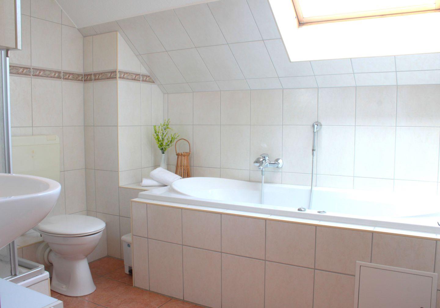 Das Badezimmer verfügt über ein Fenster und ist mit einer Badewanne mit Whirlpoolfunktion, einer Dusche, einem Waschtisch und WC ausgestattet.