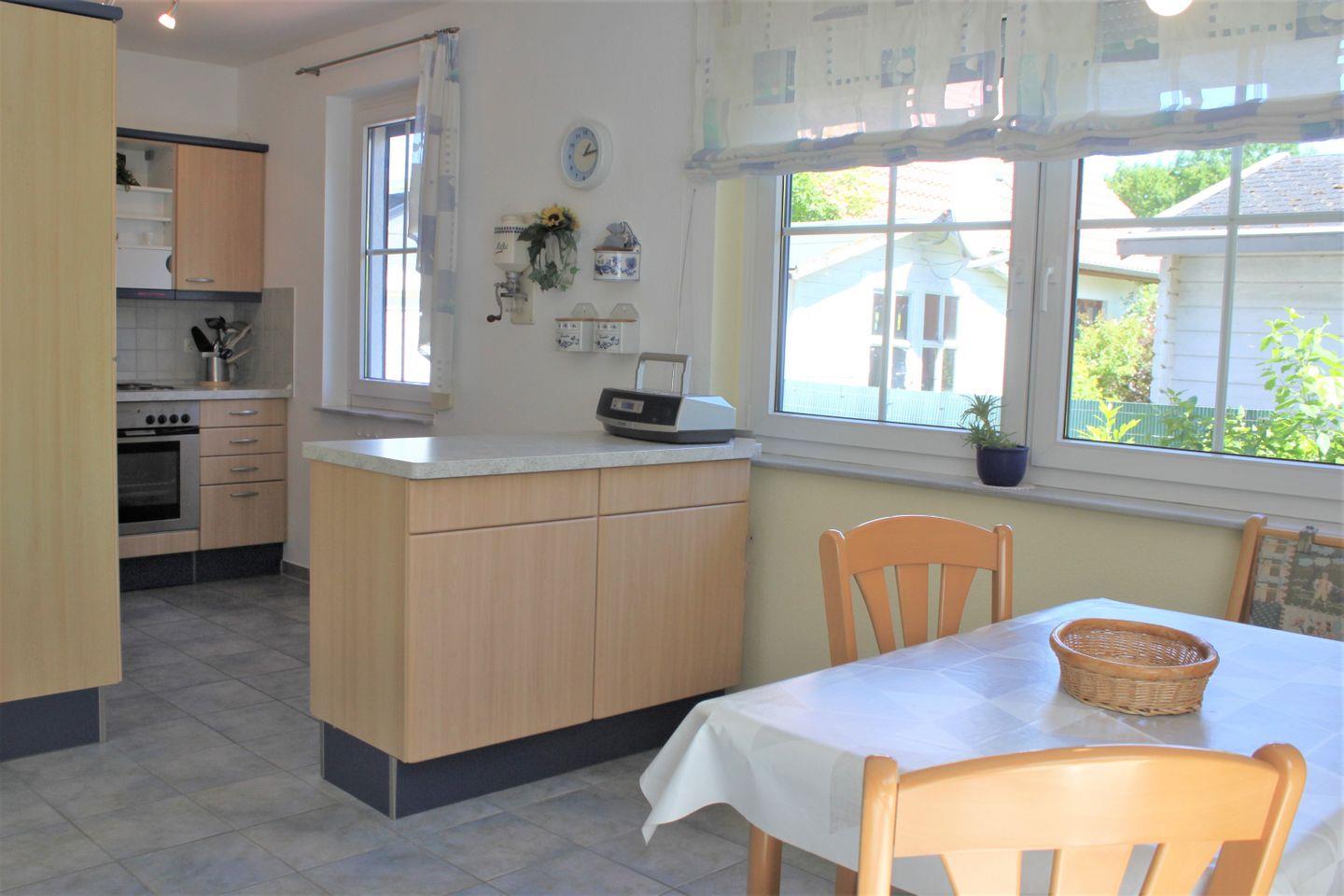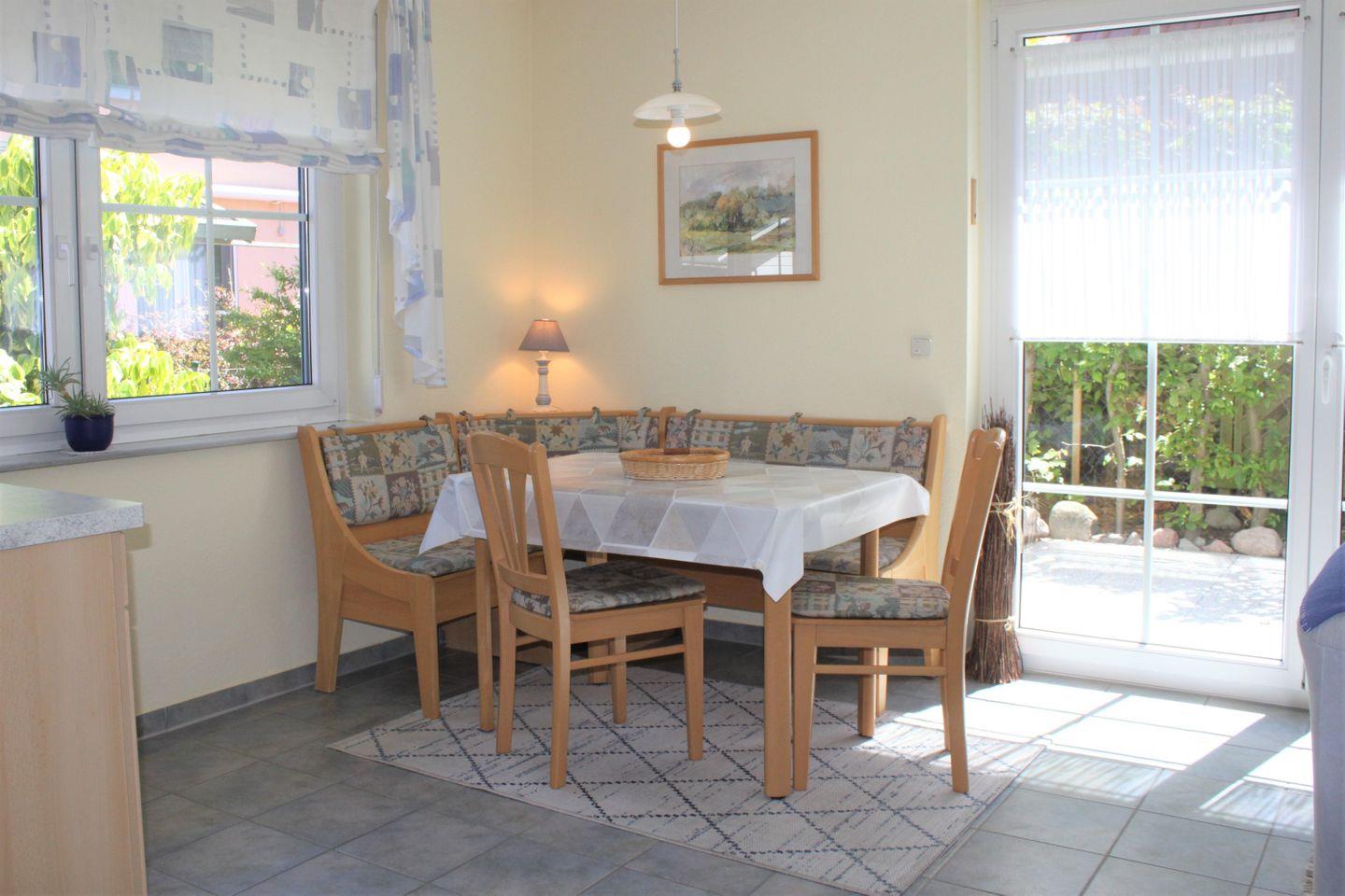 Im angrenzenden Essbereich können Sie an der großzügigen Sitzecke mit Esstisch Ihre Mahlzeiten einnehmen und den erlebten Urlaubstag auswerten. Die integrierte Küche verfügt über einen Kühlschrank mit Gefrierfach, einen Herd mit Backofen, eine Mikrowelle, eine Geschirrspülmaschine, Kaffeemaschine und vielen weiteren technischen Geräten. Die Fenster im Wohnbereich bieten durch die Außenrollläden angenehmen Sichtschutz am Abend.