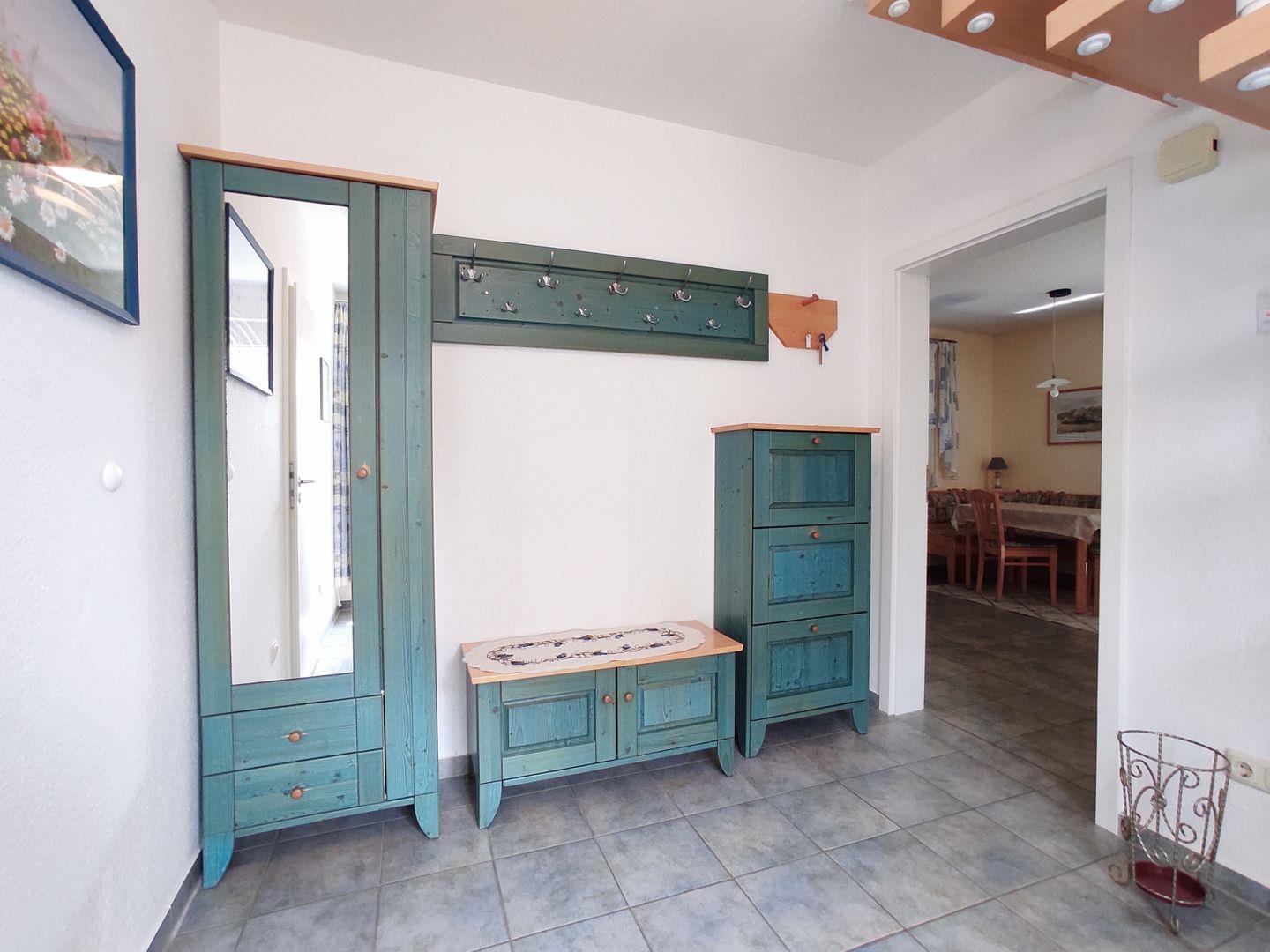 Über den großzügigen Eingangsbereich erreichen Sie den kombinierten Wohn- und Essbereich mit Zugang zu der möblierten Terrasse. Der Wohnbereich ist mit einer komfortablen Sofaecke und einem Flachbild-TV ausgestattet und lädt zu geselligen Stunden ein. Für die kühleren Tage sorgt die Fußbodenheizung im Erdgeschoss für angenehme Wärme und Wohlfühlatmosphäre.