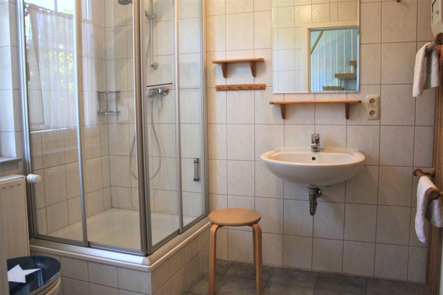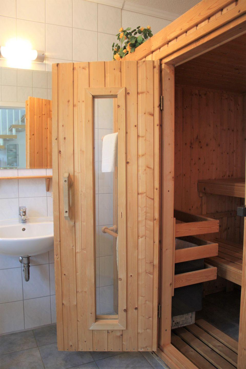 Die untere Etage verfügt außerdem über ein Badezimmer mit Tageslicht und ist mit einer Dusche, einem Waschtisch, WC und einer Sauna ausgestattet. Hier können Sie ausgiebig relaxen und Kraft tanken.