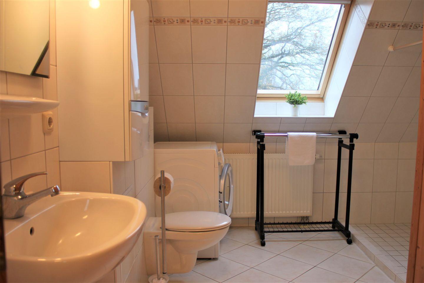 Das Badezimmer mit Fenster ist mit einer Dusche, einem Waschtisch, einem WC, einer Waschmaschine und einer Sauna ausgestattet, die für Entspannung sorgt.
