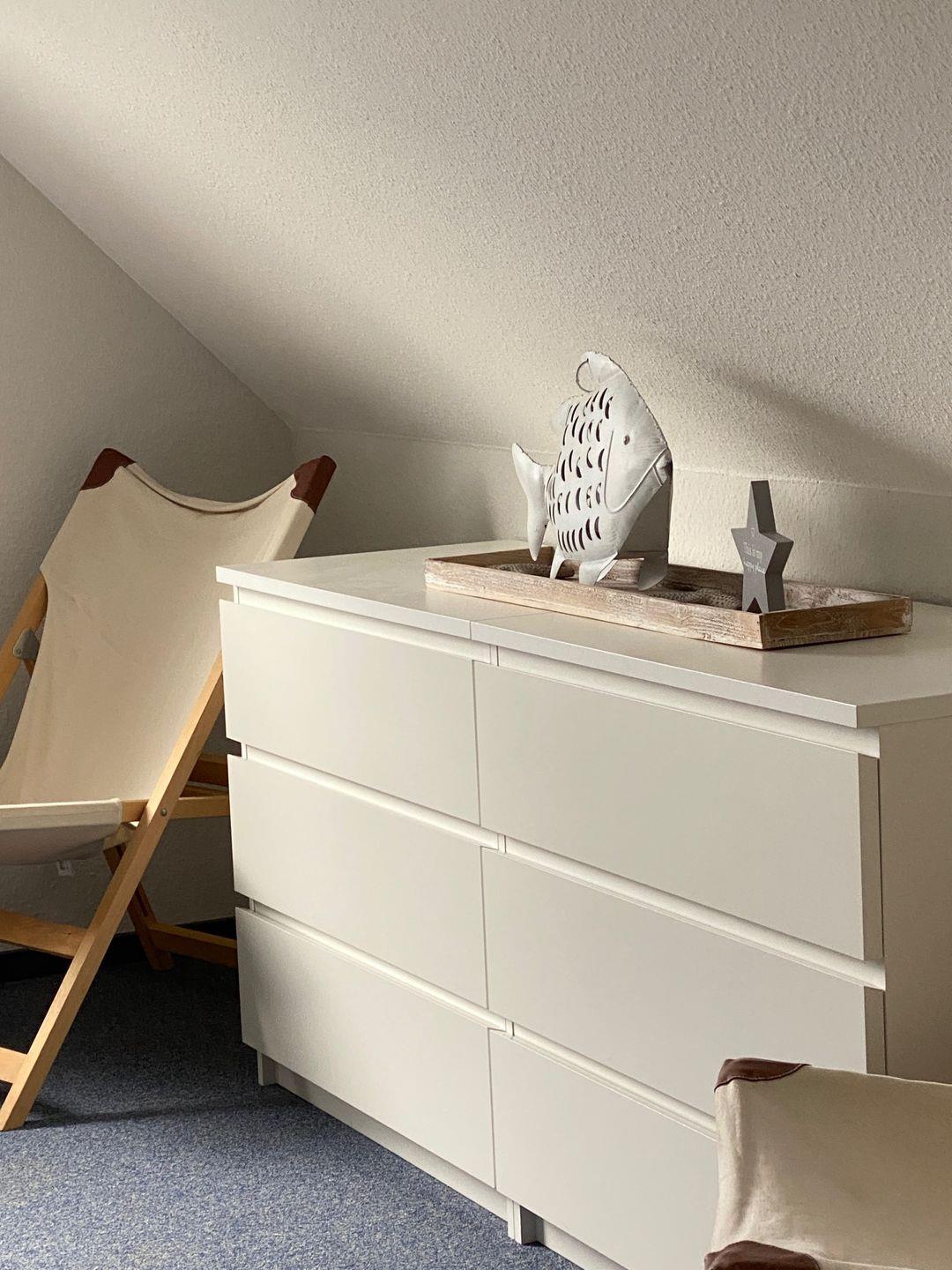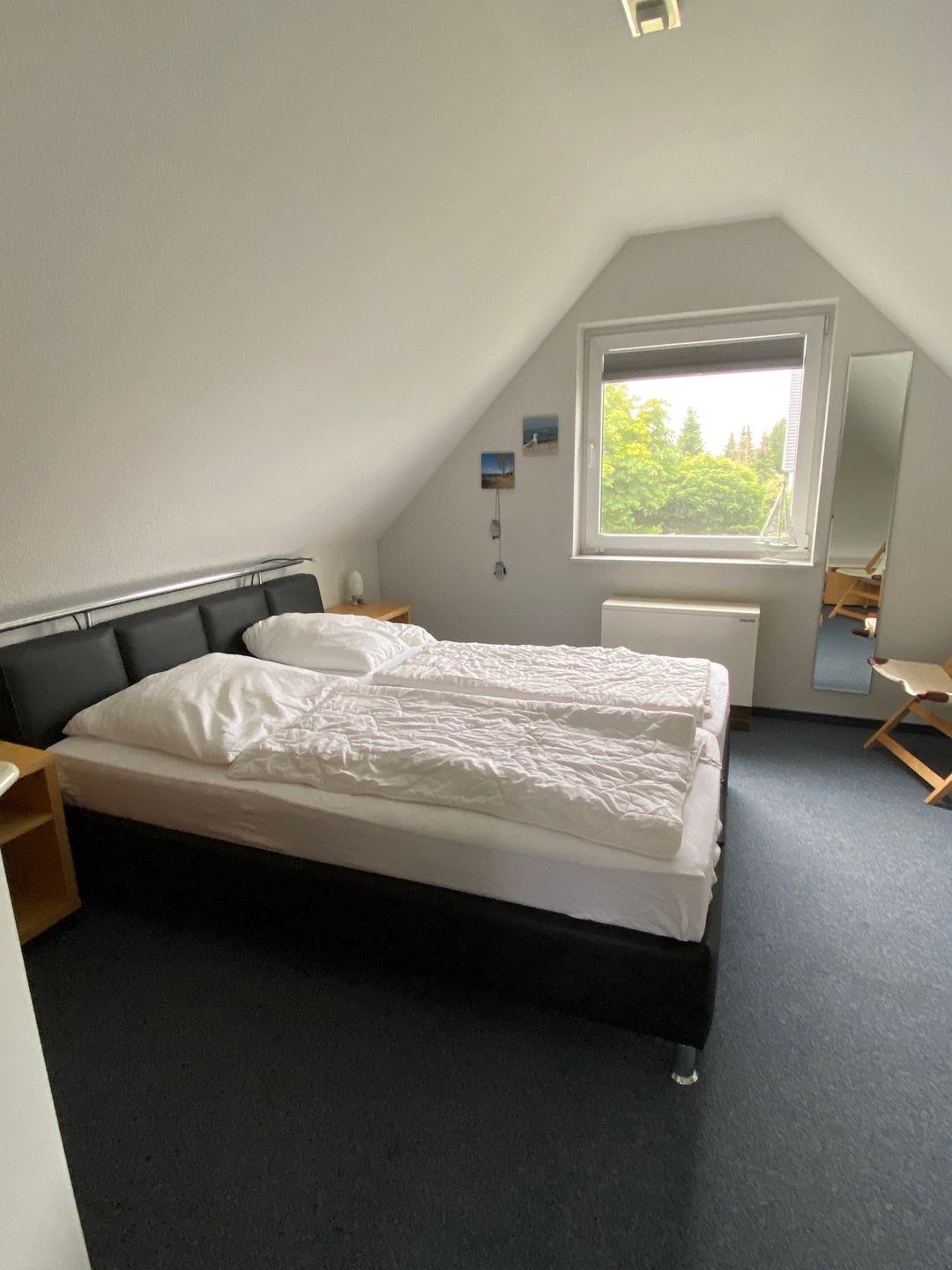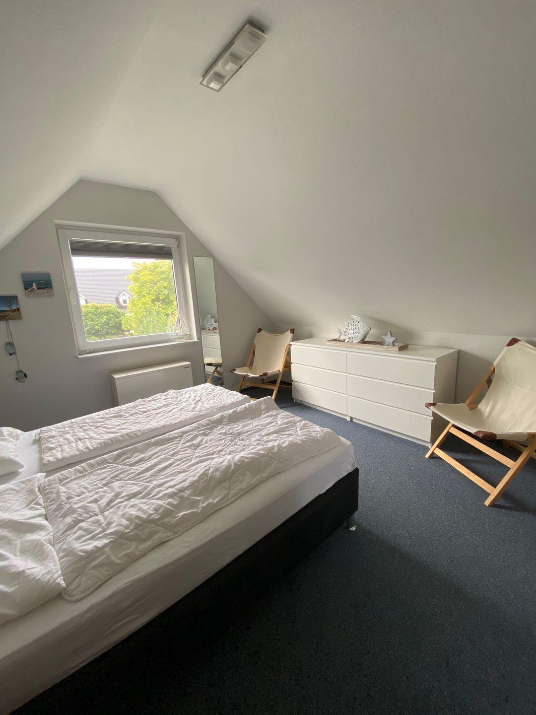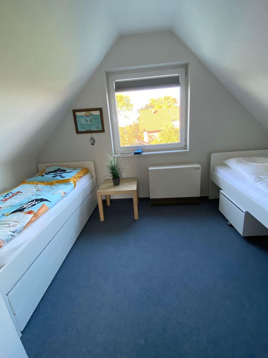 In der oberen Etage befinden sich die beiden liebevoll eingerichteten Schlafzimmer, die entweder über ein Doppelbett oder zwei Einzelbetten verfügen. Ein Einzelbett verfügt über eine Ausziehfunktion, die einer weiteren Person einen bequemen Schlafplatz bietet. In beiden Räumen finden Sie ausreichend Ablagefläche für Ihre Garderobe und Verdunklungsmöglichkeiten für einen erholsamen Schlaf.
