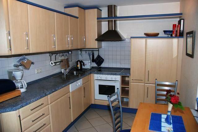 Angrenzend an das Wohnzimmer befindet sich die separate Küche, die mit allen notwendigen technischen Geräten, wie Herd mit Backofen, Kühlschrank mit Gefrierfach, Geschirrspülmaschine, Kaffeemaschine und vielem mehr ausgestattet ist.