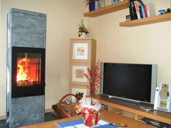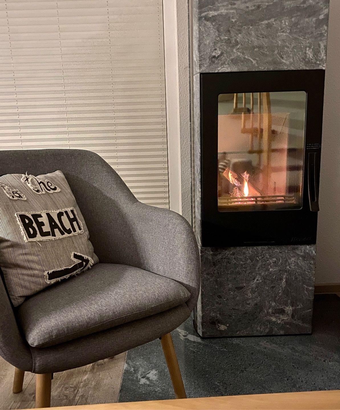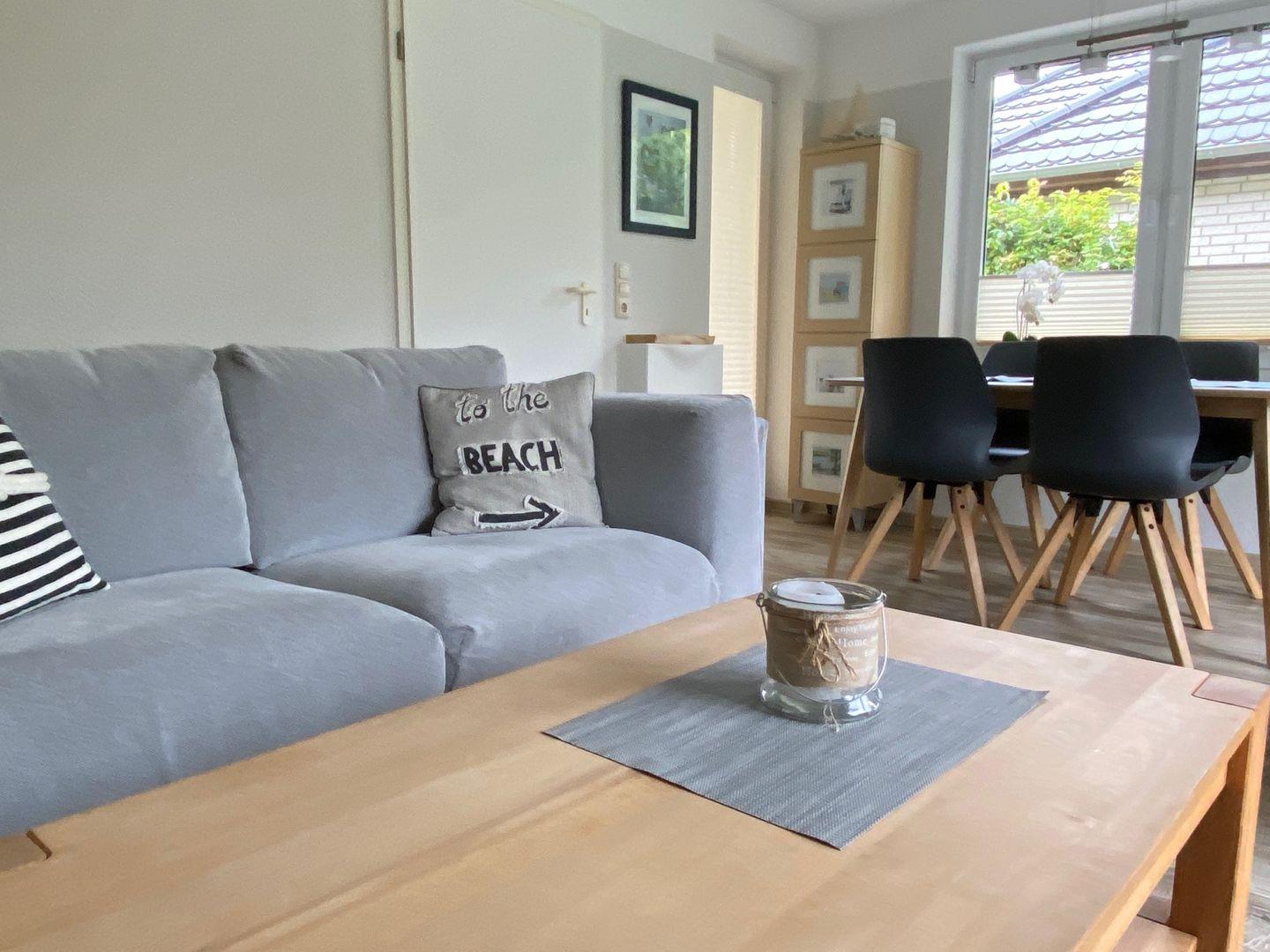 Der helle und offen gestaltete Wohn- und Essbereich ist stilvoll mit einem komfortablem Sofa, TV-Gerät und Esstisch eingerichtet. An den kühleren Tagen sorgt ein Kamin für wohlige Wärme und Gemütlichkeit. Über eine Terrassentür gelangen Sie auf die überdachte Terrasse mit Sitzgelegenheiten und Blick in den großzügigen Garten, der zum Sonnenbaden, Relaxen und geselligen Grillabenden einlädt.