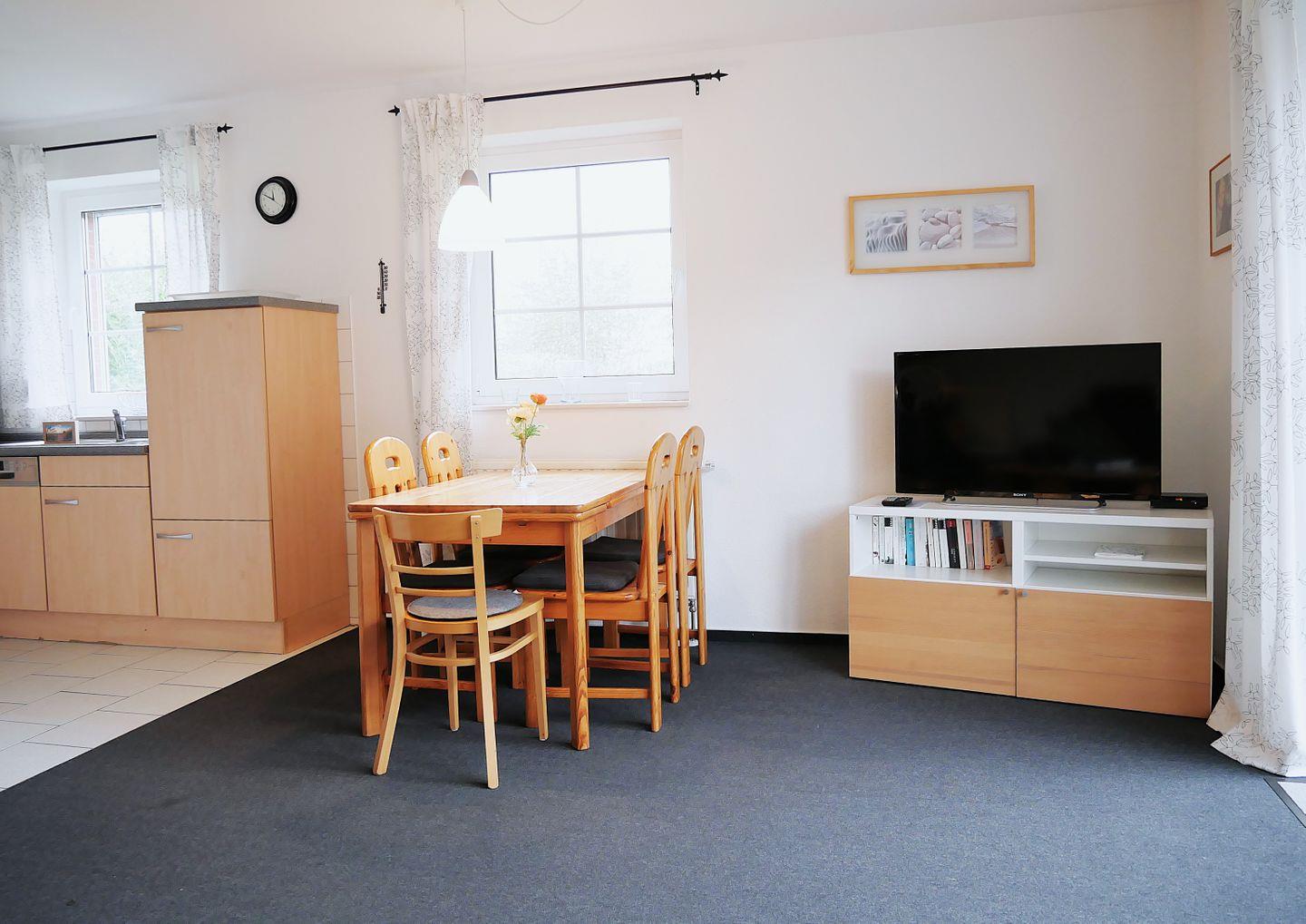 Der helle und offen gestaltete Wohn- und Essbereich ist über den Flur erreichbar und bietet Ihnen neben einem gemütlichen Sofa, welches zu einem Schlafsofa für 2 Personen umgewandelt werden kann auch ein TV-Gerät und den Zugang zu der möblierten Terrasse. Die in den Wohnbereich integrierte Küche verfügt über alle notwendigen technischen Geräte, wie z.B. Kühlschrank mit Gefrierfach, Herd mit Backofen, Geschirrspülmaschine, Kaffeemaschine und Wasserkocher und bietet somit gute Möglichkeiten für einen geselligen Kochabend. Am angrenzenden Esstisch können Sie Ihre zubereiteten Mahlzeiten entspannt genießen.