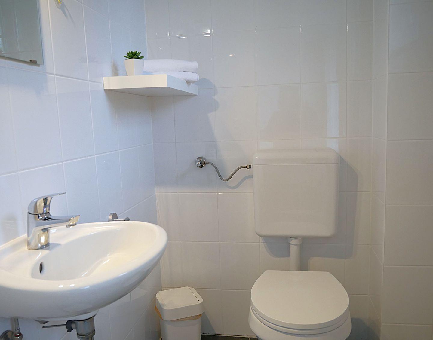 Das Tageslichtbadezimmer befindet sich ebenfalls in der oberen Etage und ist mit einer Dusche, Waschtisch und WC ausgestattet.