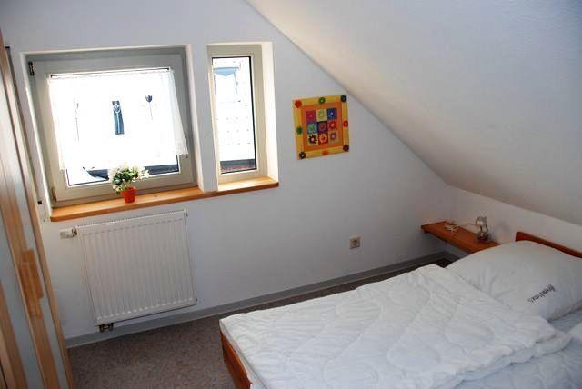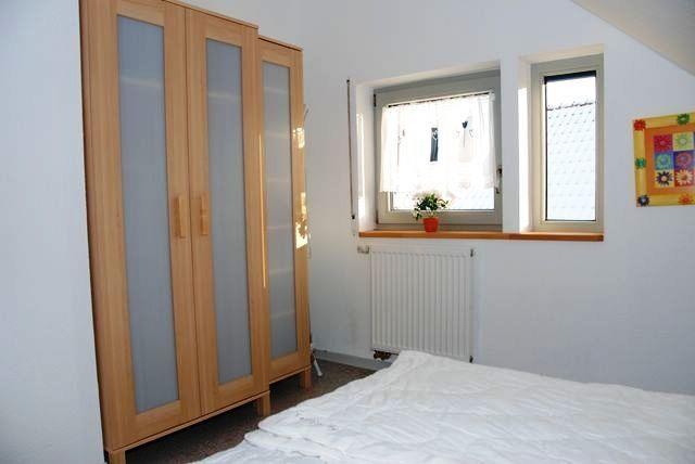 Über eine Treppe gelangen Sie in das Obergeschoss des Hauses. Hier befinden sich die zwei weiteren Schlafräume, die entweder mit einem Doppelbett oder zwei Einzelbetten und jeweils Stauraum für Ihre Garderobe möbliert sind. Für die Kleinsten gibt es Spielzeug, Bücher und einen Hochstuhl.