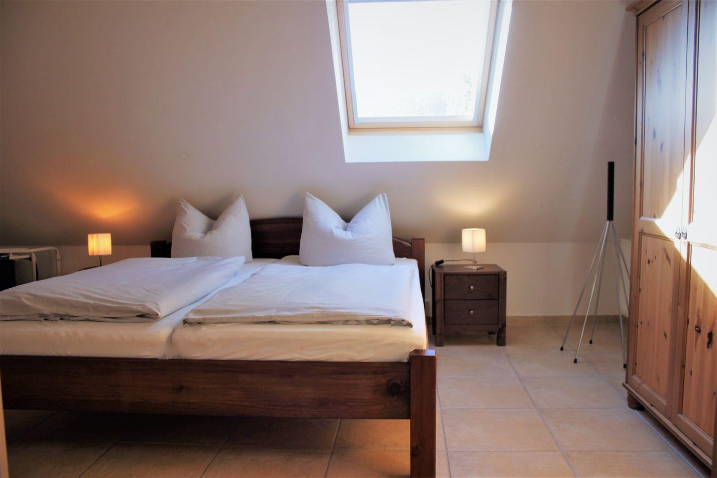 Das angrenzende Schlafzimmer ist mit einem Doppelbett, Kleiderschrank und einer Infrarotkabine und Sauna ausgestattet.