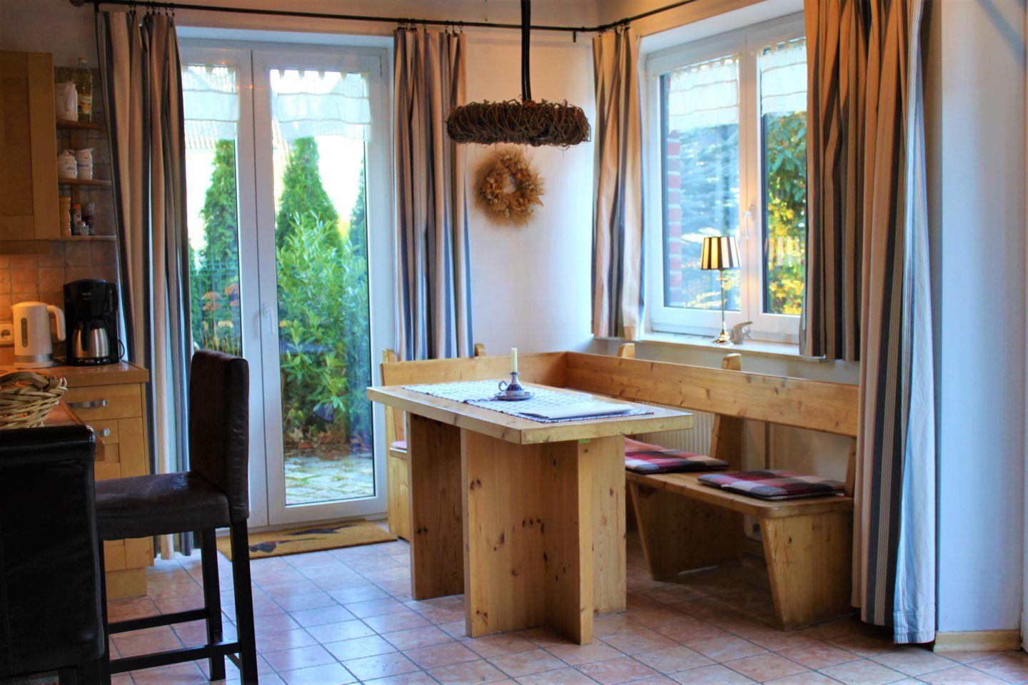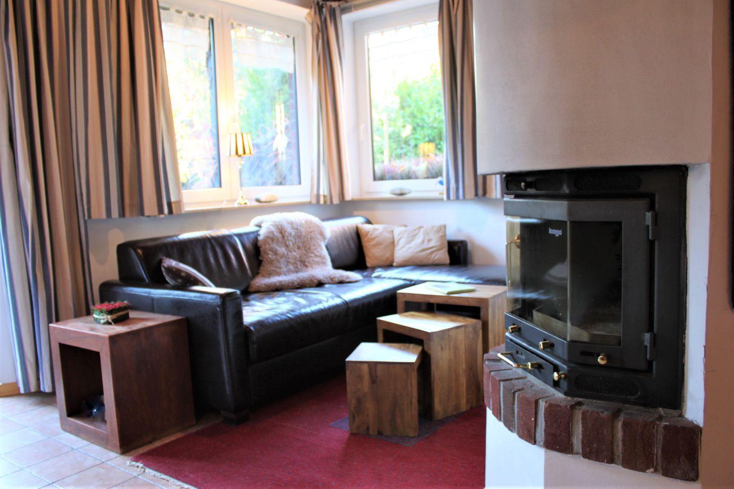 Das großzügige Wohnzimmer ist kombiniert eingerichtet und bietet Ihnen eine Sofaecke mit Kamin, WLAN, eine Essecke und die integrierte Küche mit Kochinsel, die gut ausgestattet ist. Außerdem befindet sich hier der Zugang zur möblierten Terrasse mit Garten, wo Sie Ruhe und Entspannung finden.