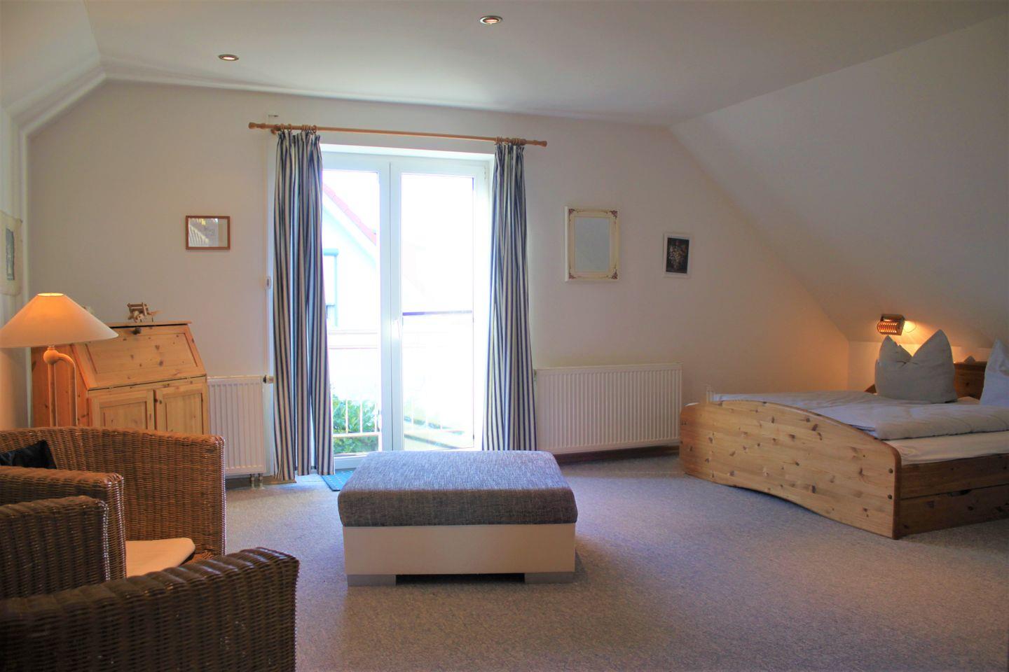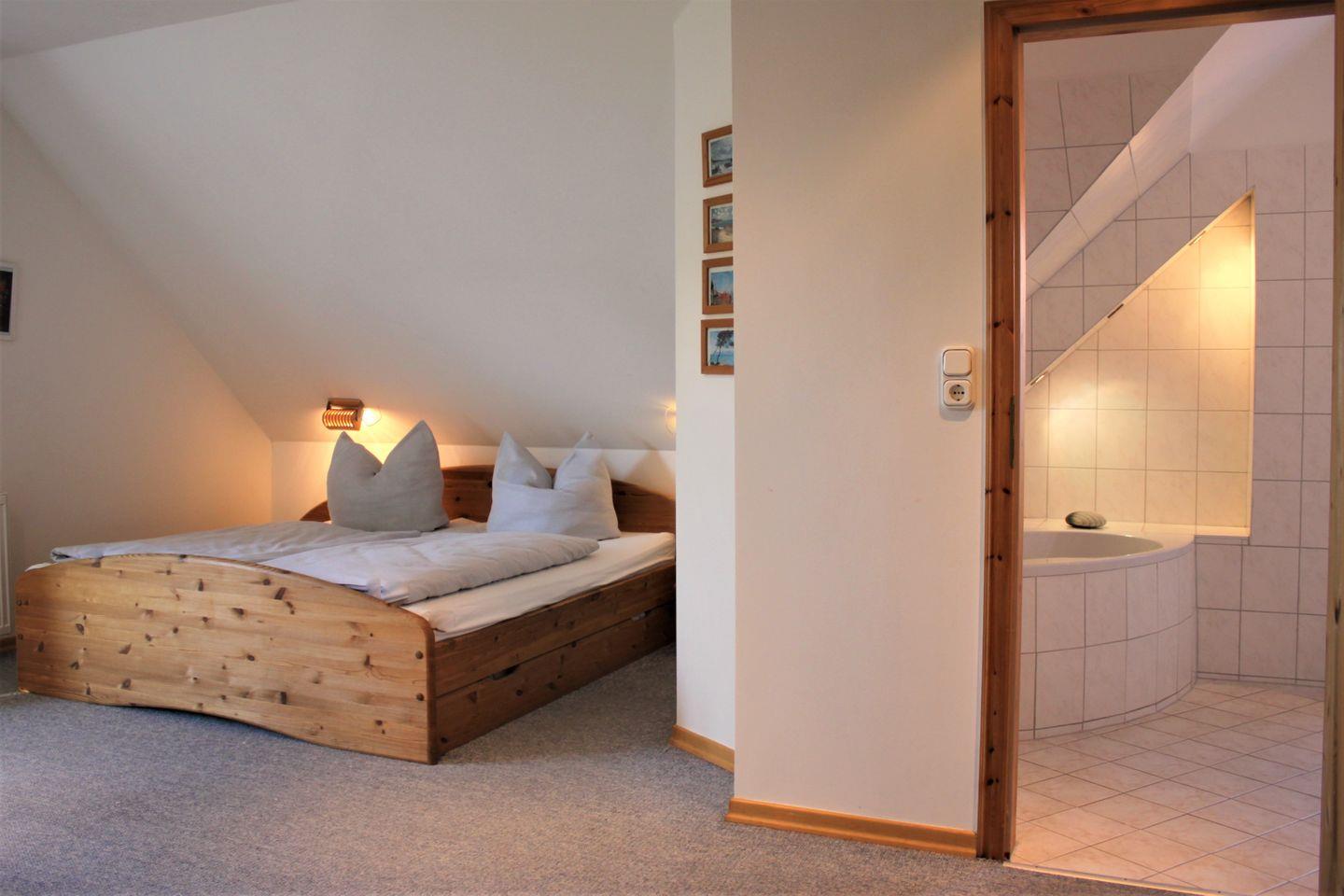 Über eine Treppe gelangen Sie in das Obergeschoss der Wohnung. Hier stehen Ihnen unter anderem die zwei separaten Schlafzimmer zur Verfügung. Beide Räume sind mit einem Doppelbett (1x durchgehende Matratze), Stauraum für die Garderobe und jeweils einem eigenen Balkon ausgestattet. Ein Schlafzimmer verfügt zusätzlich über ein eigenes Badezimmer mit Badewanne, Waschtisch und WC. Im zweiten Schlafzimmer steht ein weiteres Klappsofa als Schlafplatz für die 5. Person zur Verfügung.