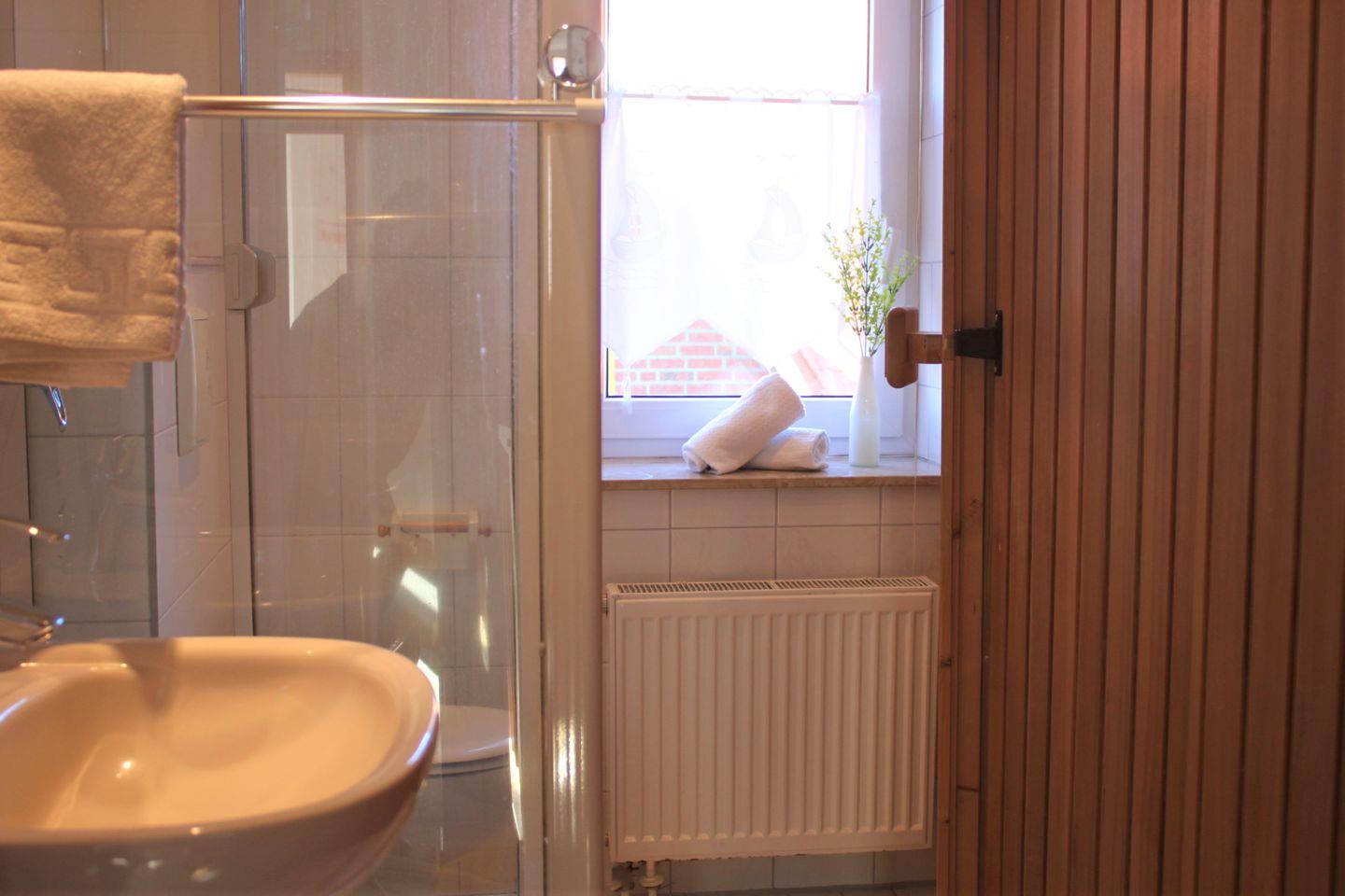 Die obere Etage bietet Ihnen außerdem ein weiteres Badezimmer mit Sauna, Dusche, Waschtisch und WC. Ein zusätzliches Gäste-WC mit Waschmaschine im Erdgeschoss runden die Ausstattung der Wohnung ab.