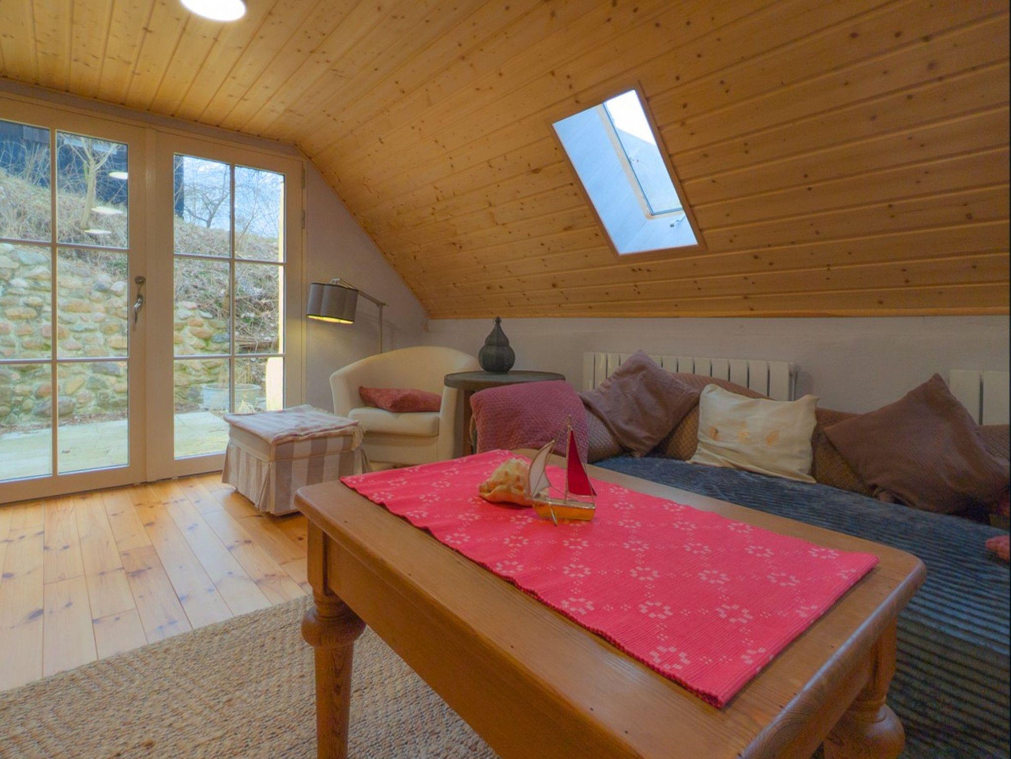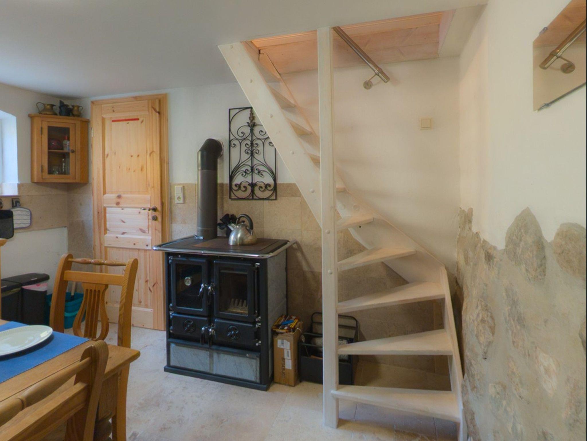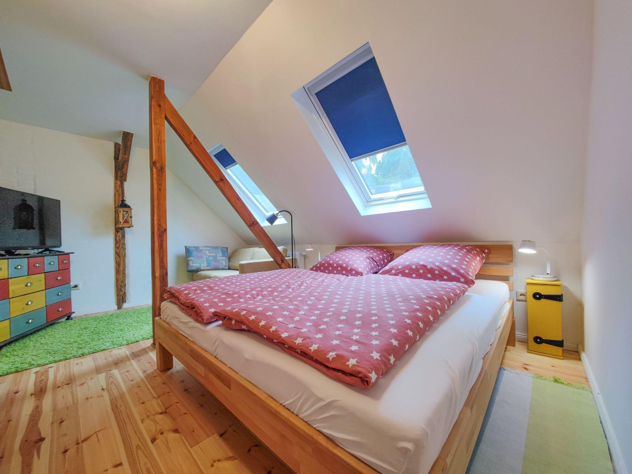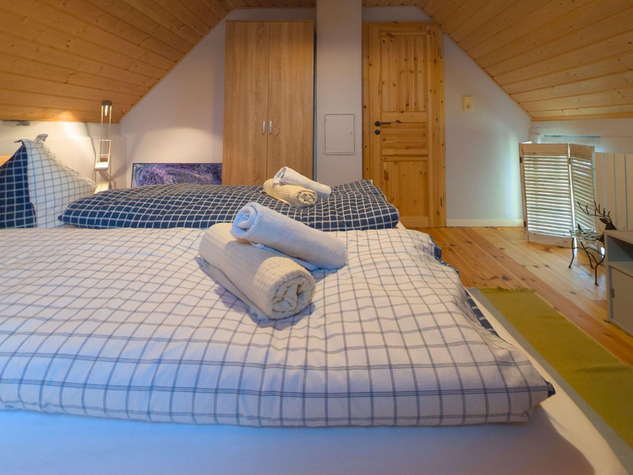 Das zweite Häuschen, „Antons Remise“, liegt hinter „Ellas Gehöft“ und überzeugt durch ebenso viel Charme. Im Erdgeschoss finden Sie eine gut ausgestattete Küche, ein Wohnzimmer mit Kachelofen und ein Badezimmer mit Dusche und WC. Auch hier führt eine steilere Treppe ins Obergeschoss, wo sich zwei Schlafzimmer mit Doppelbetten befinden.