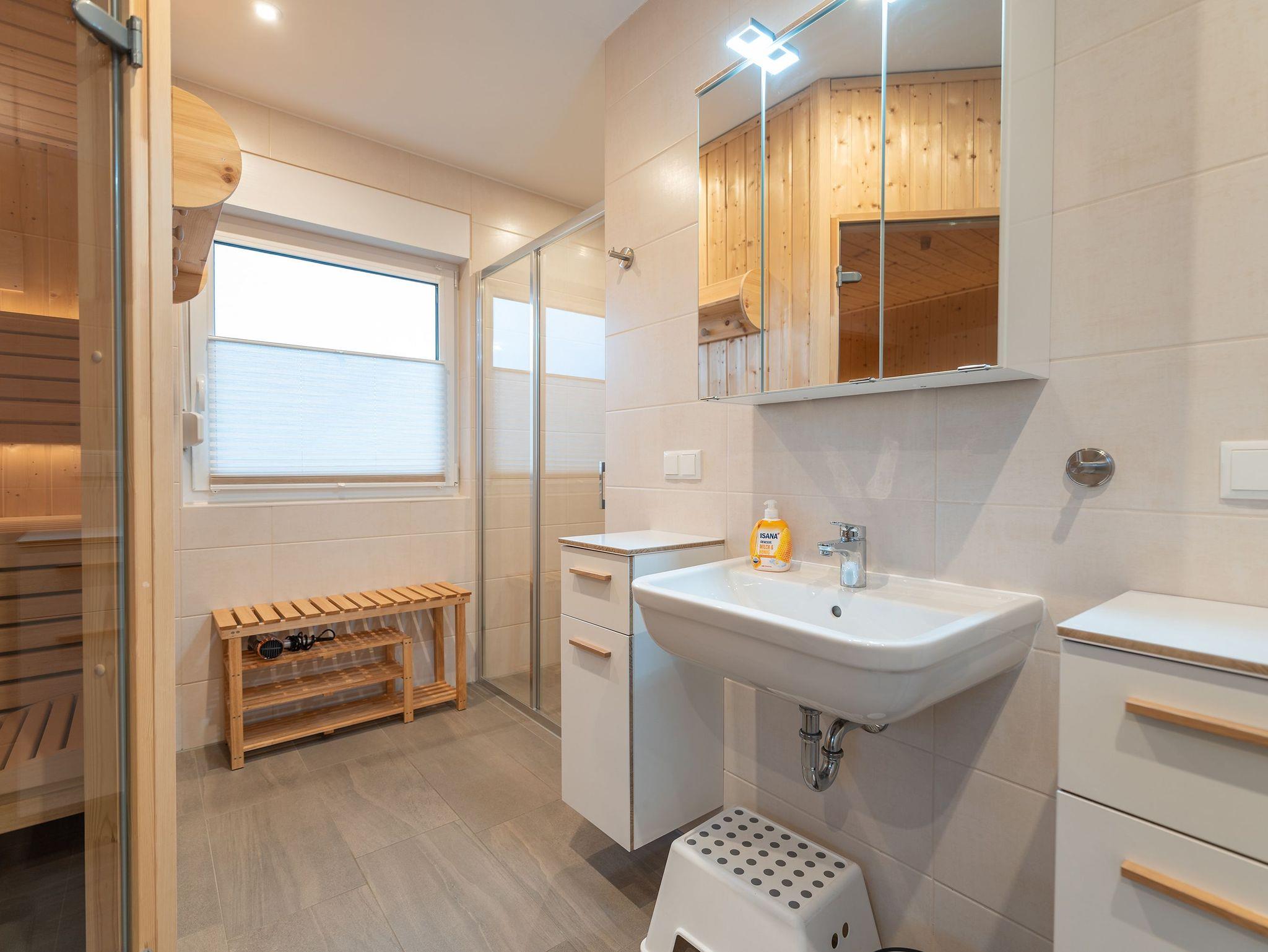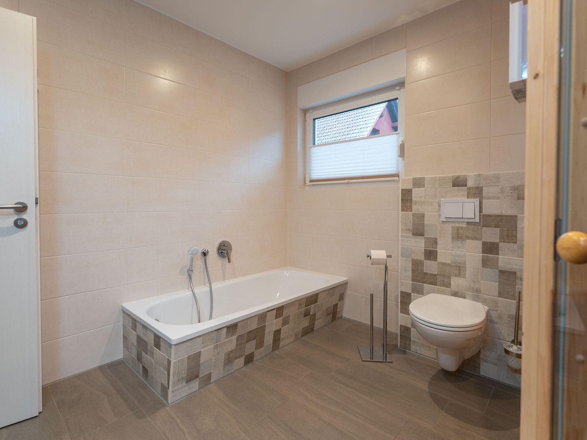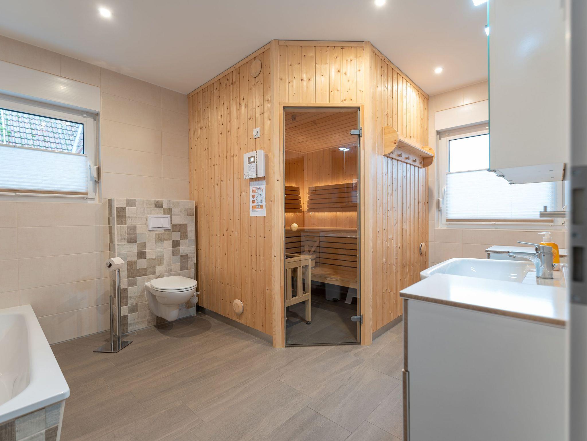 • großes Badezimmer mit Badewanne, Dusche und Sauna
