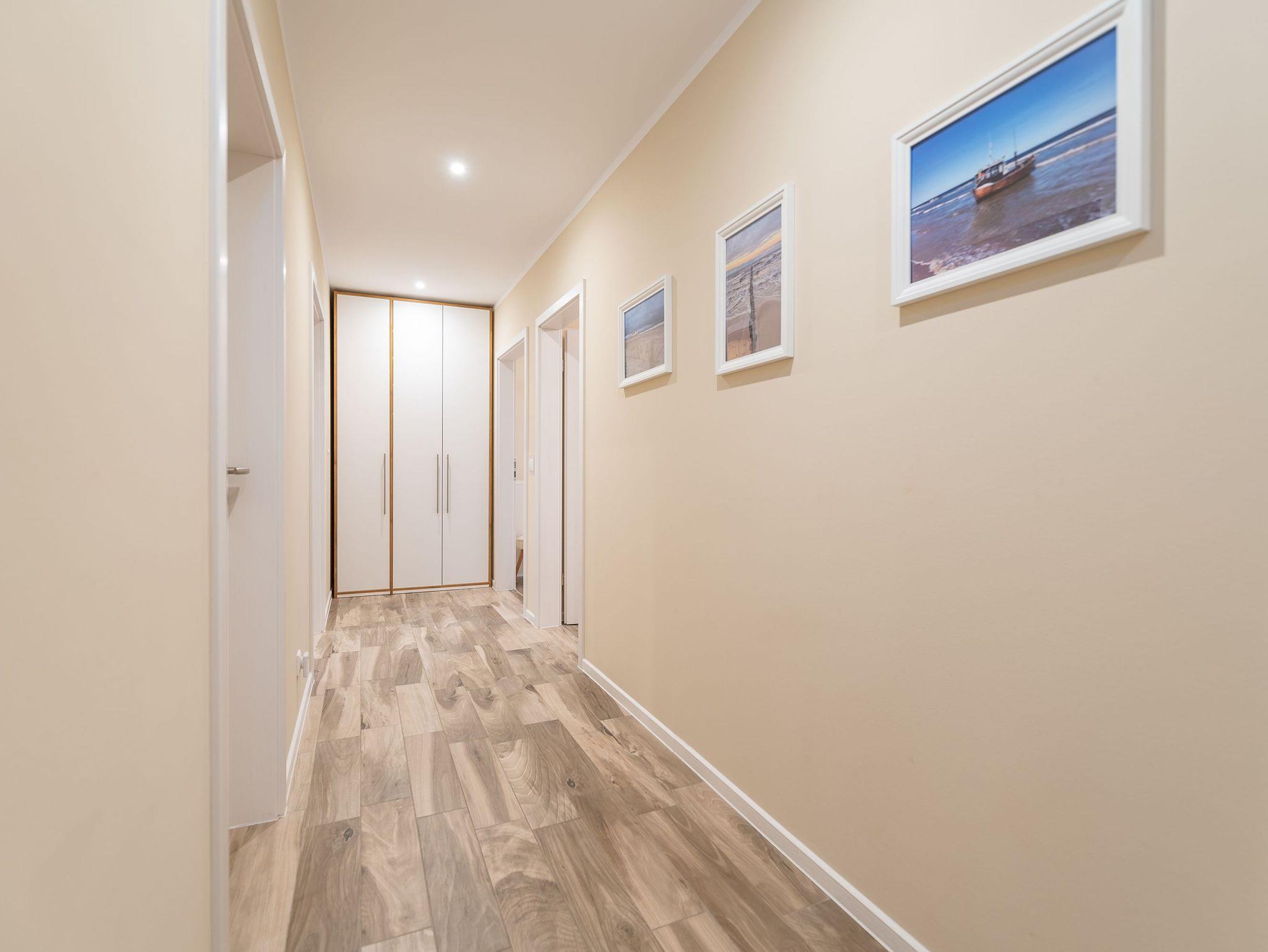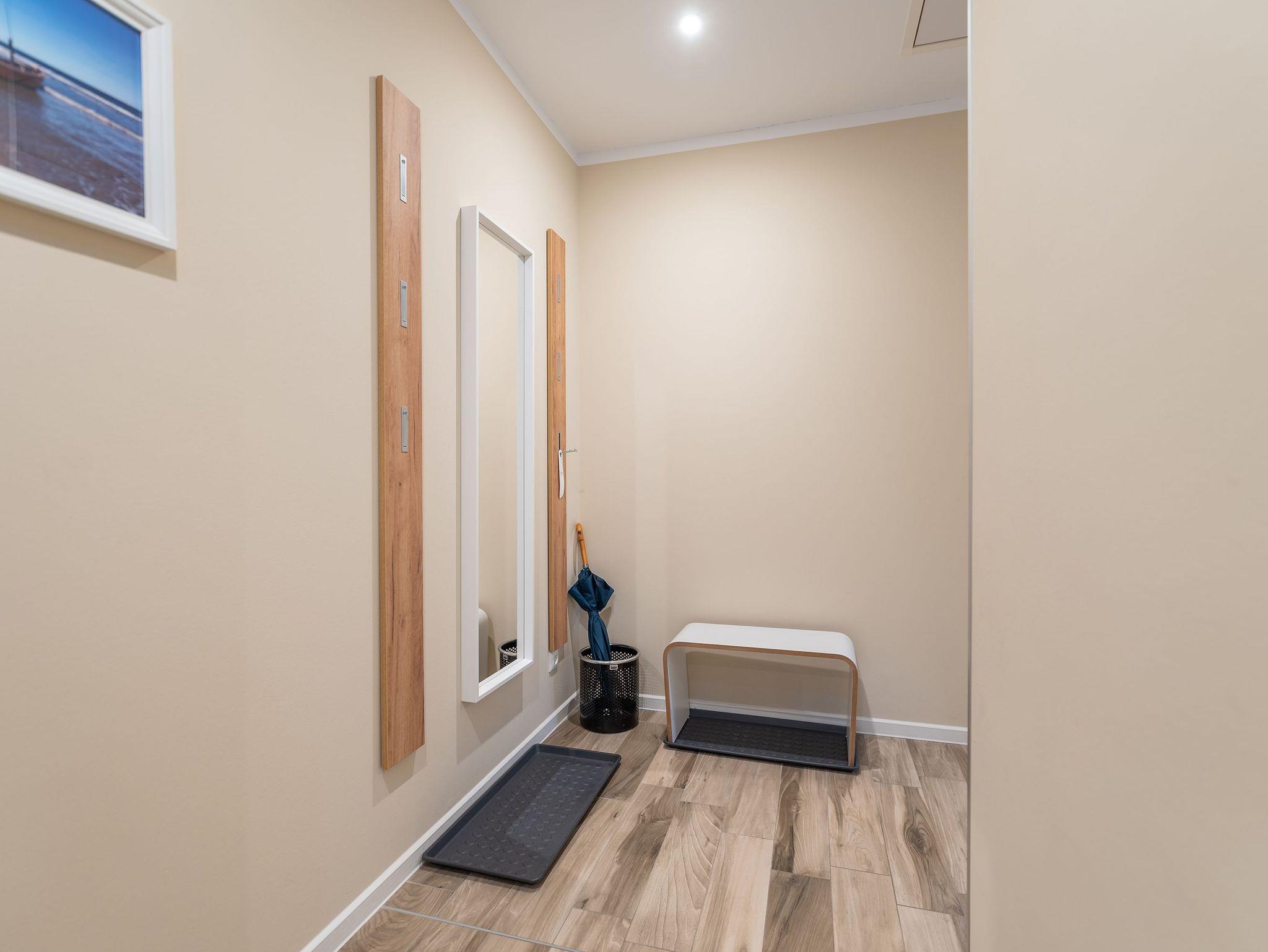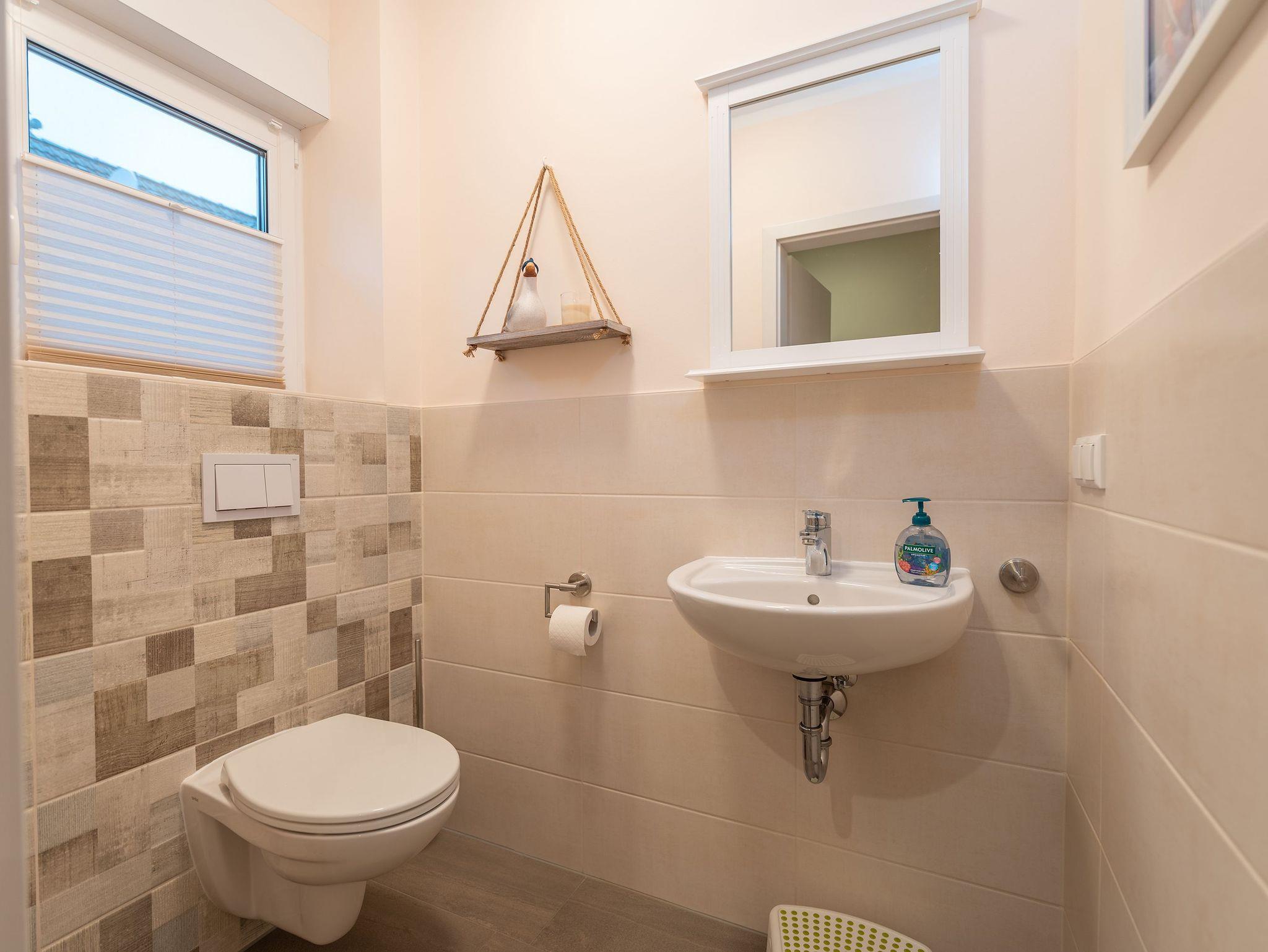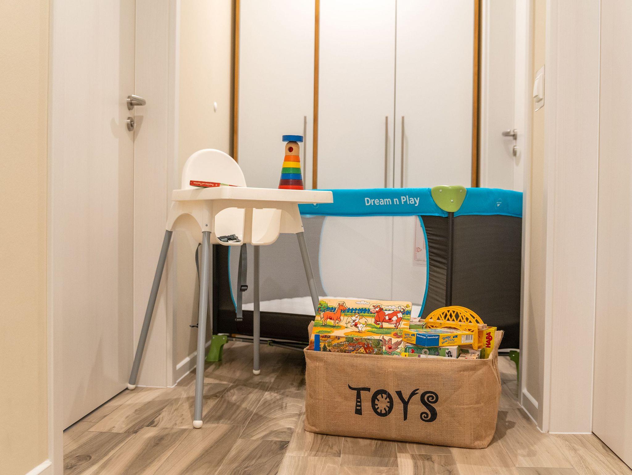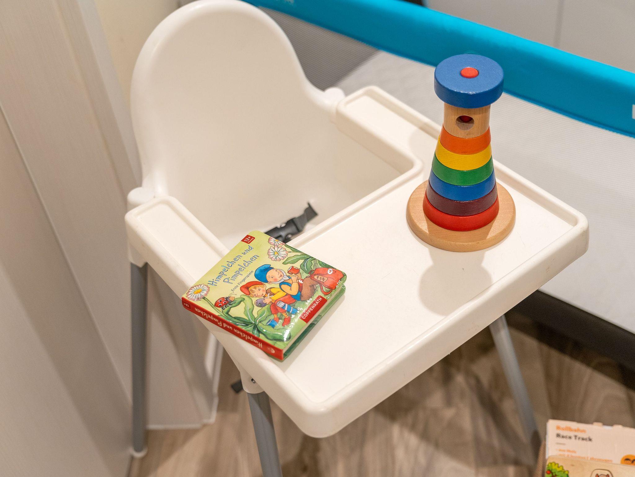 Das Gäste-WC verfügt über eine Toilette und einen Waschtisch mit Spiegel, während das große Badezimmer mit einer Badewanne, einer Regendusche, einem Waschtisch mit Spiegelschrank und der Sauna ausgestattet ist. Für die kleinsten Gäste können auf Anfrage ein Reisebett mit Matratze, ein Hochstuhl sowie eine Spielzeugkiste und Strandspielzeug bereitgestellt werden.