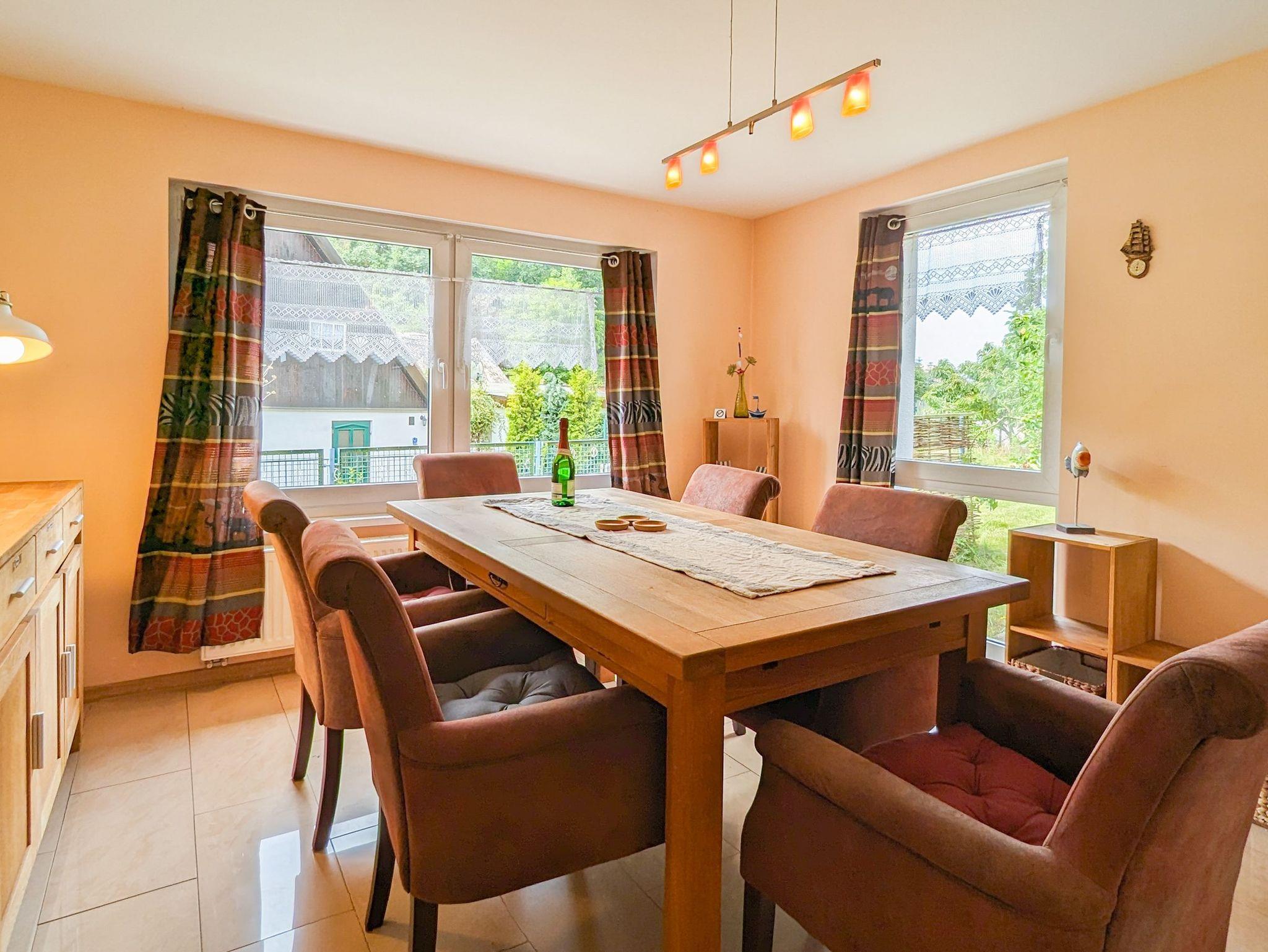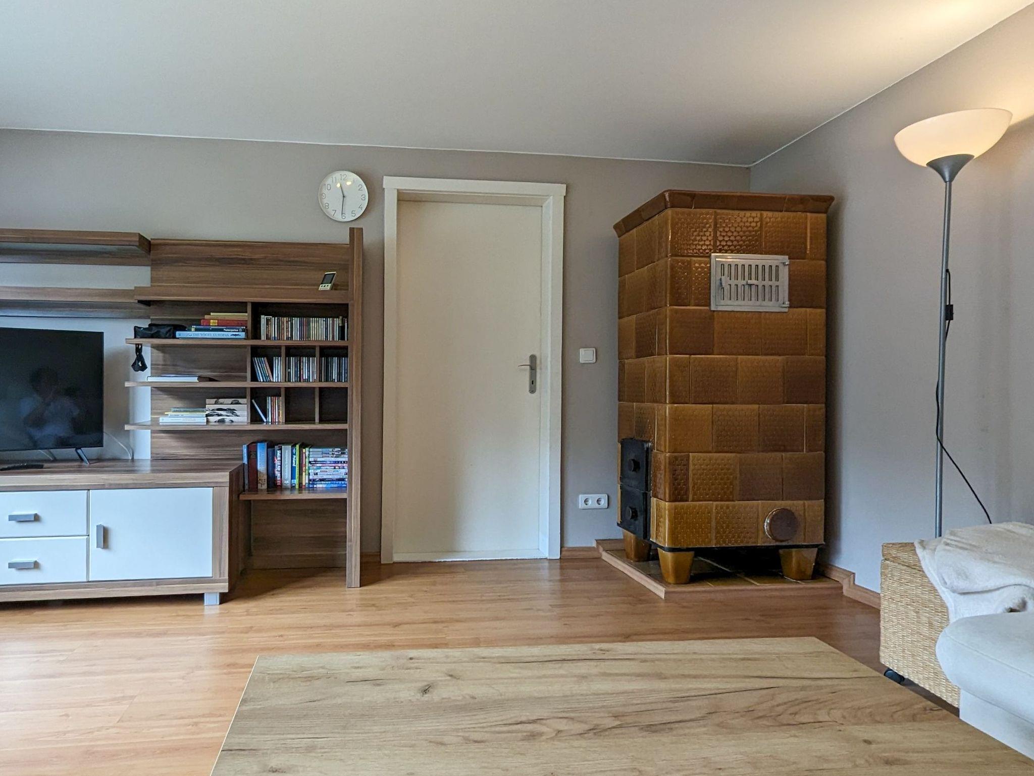 Für kühlere Abende steht im Wohnzimmer ein Kachelofen zur Nutzung bereit. Im Esszimmer gibt es keinen Kamin.