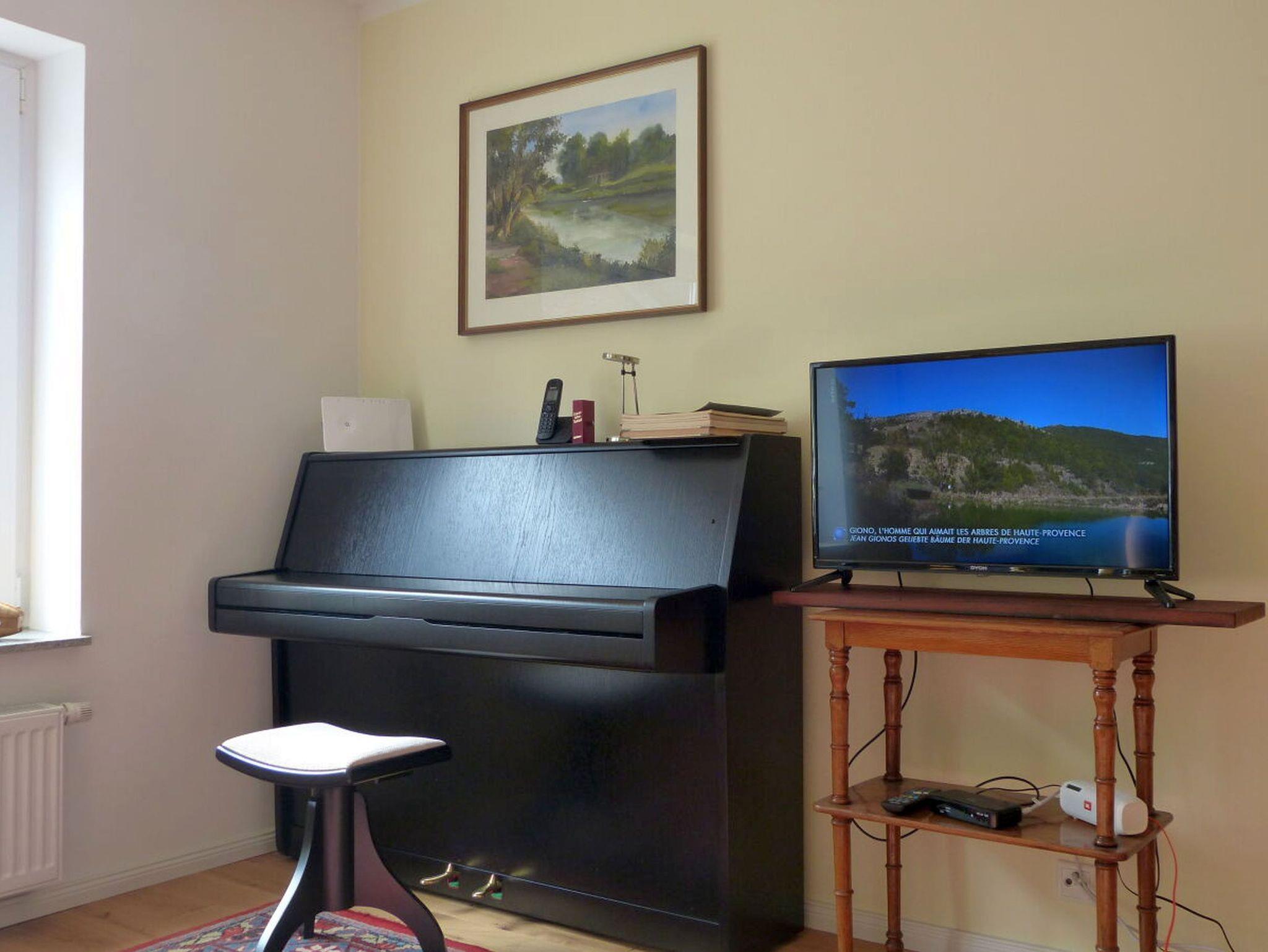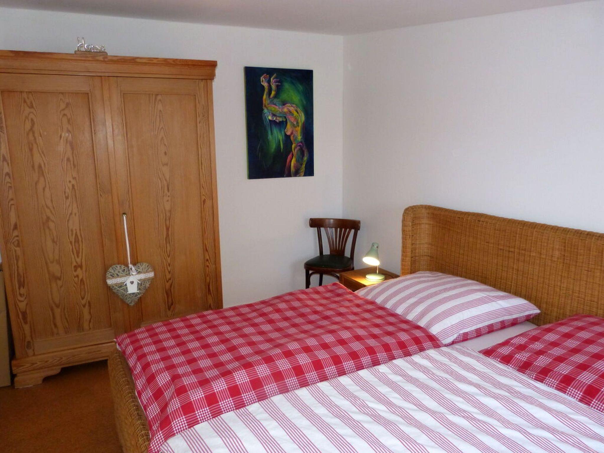 Bis zu 3 Personen finden ausreichend Platz mit einem Schlafzimmer mit Doppelbett und einem Schlafsofa im Wohnzimmer. Die Küche ist mit allem notwendigen ausgestattet und verfügt neben dem Essbereich über einen nostalgischen Ofen.