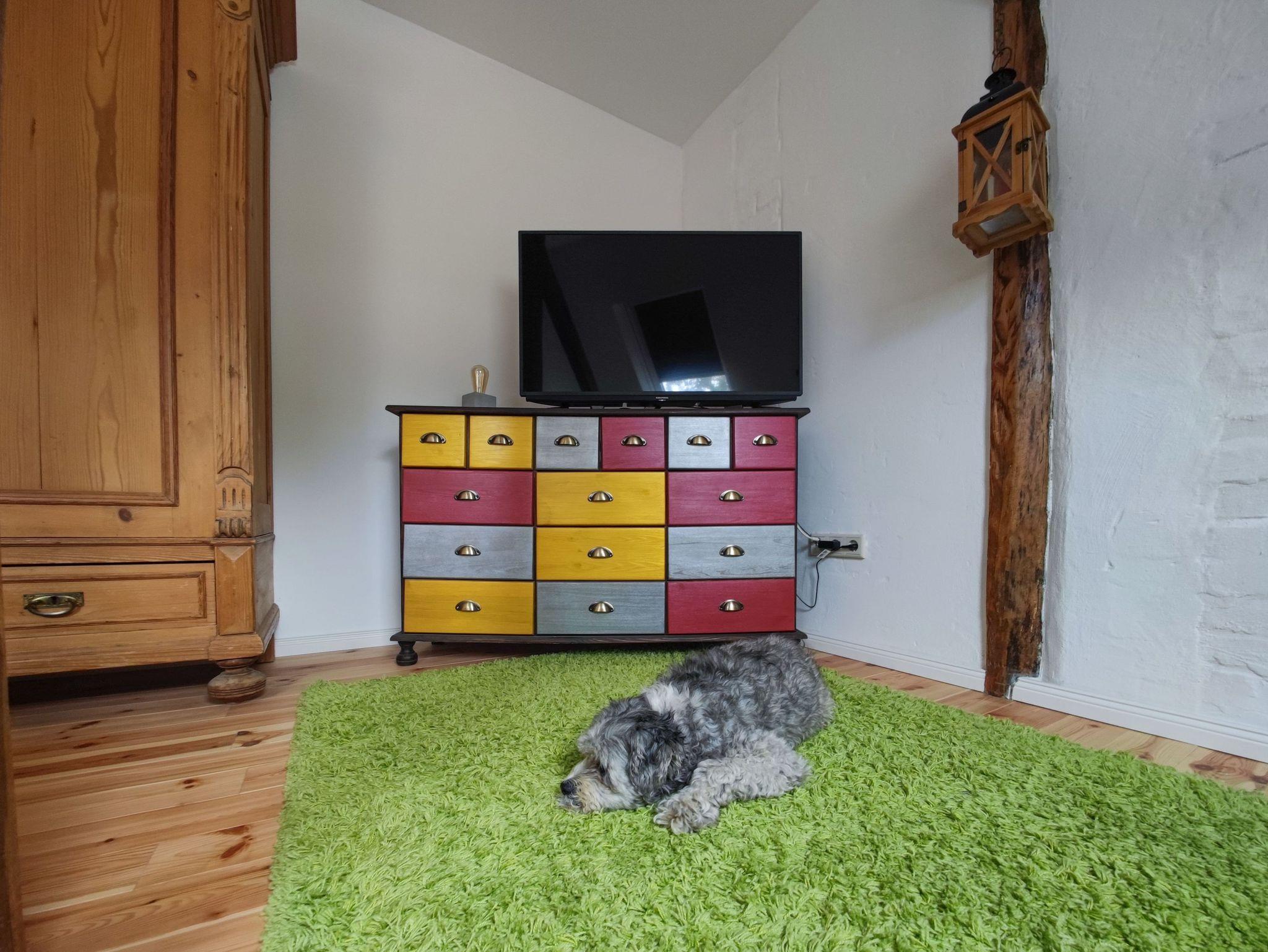 Im Erdgeschoss erwartet Sie eine voll ausgestattete Küche mit rustikalem Kochofen, ein behagliches Wohnzimmer mit Kachelofen und ein Badezimmer mit Dusche, WC sowie Waschmaschine. Eine steile Holztreppe (bitte beachten Sie, dass diese nicht für Kleinkinder geeignet ist) führt in das Obergeschoss, wo sich zwei Schlafzimmer mit jeweils einem Doppelbett und ein weiteres Badezimmer mit Dusche und WC befinden.