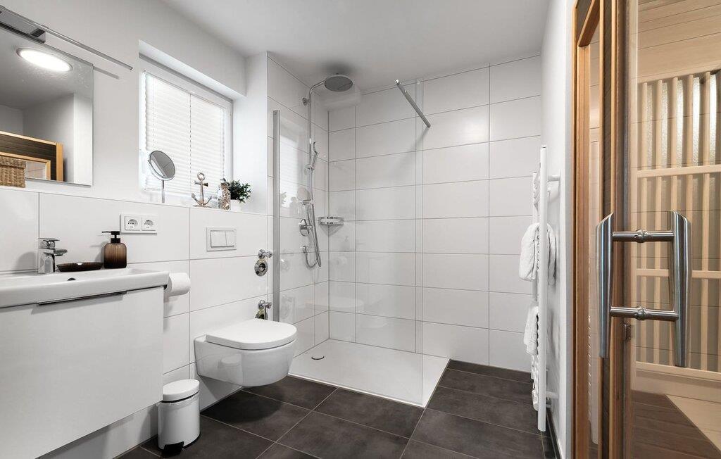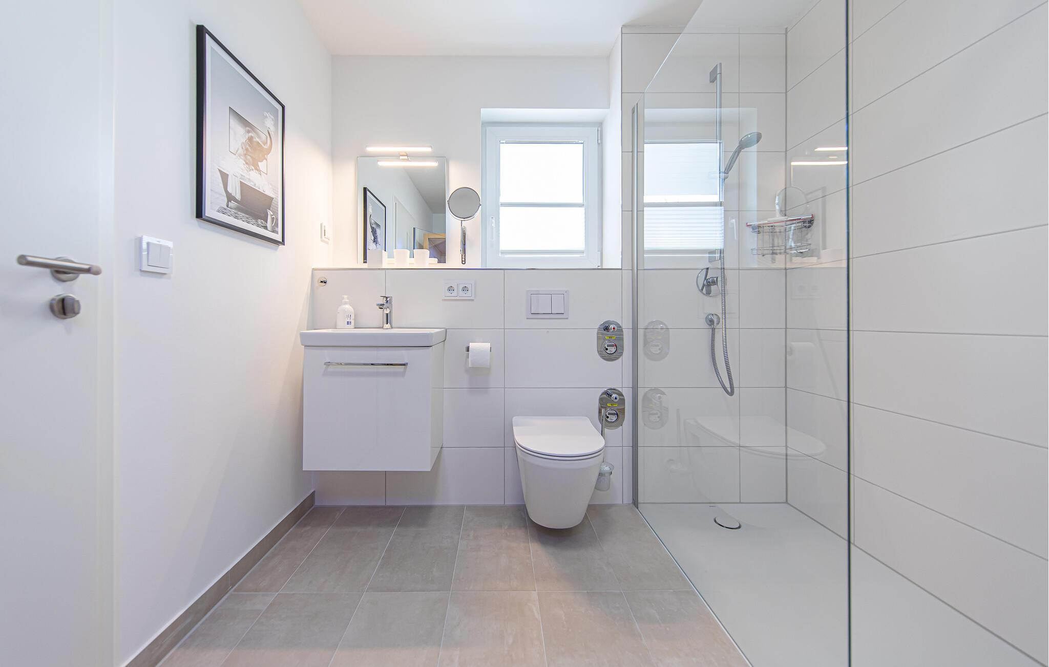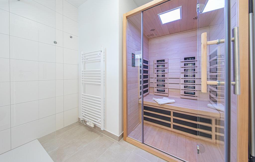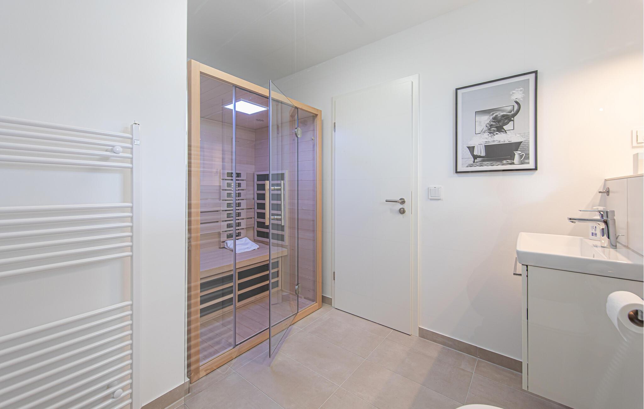 Das Badezimmer im Kap Horn ist ein kleiner Wellness Tempel. Ausgestattet ist dieser mit einer bodengleichen Dusche, einer Fußbodenheizung sowie einer Infrarotsauna zum Aufwärmen und Genießen.
