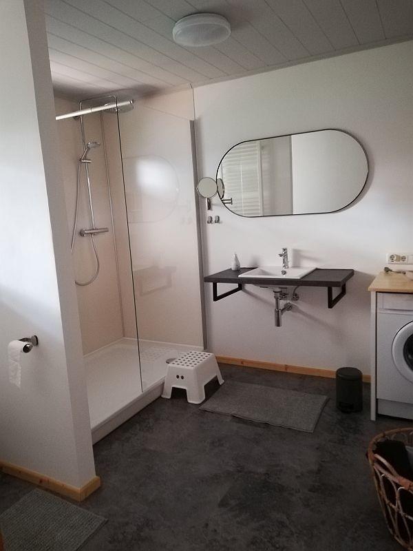 Die im nordischen Stil modern und mit viel Liebe zum Detail eingerichtete Ferienwohnung verfügt über zwei Schlafräume mit je zwei bezogenen Betten (ein Doppelbett und zwei Einzelbetten mit einer Erweiterungsmöglichkeit). Das Duschbad bietet neben einer Waschmaschine modernen Komfort wie z. B. Handtücher, Badetücher, eine großzügige Regendusche und Fußbodenheizung. Der große Wohnraum ist in mehrere Abteilungen unterteilt. Es gibt einen gemütlichen Wohnbereich mit großem Fernseher und einer modernen Musikanlage sowie einen offenen Küchenbereich mit Geschirrspüler, Ofen, Induktionsherd, einem Kaffeevollautomaten und geschmackvollem weißem Geschirr. Ein Kamin ist ebenso vorhanden wie auch ein uriger Essplatz mit einer großen Bank im Fenster an einem alten Backtisch. Das Kaminholz liegt für Sie bereit. An sonnigen Tagen kann man das Frühstück auf dem geschützten Holzdeck einnehmen und an kühleren Abenden lädt ein schöner runder Tisch im großen Wintergarten direkt unter der riesigen, japanischen Kirsche zum Plauschen oder gemeinsamen Essen ein. Im Garten finden Sie eine Feuerschale und einen Gasgrill.