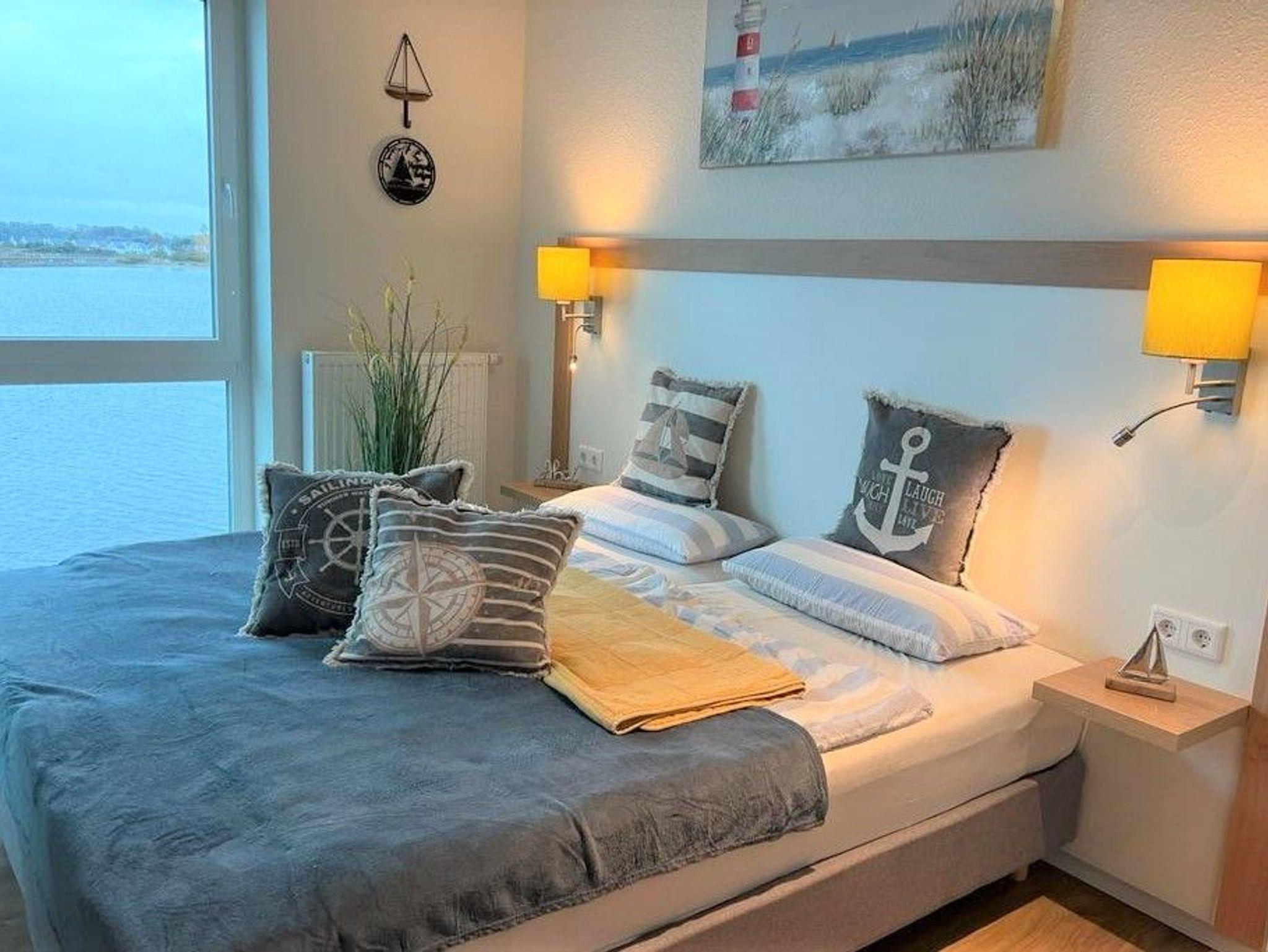 Ein Schlafzimmer bietet einen Businessarbeitsplatz mit Glasfaser und WLAN für Homeoffice. Ein atemberaubender Moment erreicht Sie bereits mit dem Sonnenaufgang, wenn Sie von der sonnigen Loggia die Schweinswale, Fischreiher, Möwen, Enten usw. begrüßen dürfen.