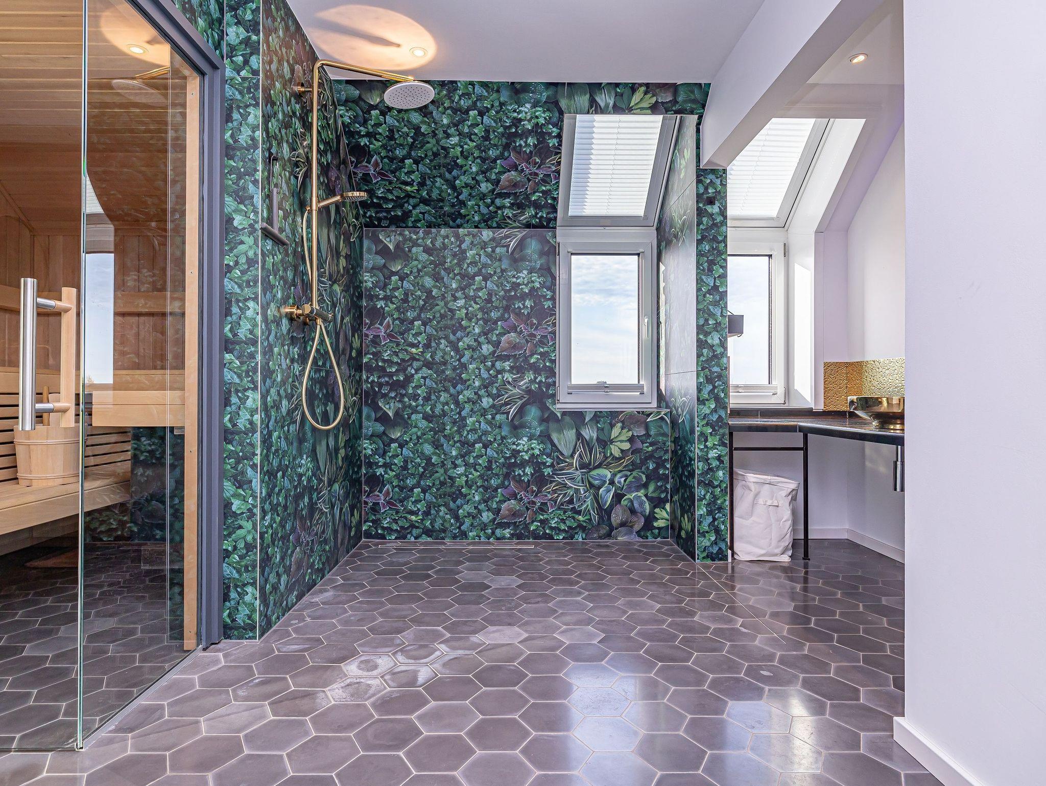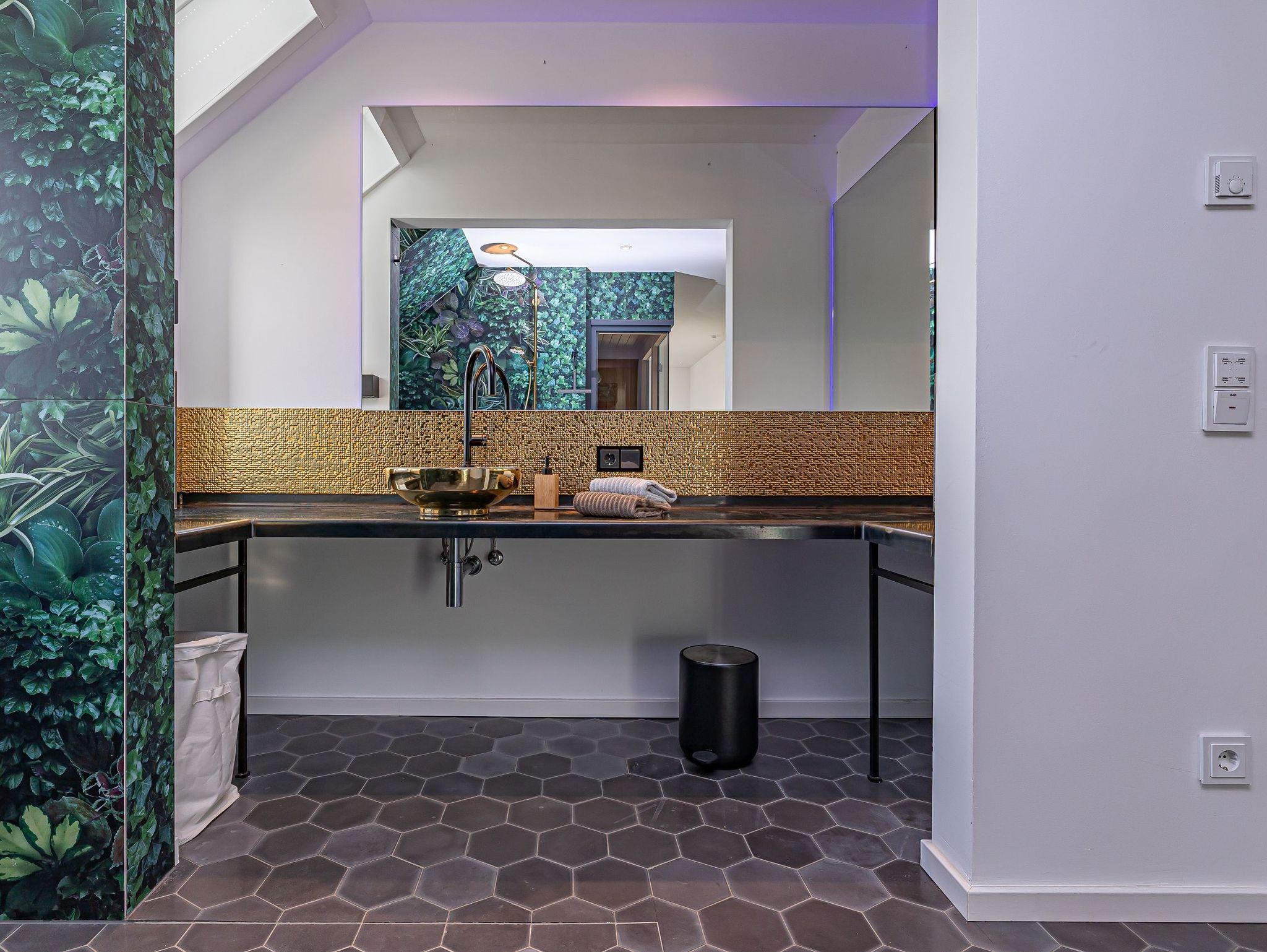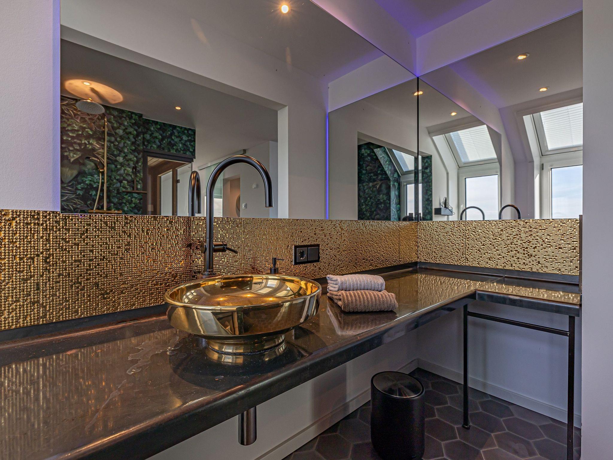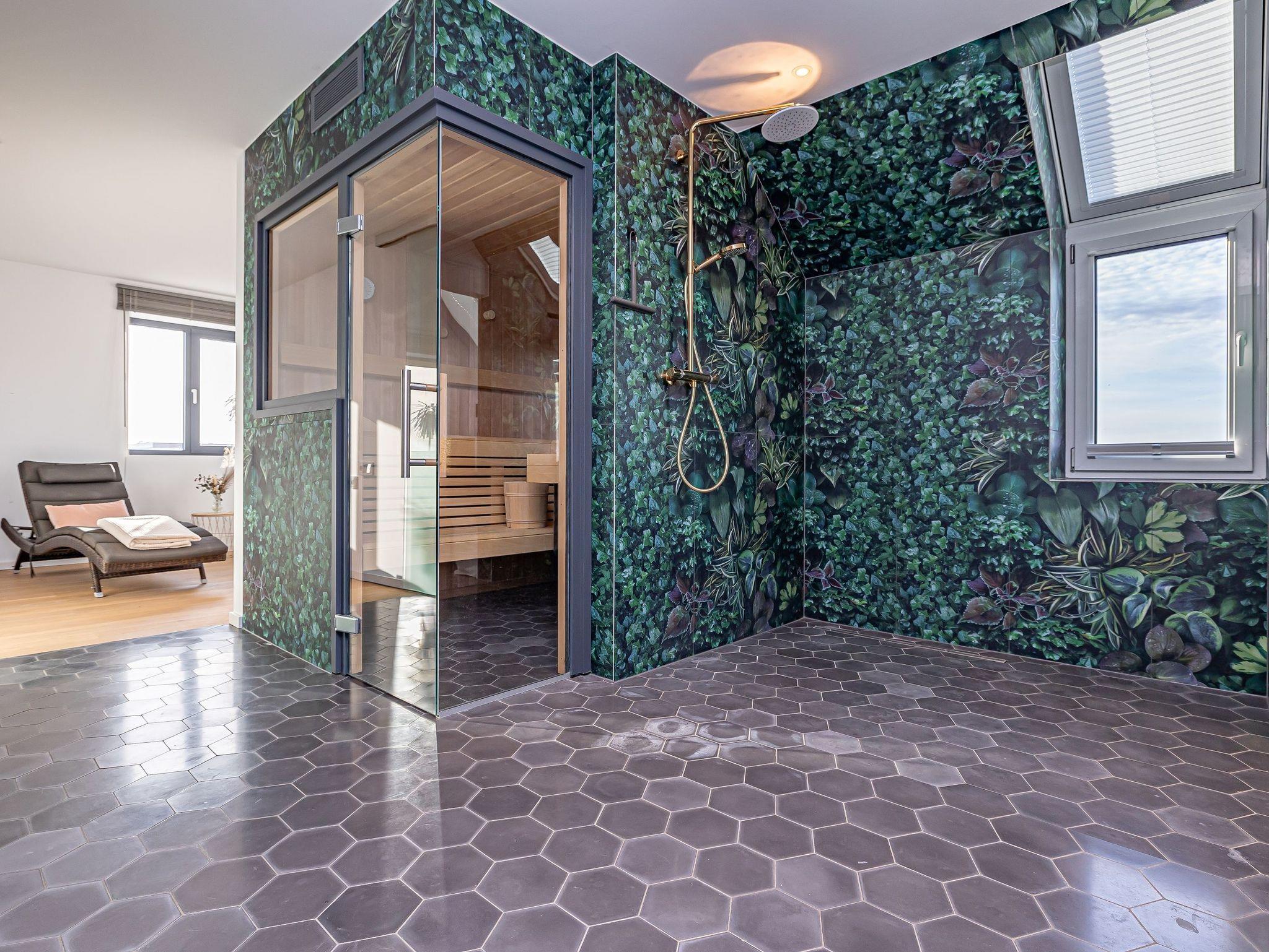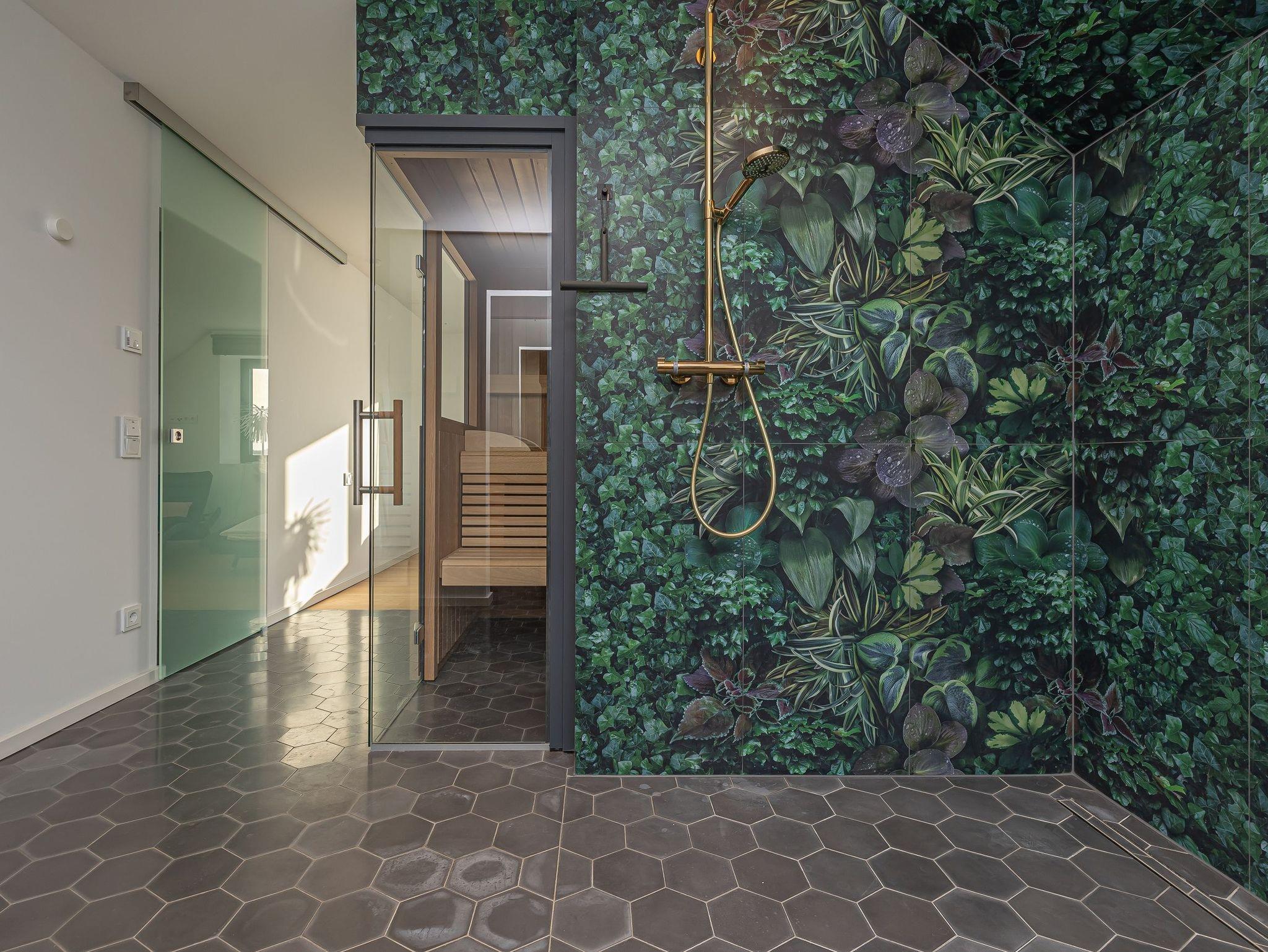 Im unteren Bereich erwartet Sie ein luxuriöser Wellnessbereich: eine finnische Sauna, ein angrenzender Ruheraum und eine großzügige Rain-Shower-Dusche bieten ideale Voraussetzungen, um Körper und Geist zu entspannen.