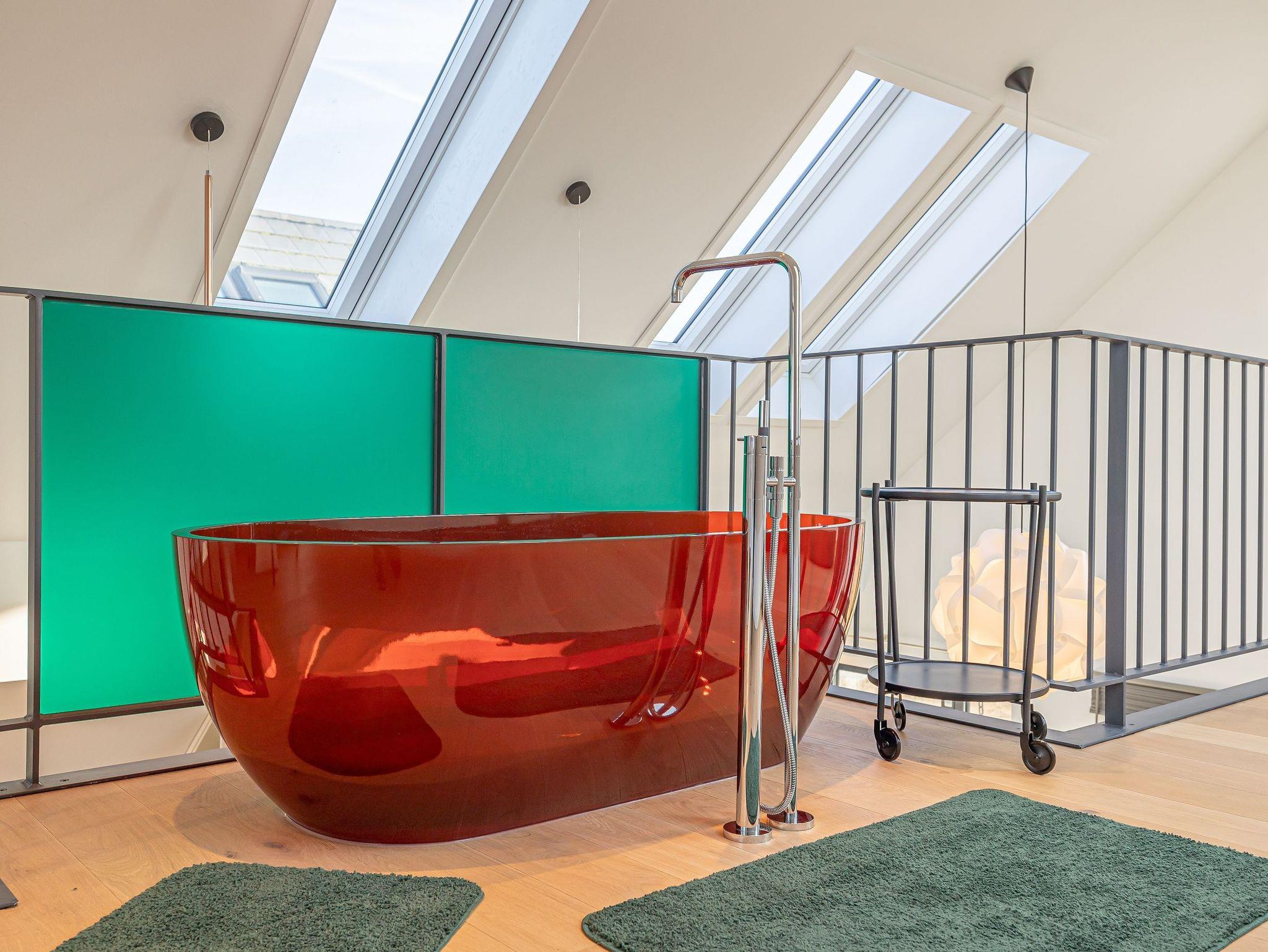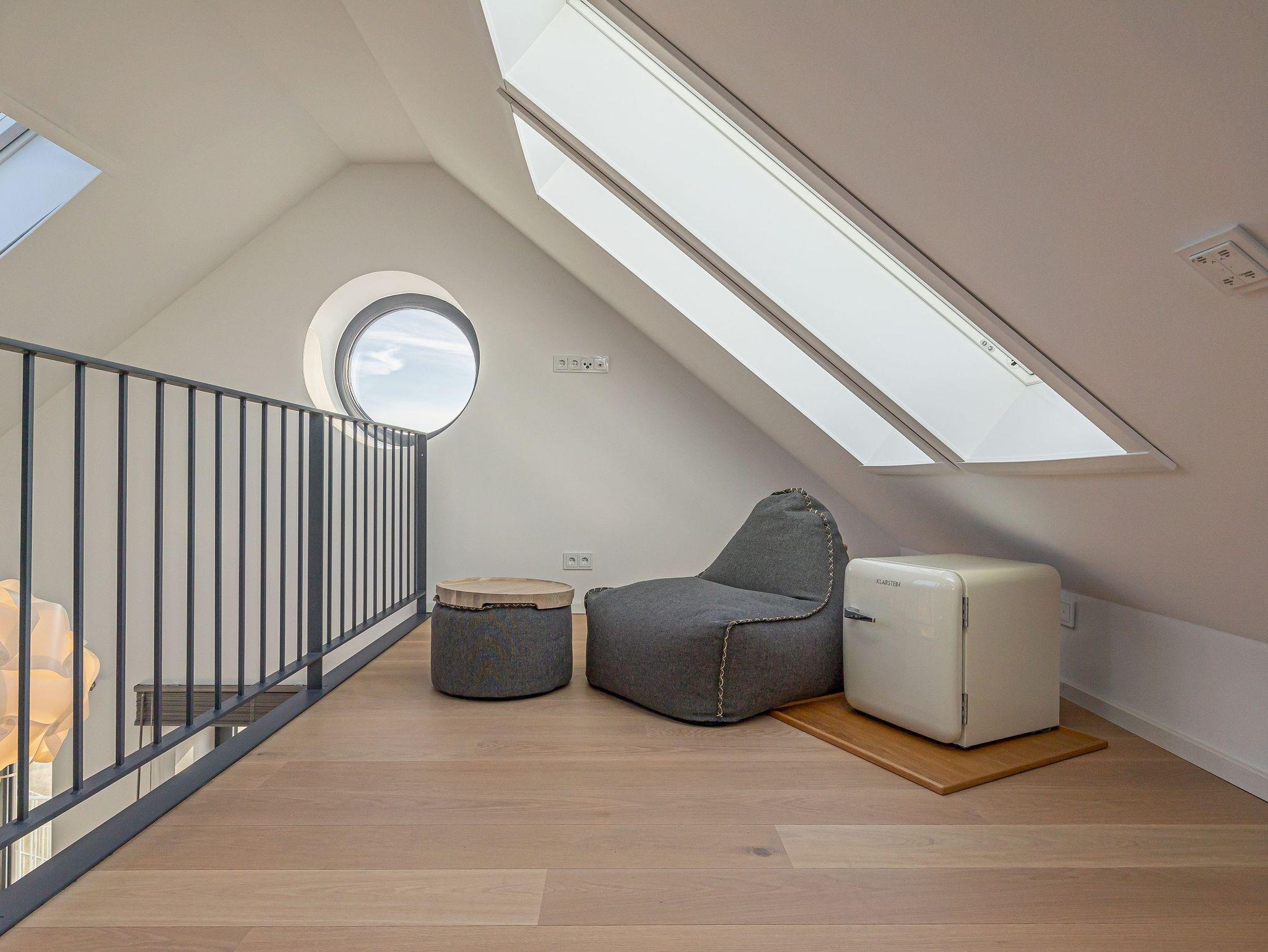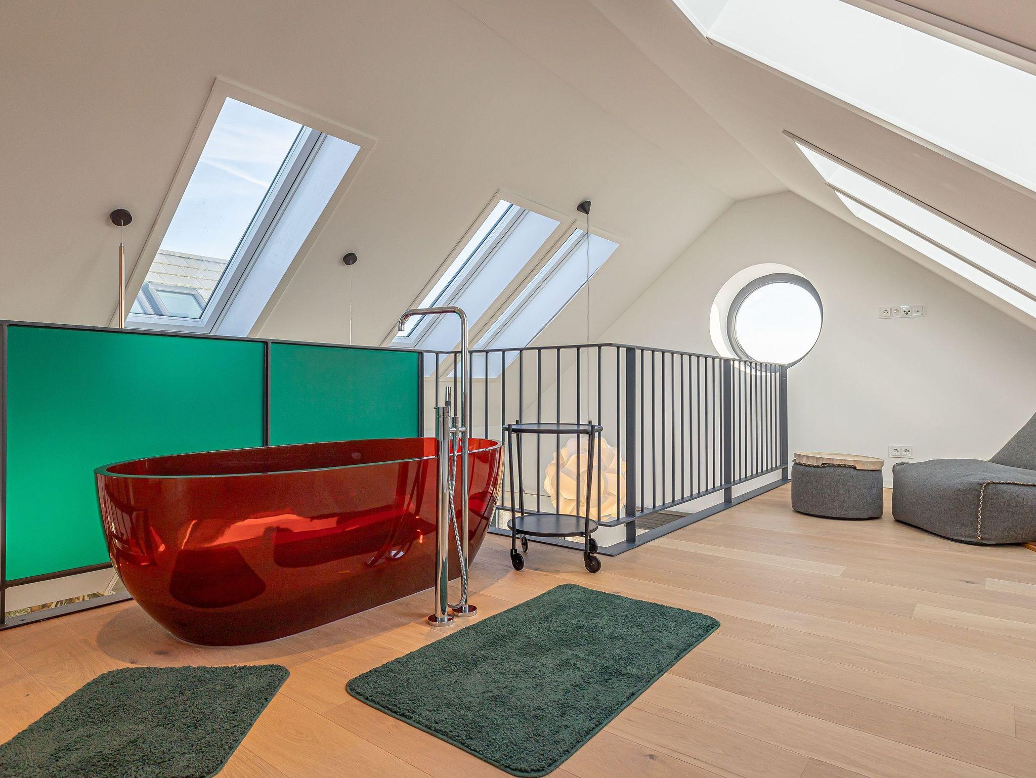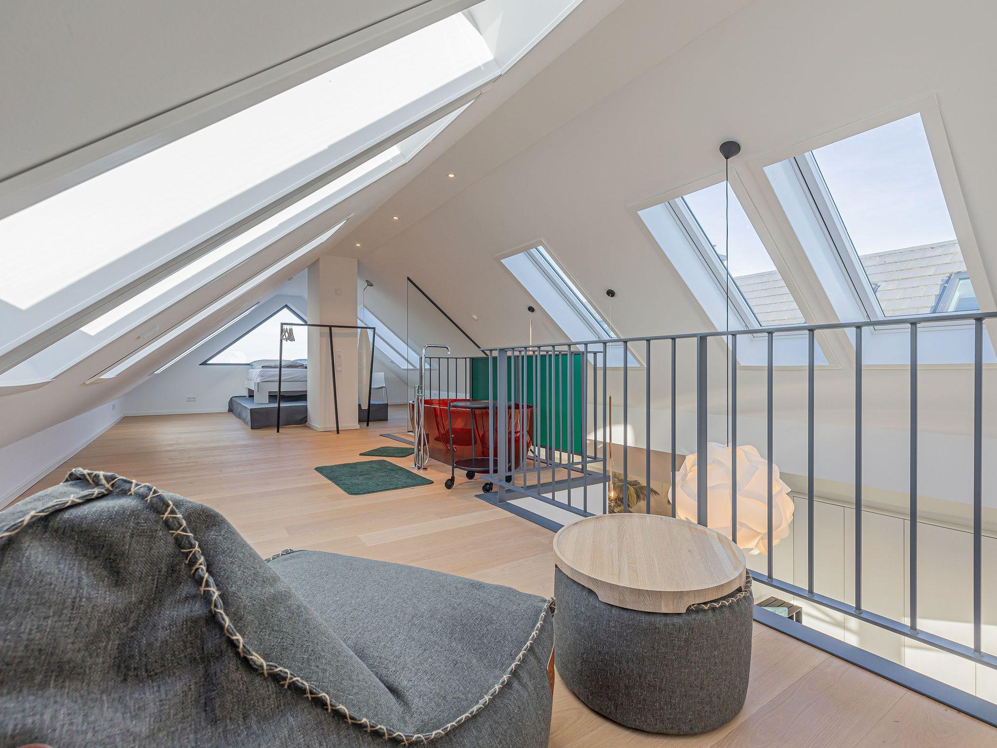 Das obere Stockwerk ist ein weiteres Highlight der Wohnung: Hier finden Sie eine freistehende Badewanne, die ein luxuriöses Badeerlebnis verspricht, sowie eine zweite Schlafmöglichkeit. Von hier aus genießen Sie atemberaubende Ausblicke, die den Raum zu etwas ganz Besonderem machen.