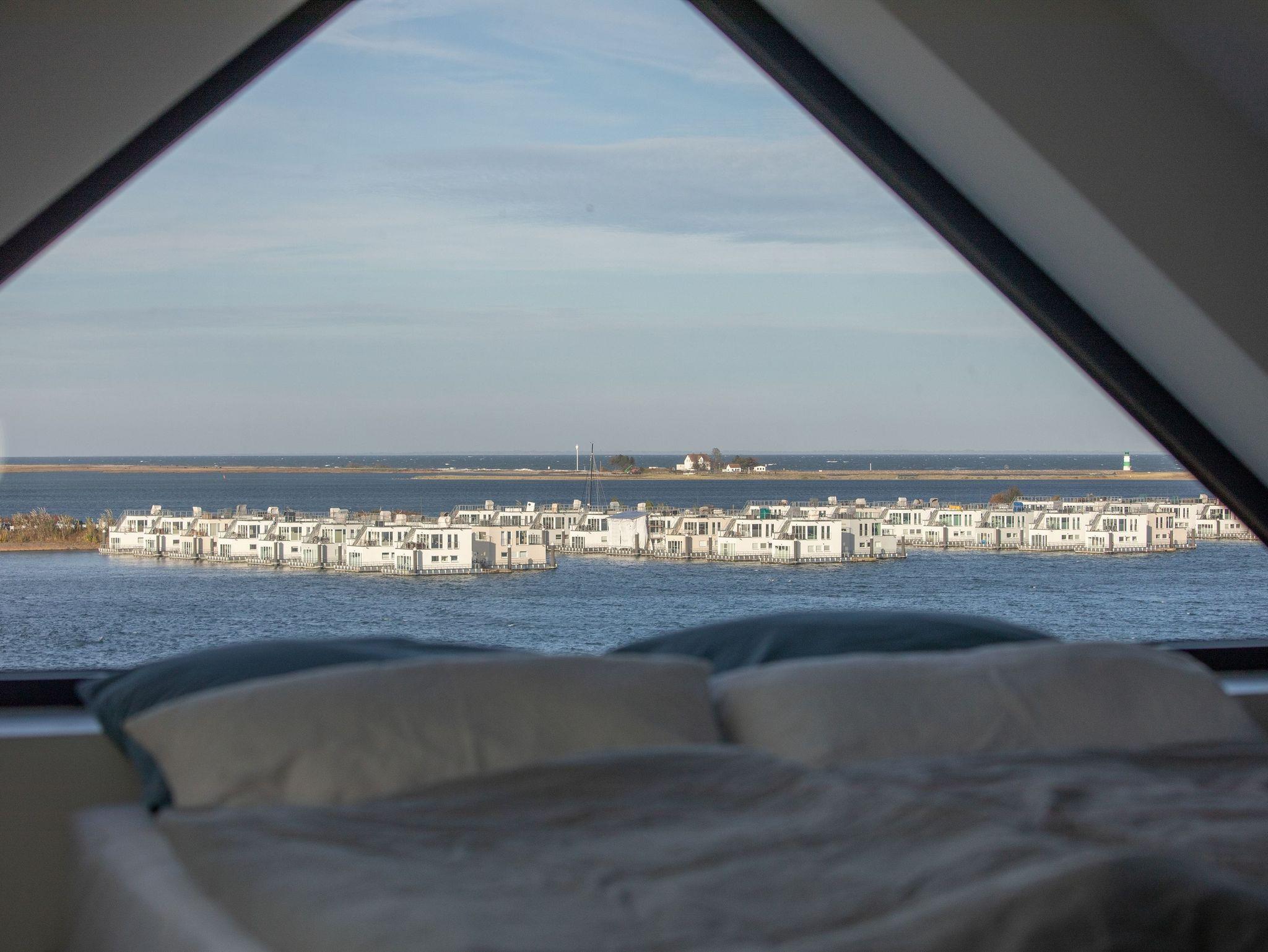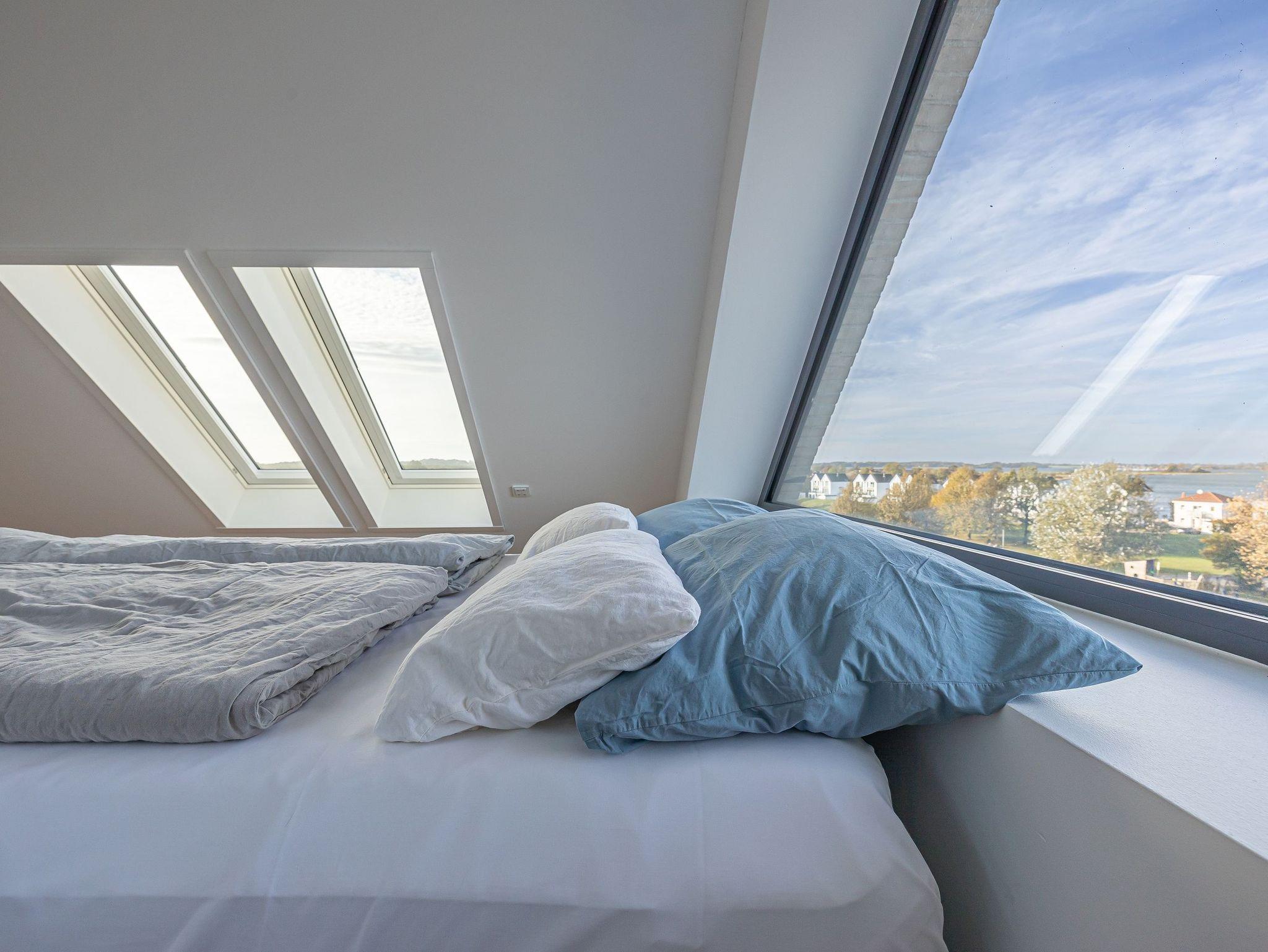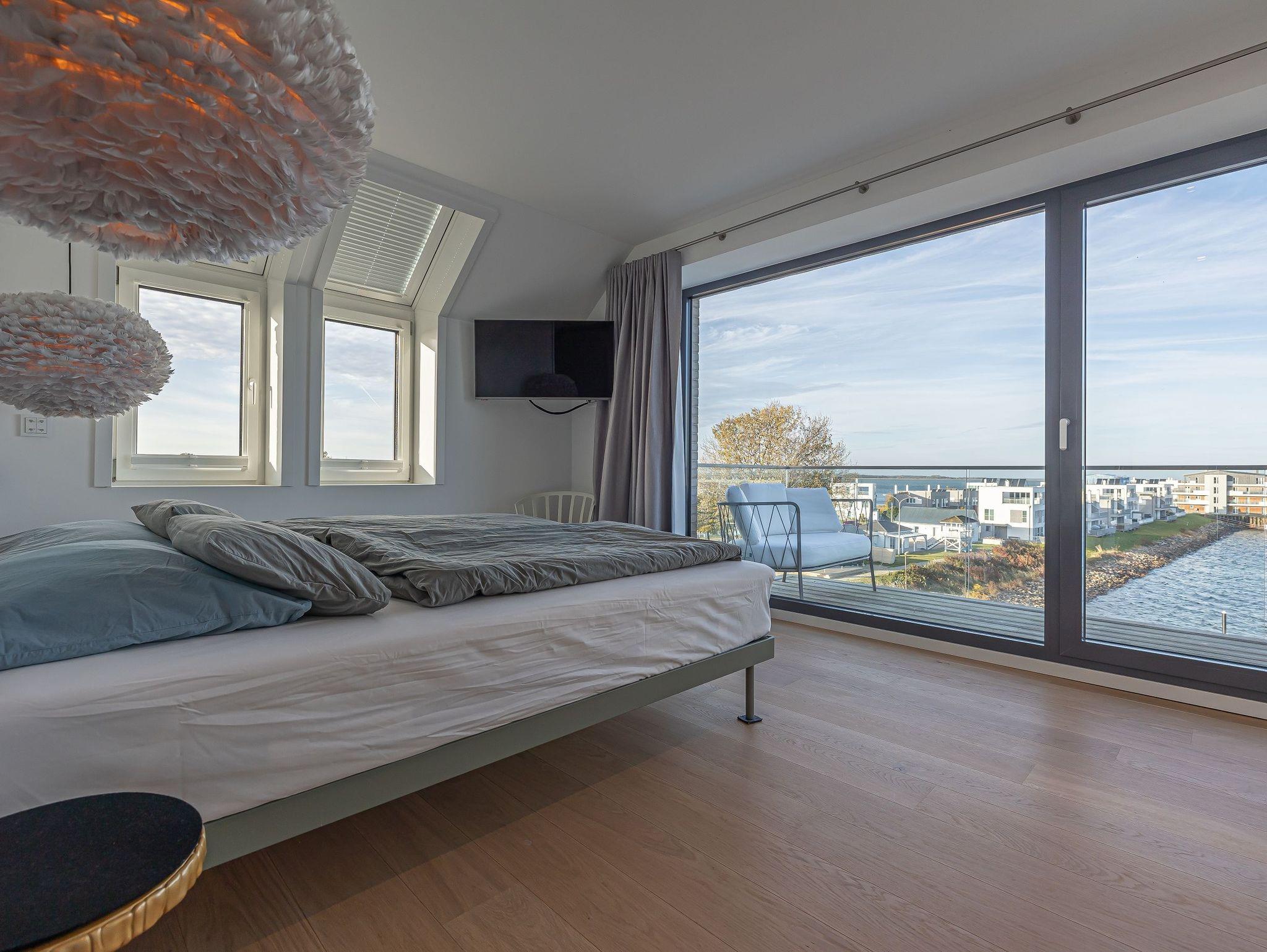 Der lichtdurchflutete Wohnbereich lädt mit einem knisternden Kamin und einem beeindruckenden Panoramablick auf den Hafen, den Leuchtturm von Schleimünde und die Ostsee zum Verweilen ein. Die moderne, voll ausgestattete Küche mit originellem Wandbild schafft die perfekte Atmosphäre für gemeinsame Kochabende. Das elegante Schlafzimmer mit komfortablem Doppelbett und eigenem TV garantiert erholsame Nächte.