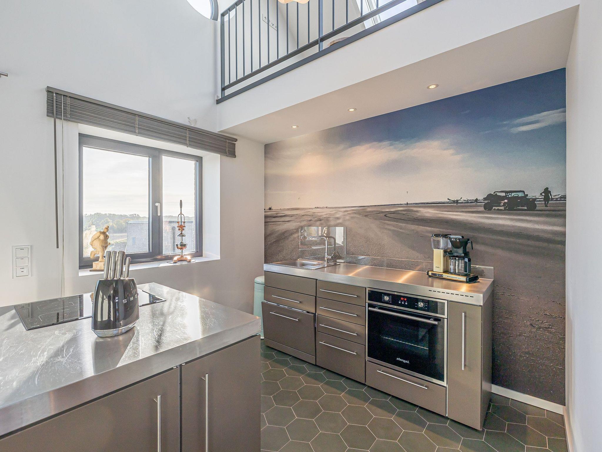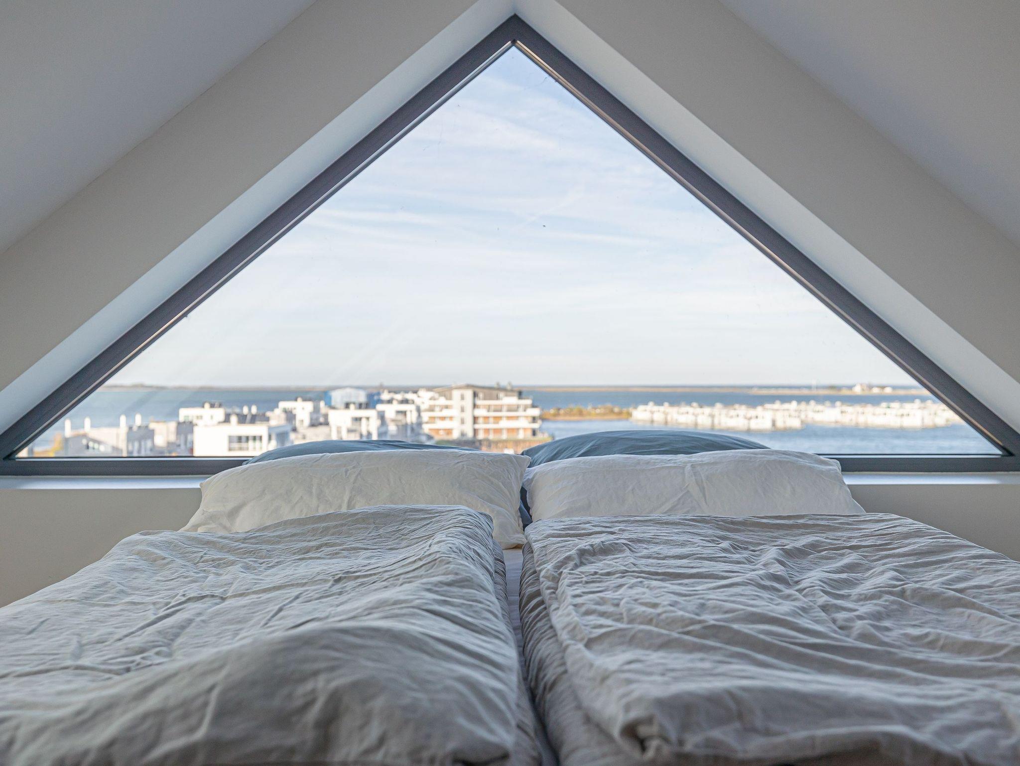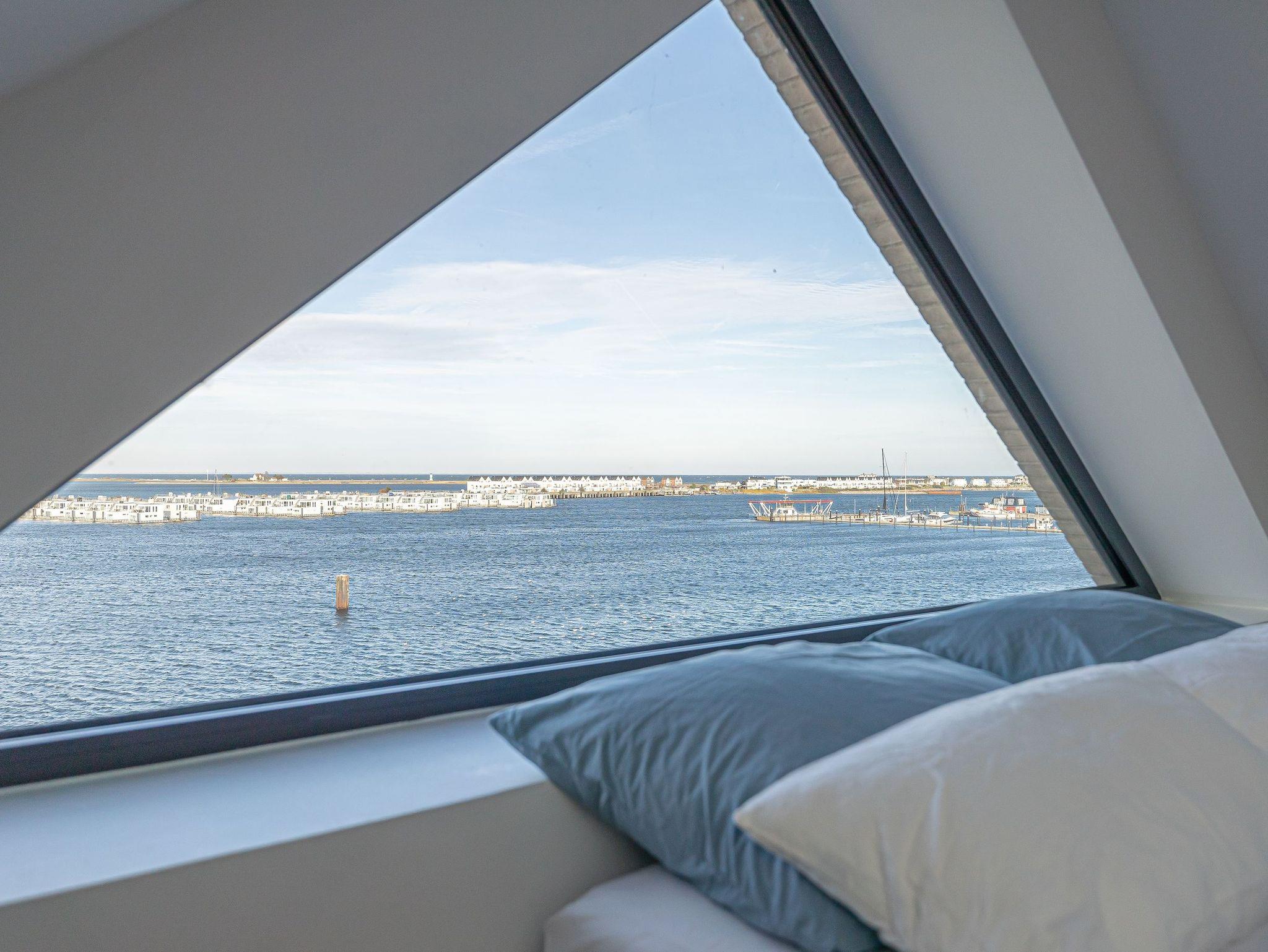 Der lichtdurchflutete Wohnbereich lädt mit einem knisternden Kamin und einem beeindruckenden Panoramablick auf den Hafen, den Leuchtturm von Schleimünde und die Ostsee zum Verweilen ein. Die moderne, voll ausgestattete Küche mit originellem Wandbild schafft die perfekte Atmosphäre für gemeinsame Kochabende. Das elegante Schlafzimmer mit komfortablem Doppelbett und eigenem TV garantiert erholsame Nächte.