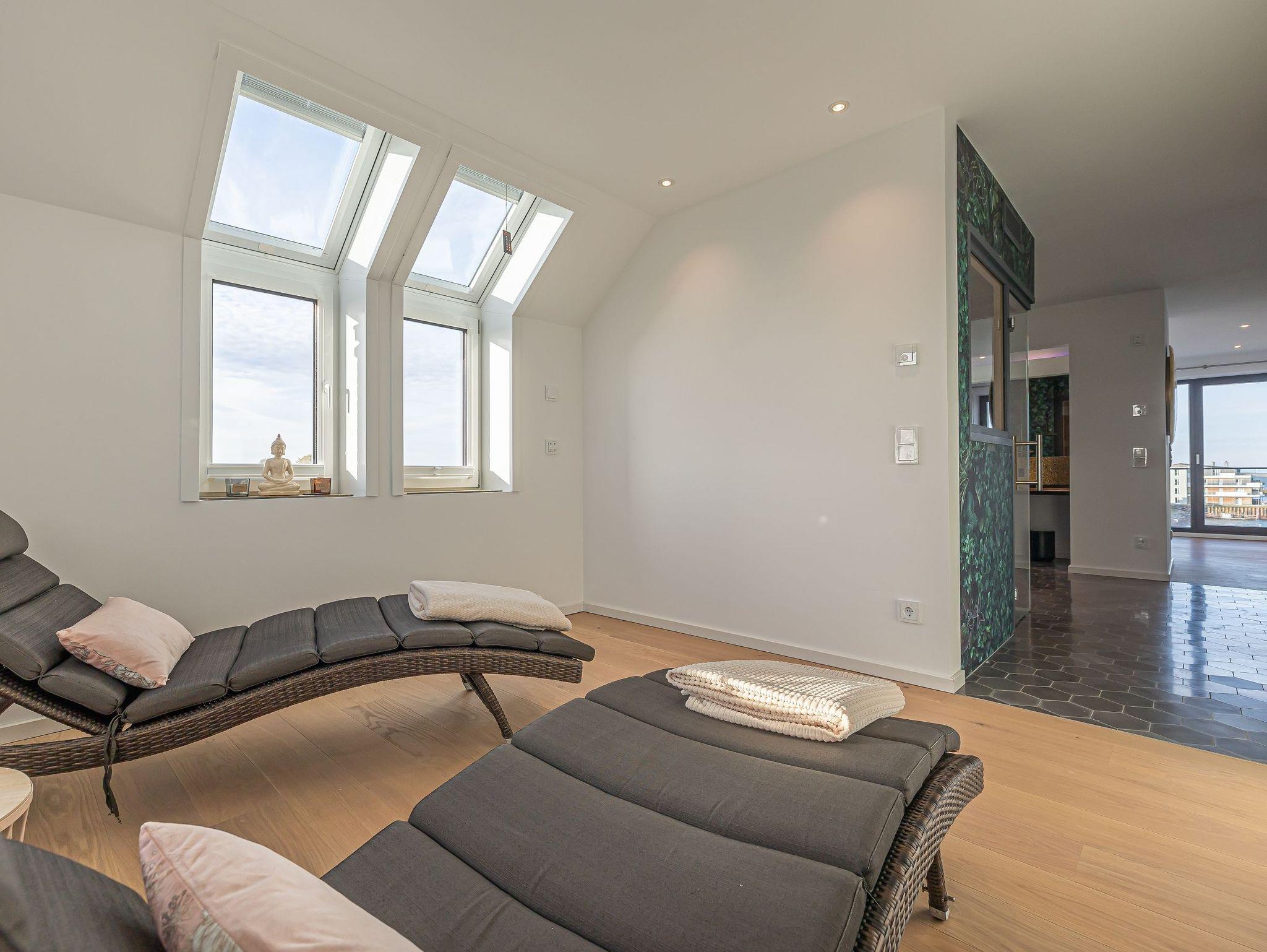 Stilvolles Rooftop Garden Apartment mit Sauna, Kamin und Meerblick im Ostseeresort Olpenitz.