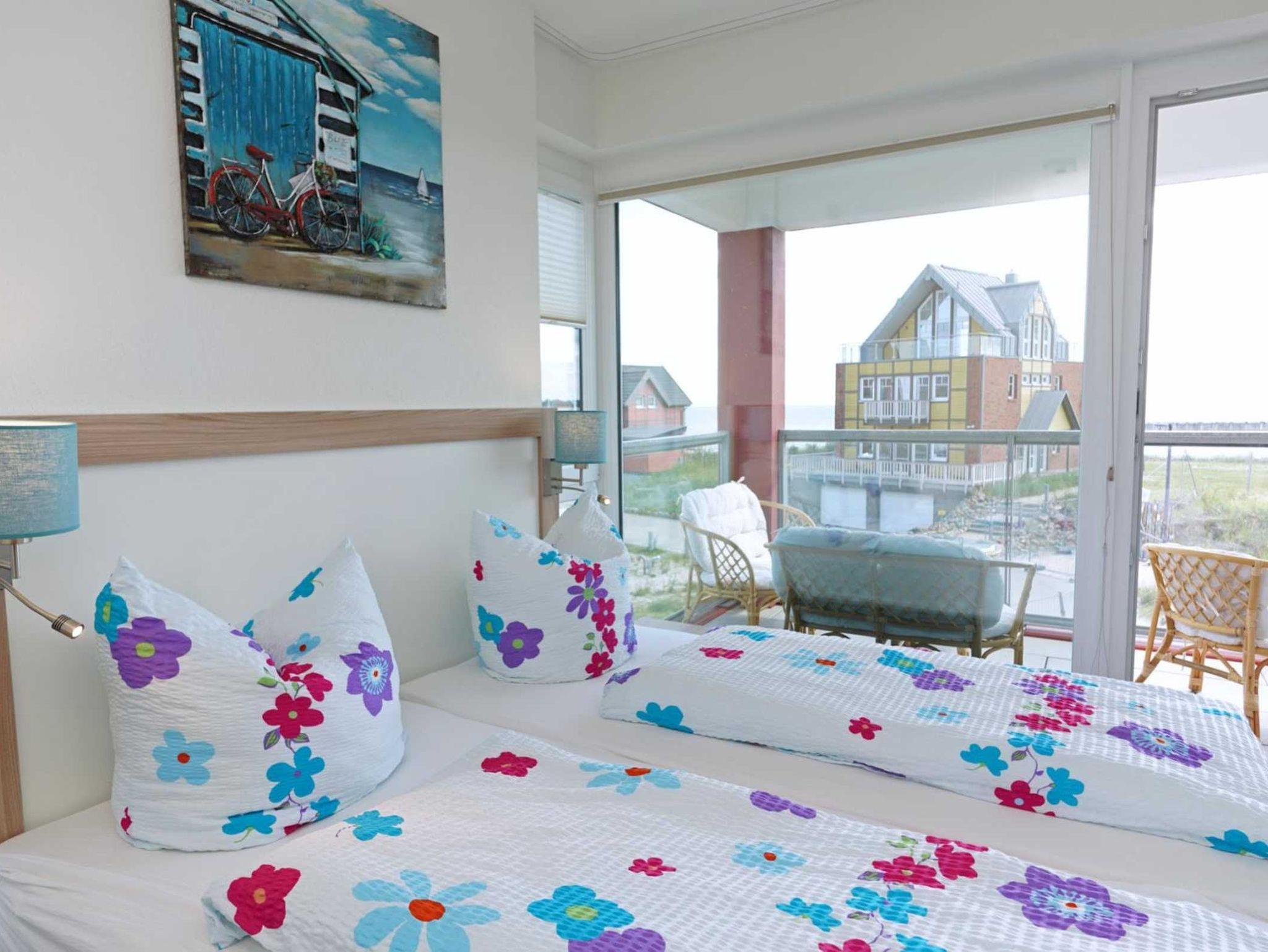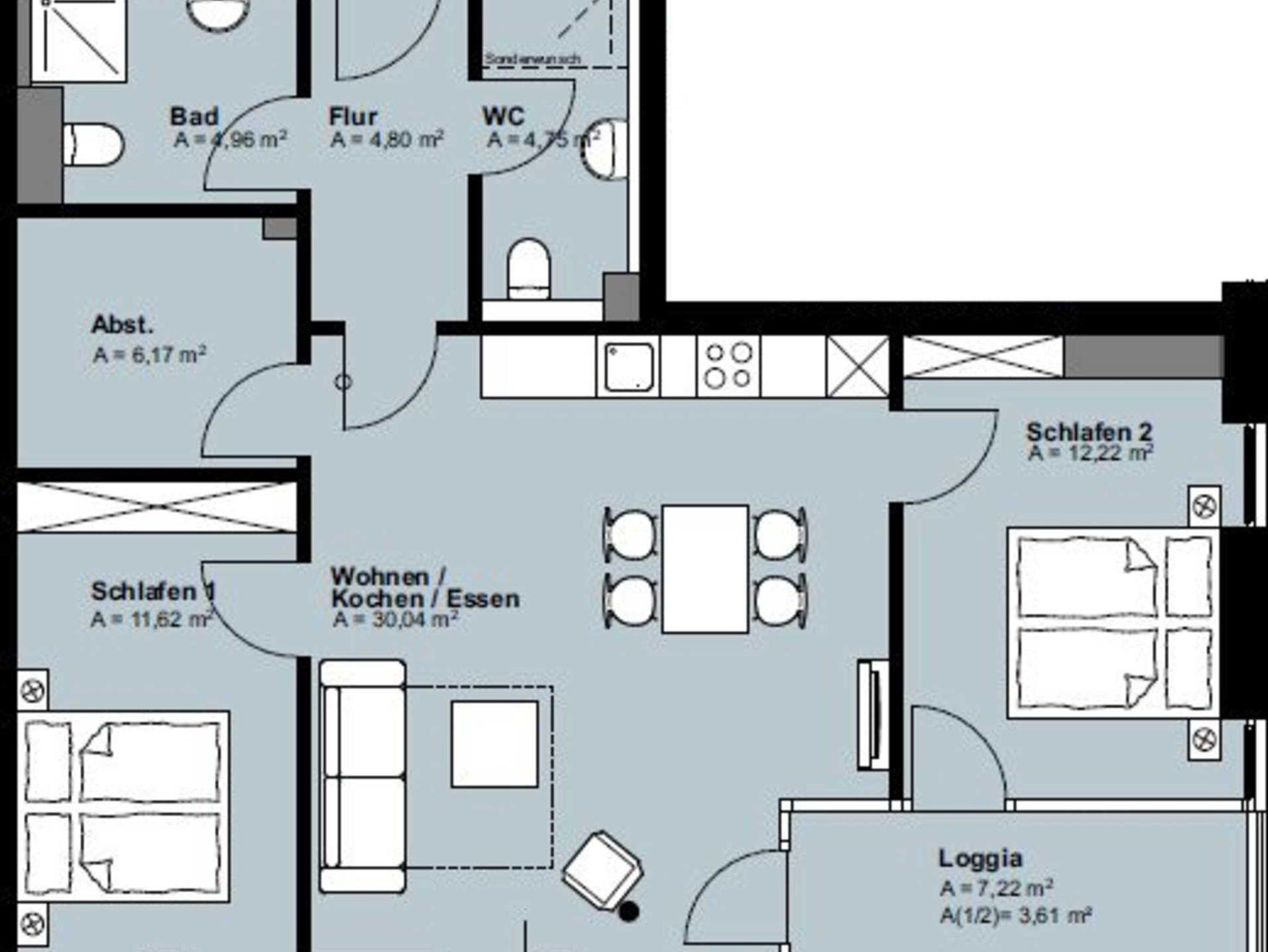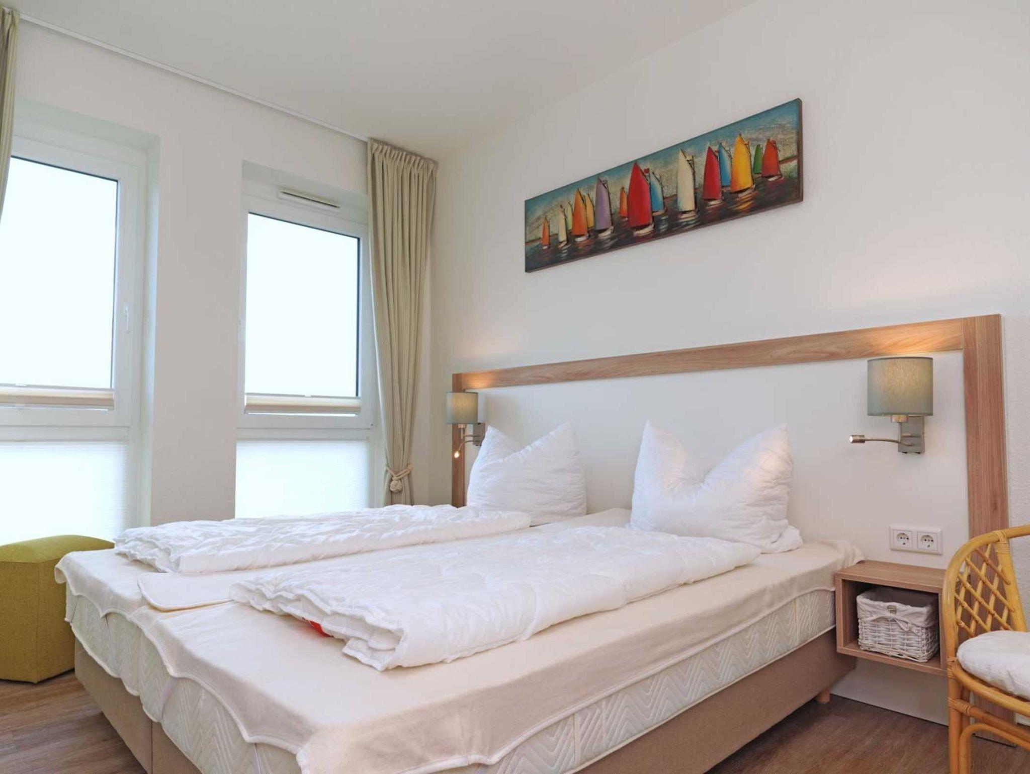 3-Zimmer-Appartement für bis zu 6 Personen, ca. 78 m², ein Schlafzimmer mit Doppelbett, zwei Schlafzimmer mit Doppelbett, Wohn-/Schlafraum mit Doppelbettcouch, separater Essplatz, voll ausgestatteter Küchenbereich, Geschirrspüler, Bad mit Dusche/WC, zweites Bad mit Dusche/WC, Balkon, SAT-TV, mit seitlichem Seeblick.