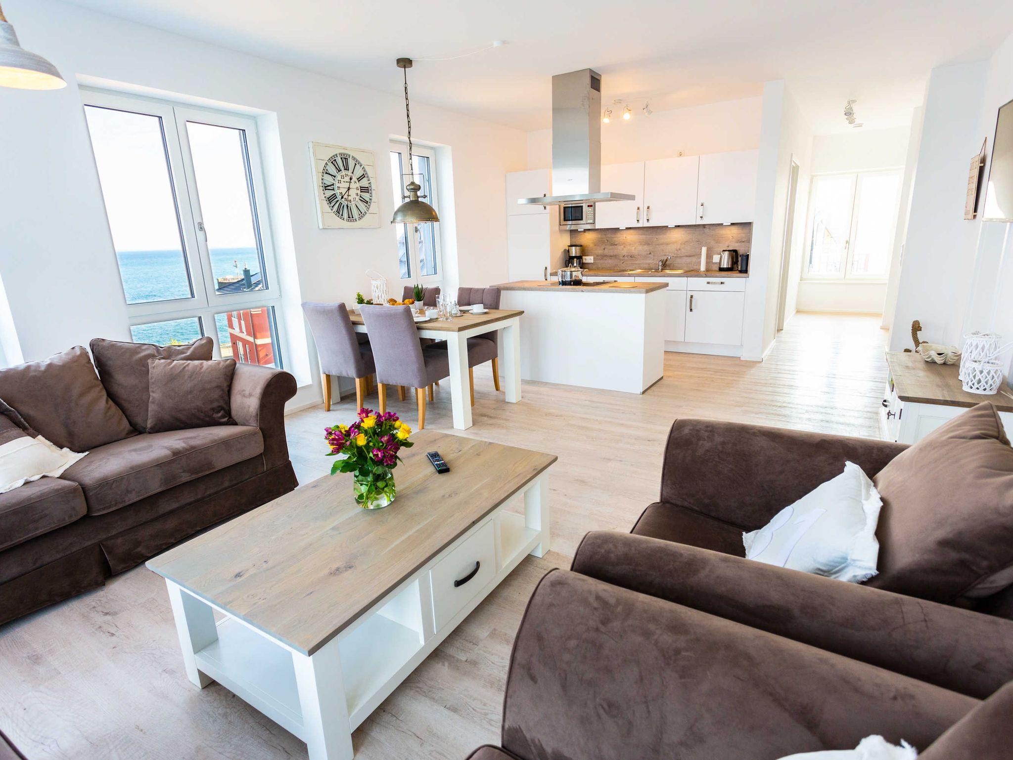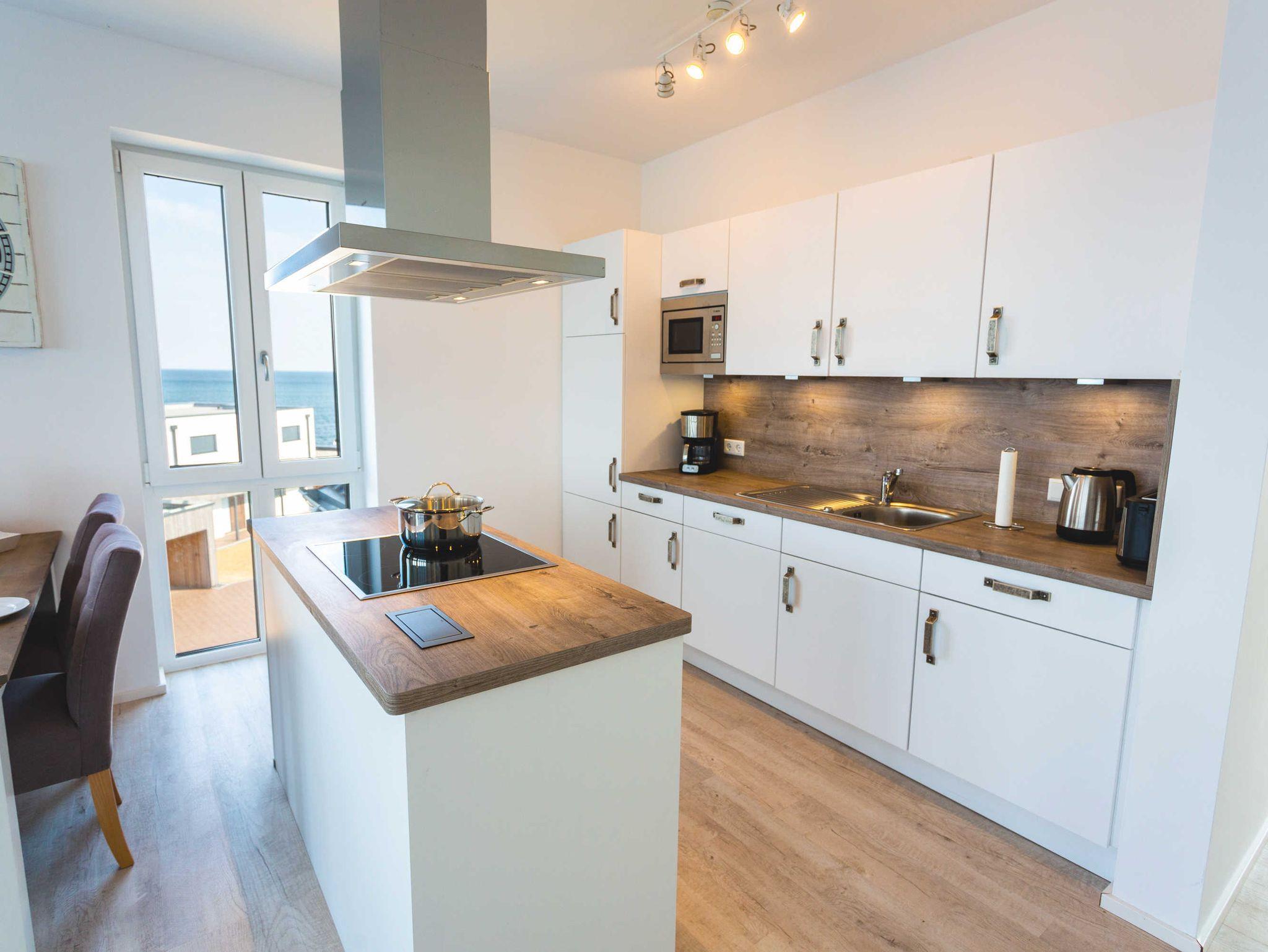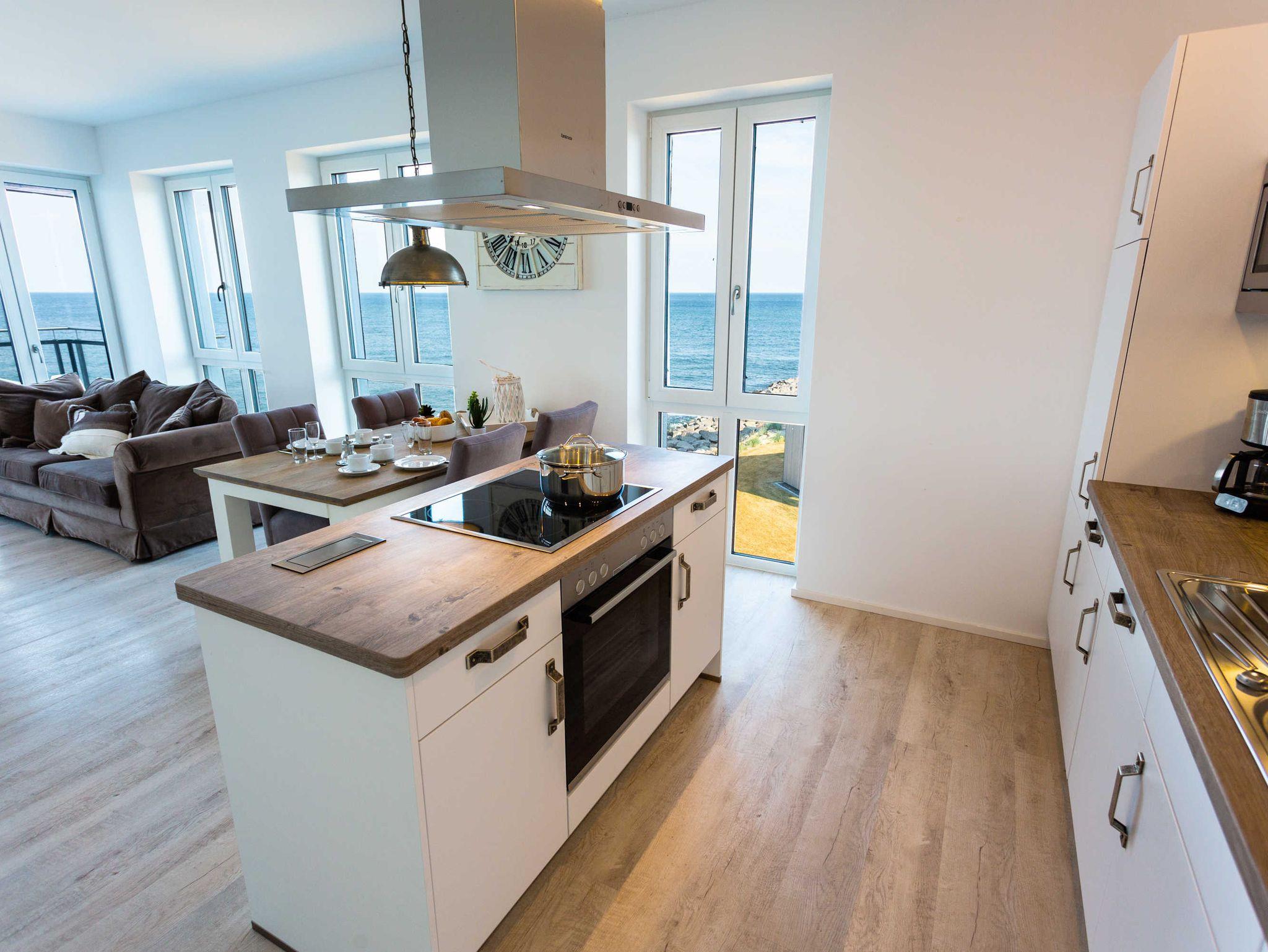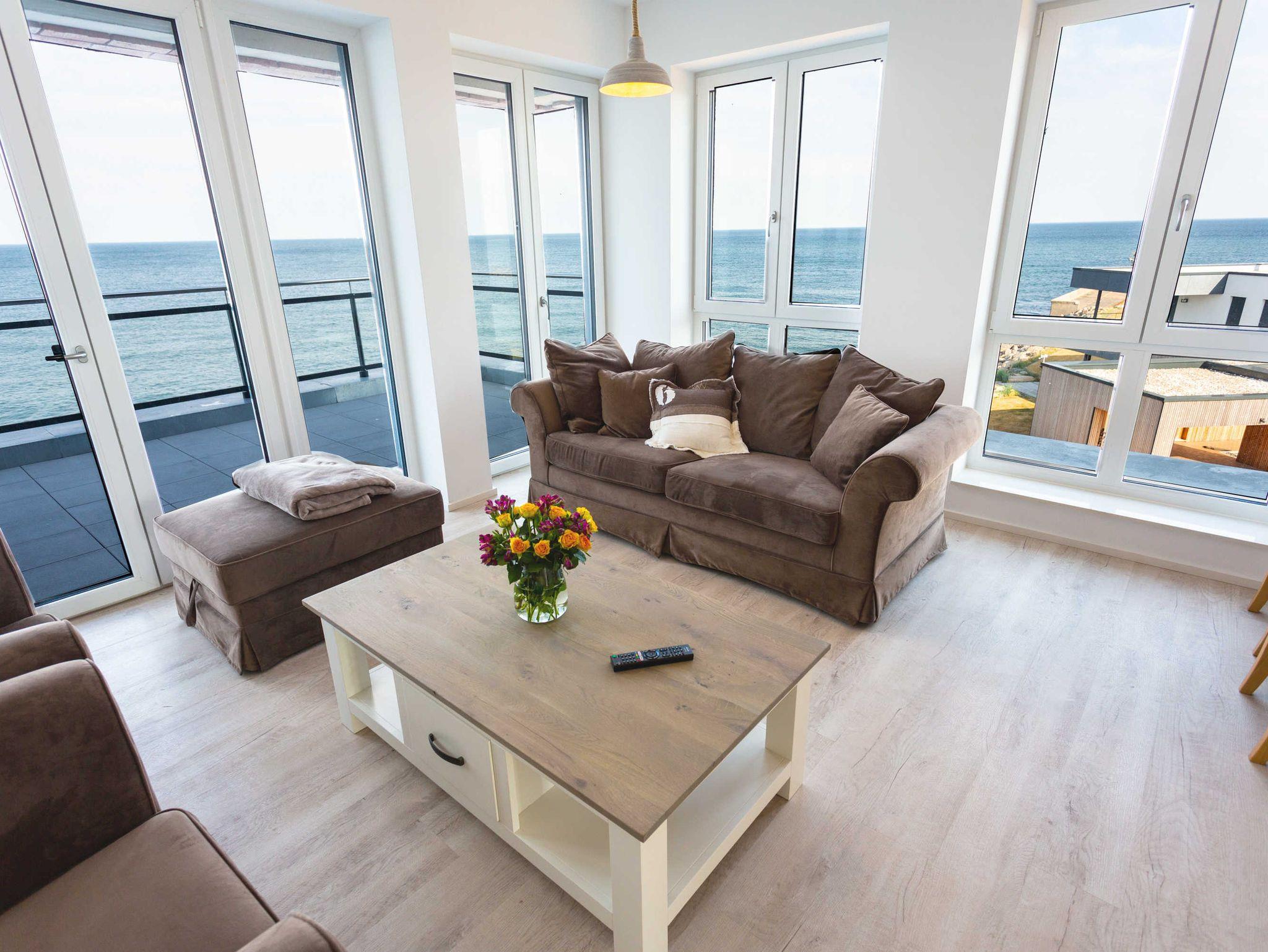 Ein geschmackvoll eingerichtetes Wohnzimmer mit einer kuscheligen Couchgarnitur bietet Ihnen einen traumhaften, direkten und wohl einzigartigen Meerblick. Es schließt sich eine sehr große Dachterrasse an, auf dem sich der atemberaubende Blick auf die Ostsee im Freien genießen lässt. Zu der komplett ausgestatteten Küche gehören der einladende Esstisch samt gemütlicher Bestuhlung, ein Kühlschrank mit Gefrierfach, ein Backofen, eine Mikrowelle, ein Geschirrspüler und selbstverständlich weitere Küchenutensilien. Zwei gemütliche Schlafzimmer - davon eins mit Meerblick - sind mit jeweils einem Boxspring-Doppelbett eingerichtet. Des Weiteren gehören ein Duschbad sowie ein weiteres Bad mit eigener Sauna, aus der Sie ebenfalls freien Blick auf die Ostsee haben, und Badewanne zur Ferienwohnung.