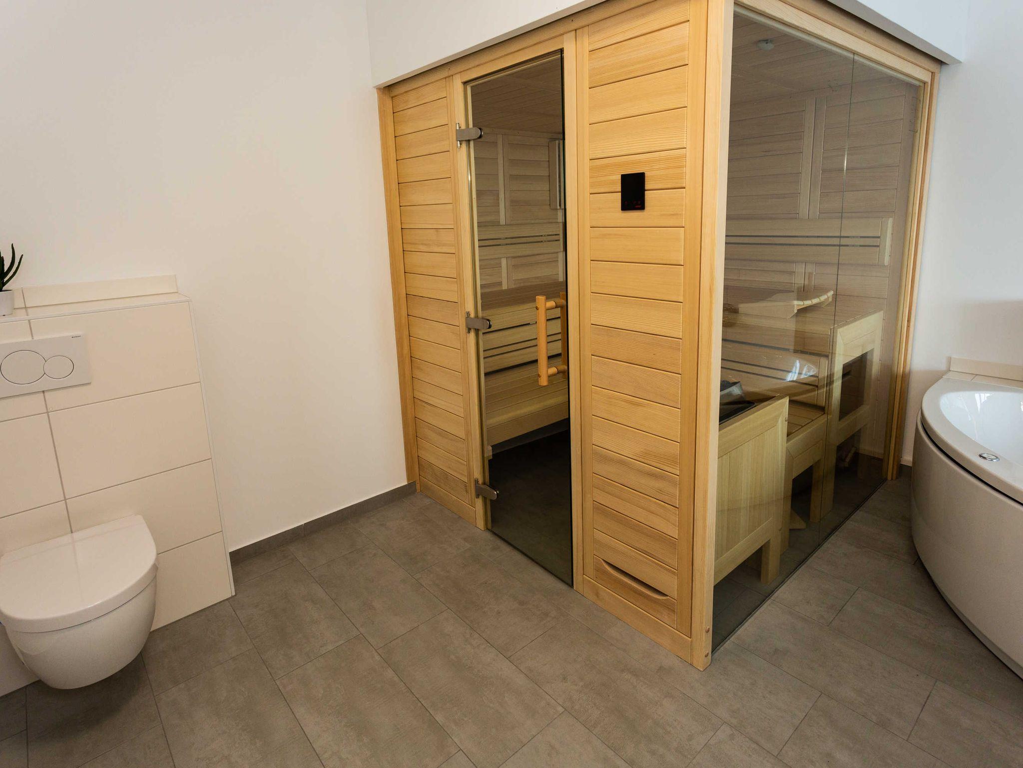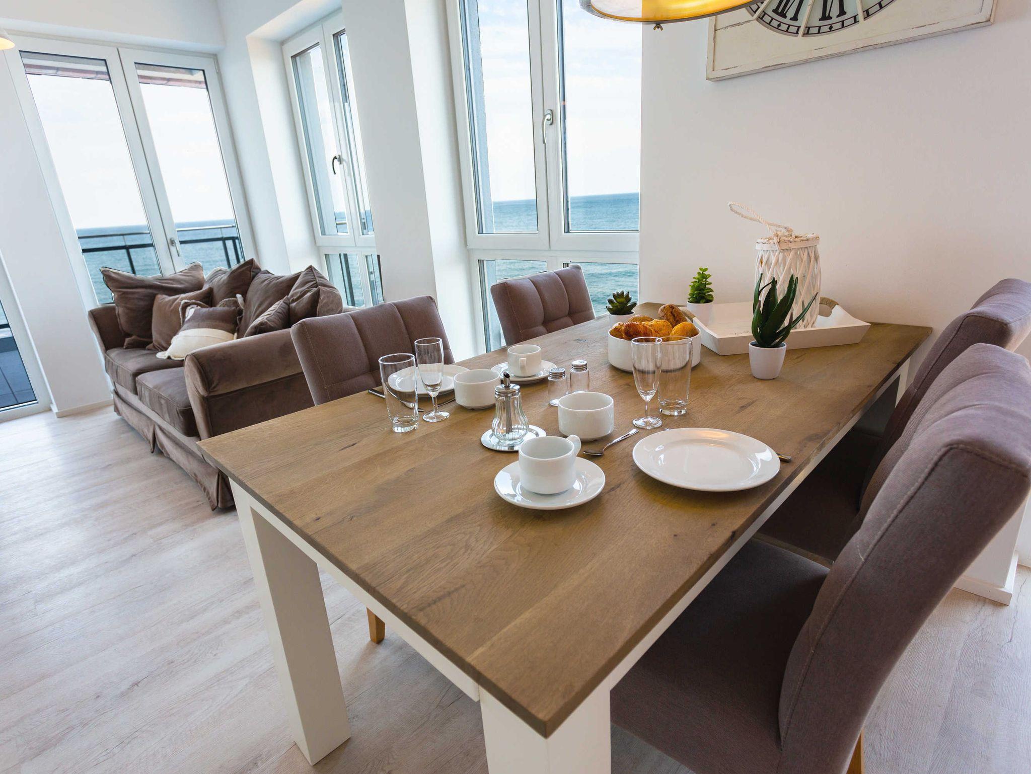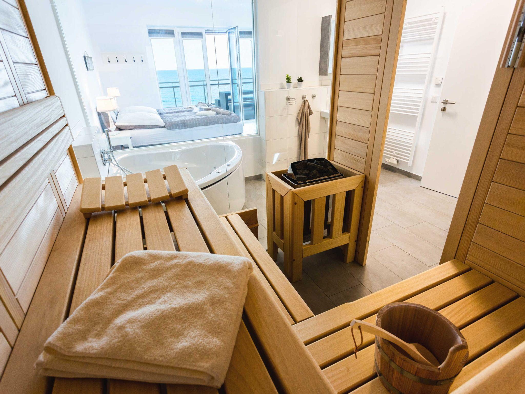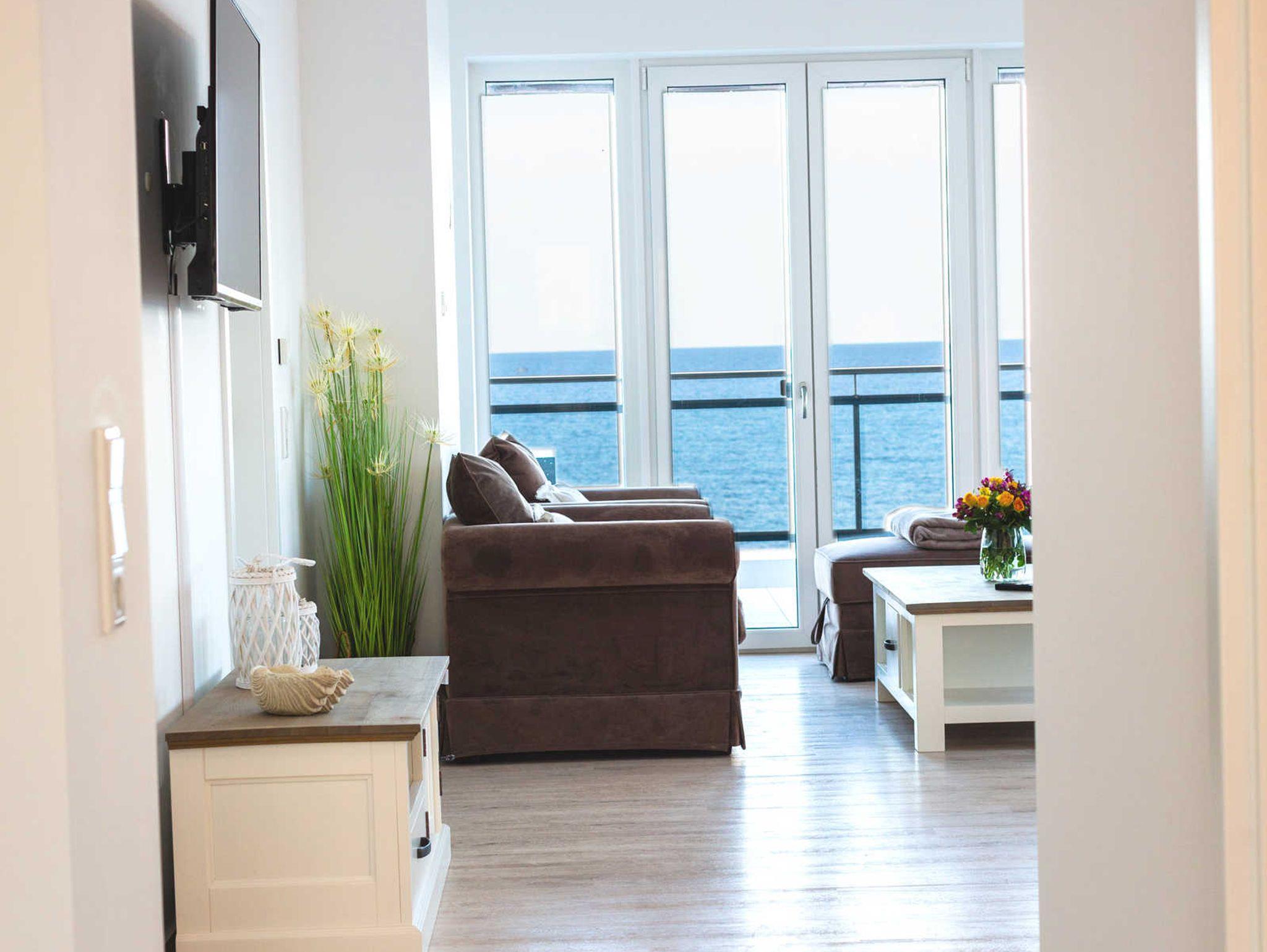 Ein geschmackvoll eingerichtetes Wohnzimmer mit einer kuscheligen Couchgarnitur bietet Ihnen einen traumhaften, direkten und wohl einzigartigen Meerblick. Es schließt sich eine sehr große Dachterrasse an, auf dem sich der atemberaubende Blick auf die Ostsee im Freien genießen lässt. Zu der komplett ausgestatteten Küche gehören der einladende Esstisch samt gemütlicher Bestuhlung, ein Kühlschrank mit Gefrierfach, ein Backofen, eine Mikrowelle, ein Geschirrspüler und selbstverständlich weitere Küchenutensilien. Zwei gemütliche Schlafzimmer - davon eins mit Meerblick - sind mit jeweils einem Boxspring-Doppelbett eingerichtet. Des Weiteren gehören ein Duschbad sowie ein weiteres Bad mit eigener Sauna, aus der Sie ebenfalls freien Blick auf die Ostsee haben, und Badewanne zur Ferienwohnung.