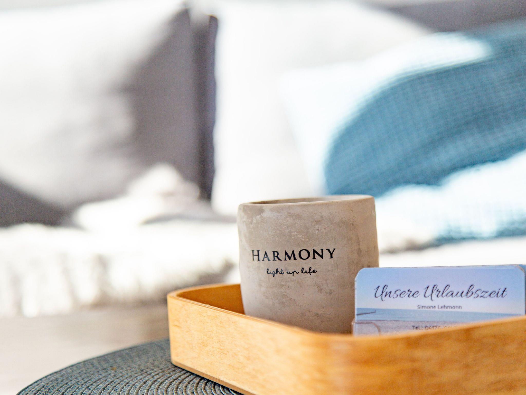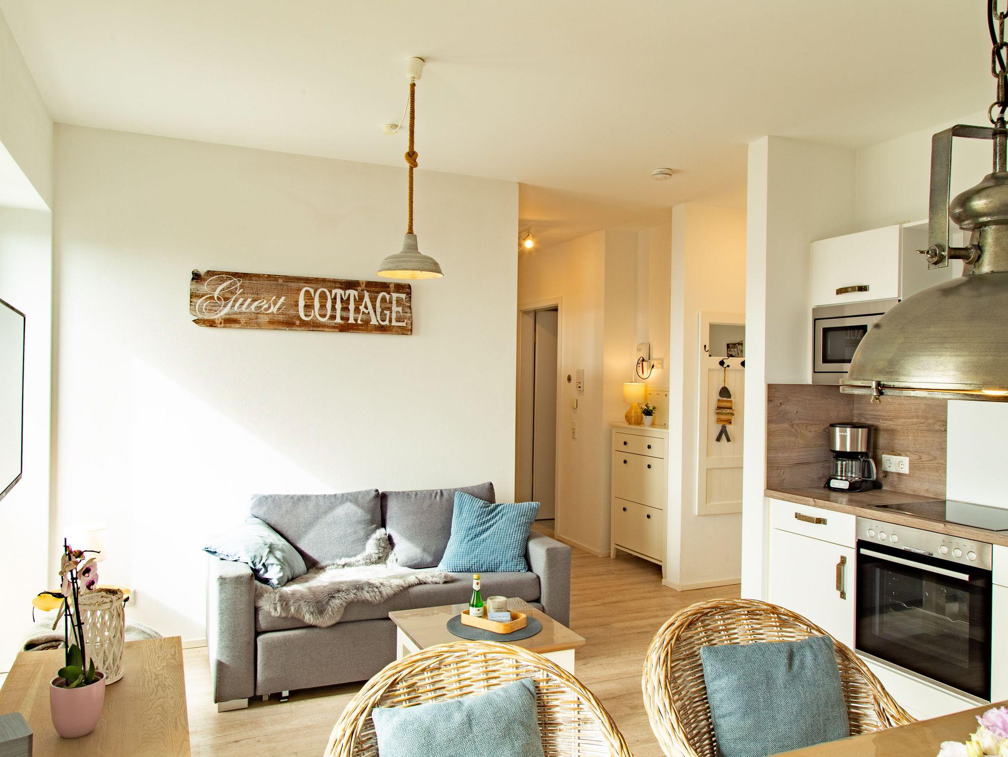 Ein geschmackvoll eingerichtetes Wohnzimmer mit einem schicken Sofa (als Schlafcouch für eine 3./4. Person nutzbar - Liegemaß 1,50 m x 2,00 m) bietet Ihnen einen tollen Meerblick und sorgt somit für ein absolut maritimes Wohngefühl am Meer.