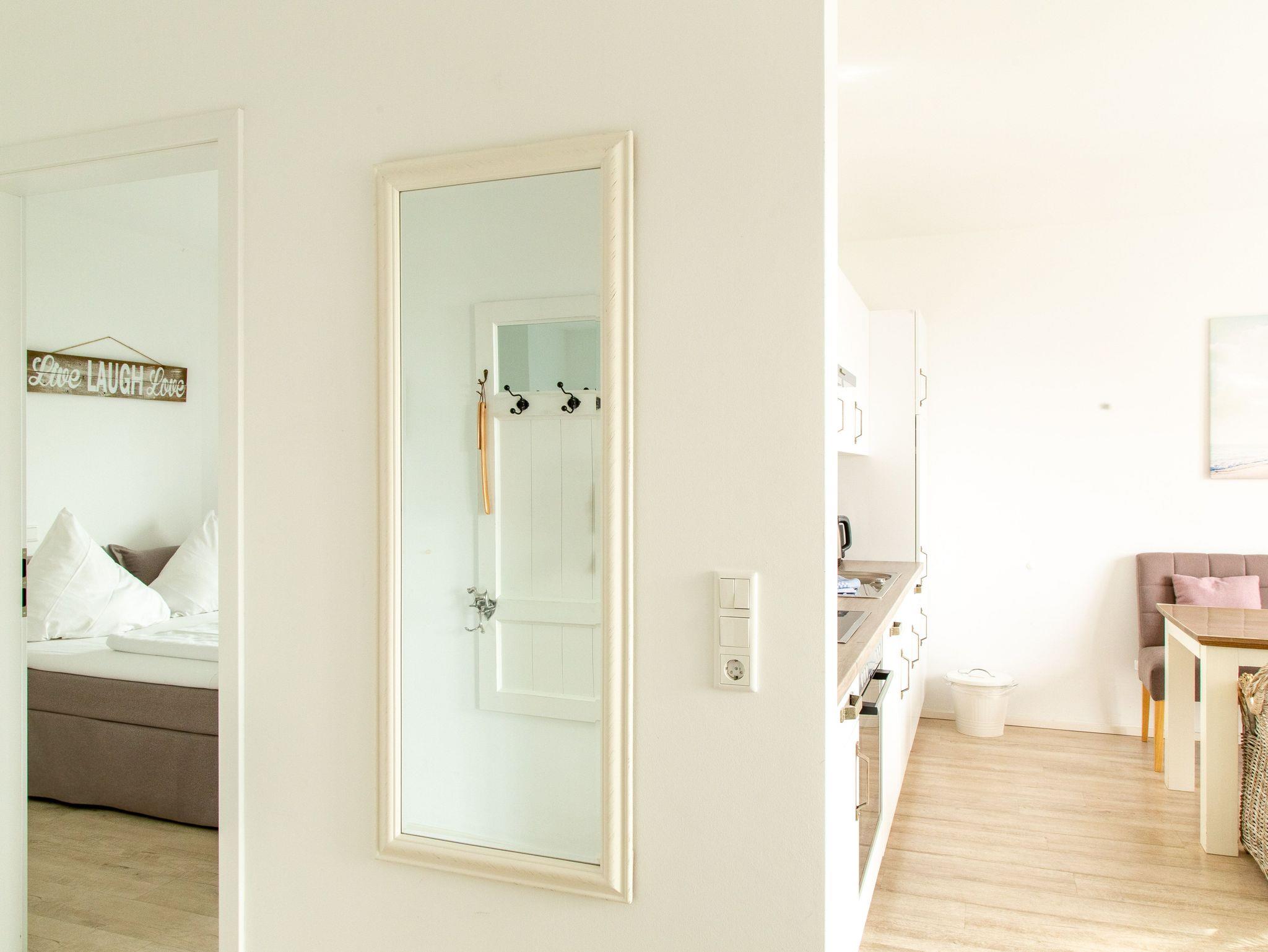 Das Appartement bietet auf 53 qm Platz für bis zu 4 Personen und besticht durch seine ansprechende und sehr hochwertige Ausstattung. Es verfügt über einen gemütlichen, offenen Wohnraum mit einer Couch, die zur Schlafcouch umfunktioniert werden kann. In dieses offene Wohnkonzept sind Essplatz und Küche integriert. Ferner gibt es ein modernes Schlafzimmer mit Verdunkelungsmöglichkeit durch Plissees und ein Badezimmer mit Dusche. Vom Wohnbereich aus gelangt man auf den möblierten Balkon mit Meerblick!