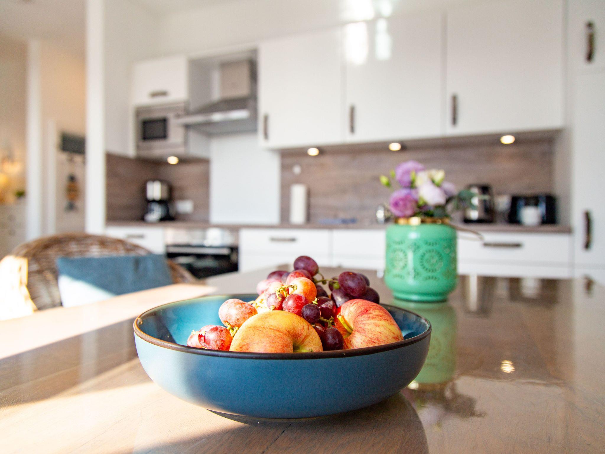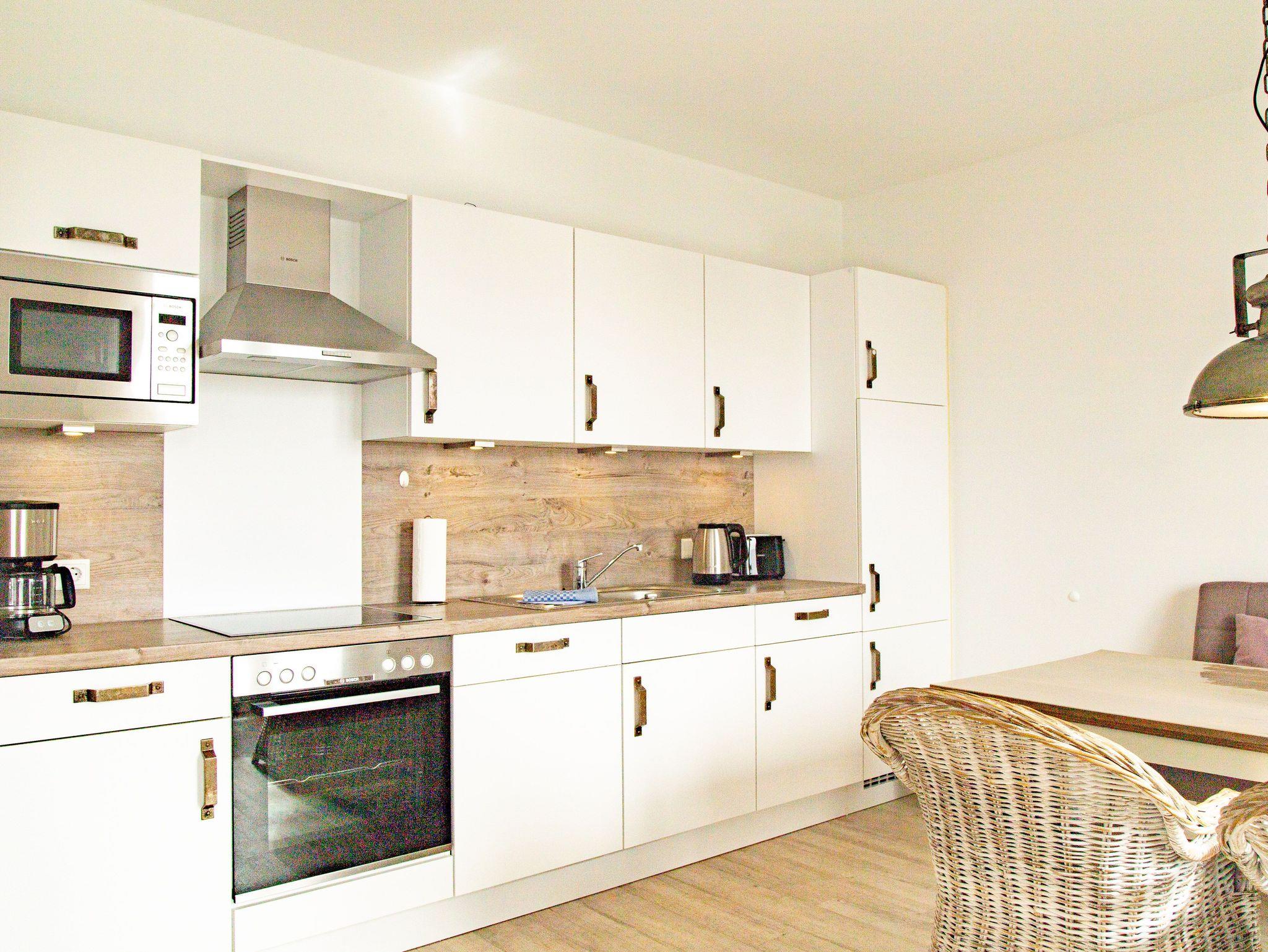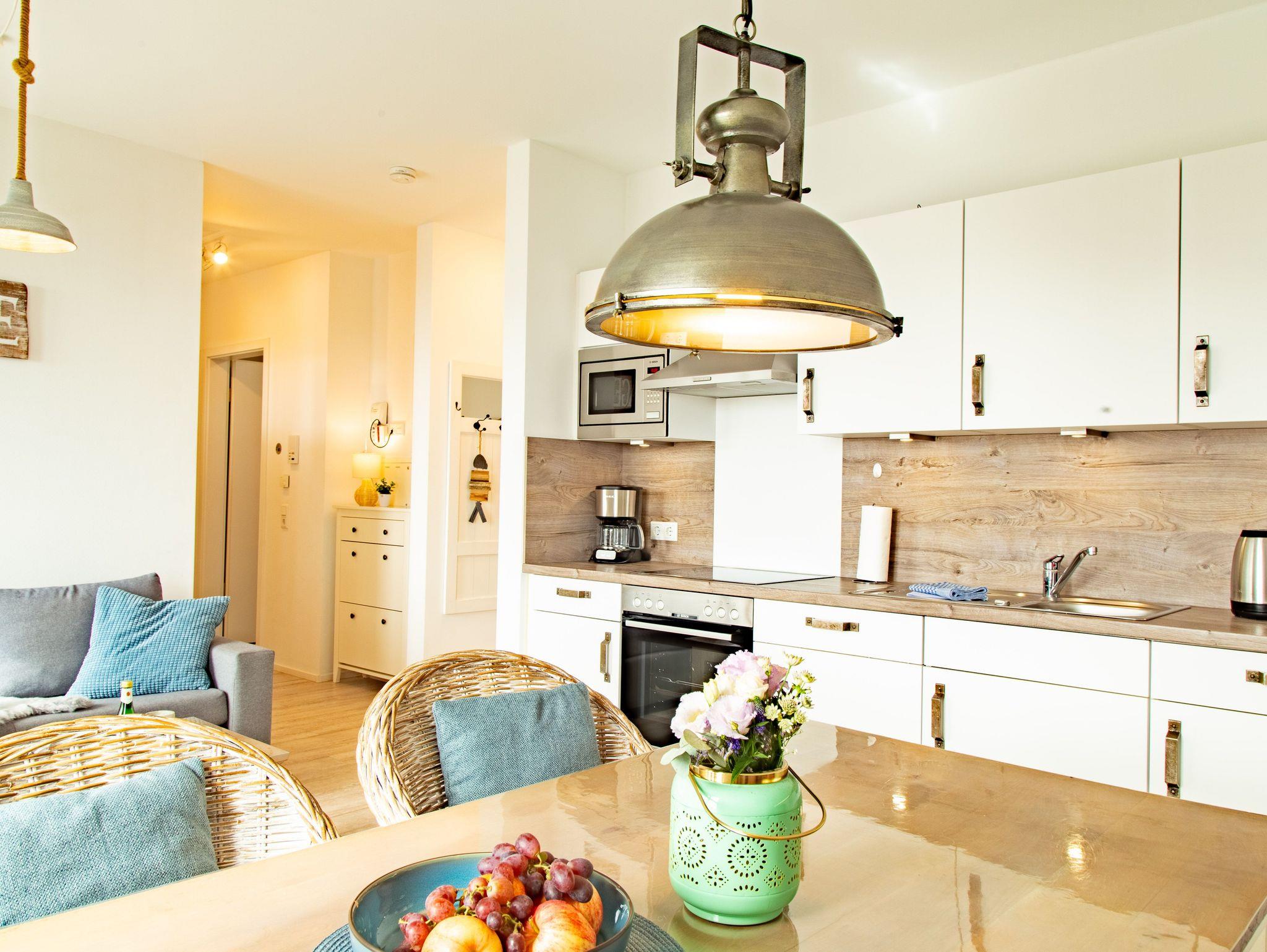 In den offenen Wohnbereich ist neben dem gemütlichen Sofa-/TV (internetfähig) Bereich auch die komplett ausgestattete Küche integriert, mit Kühlschrank inkl. Gefrierfach, Backofen, Mikrowelle, dem Geschirrspüler und weiteren Küchenutensilien, wie Filter-Kaffeemaschine und Wasserkocher, etc..