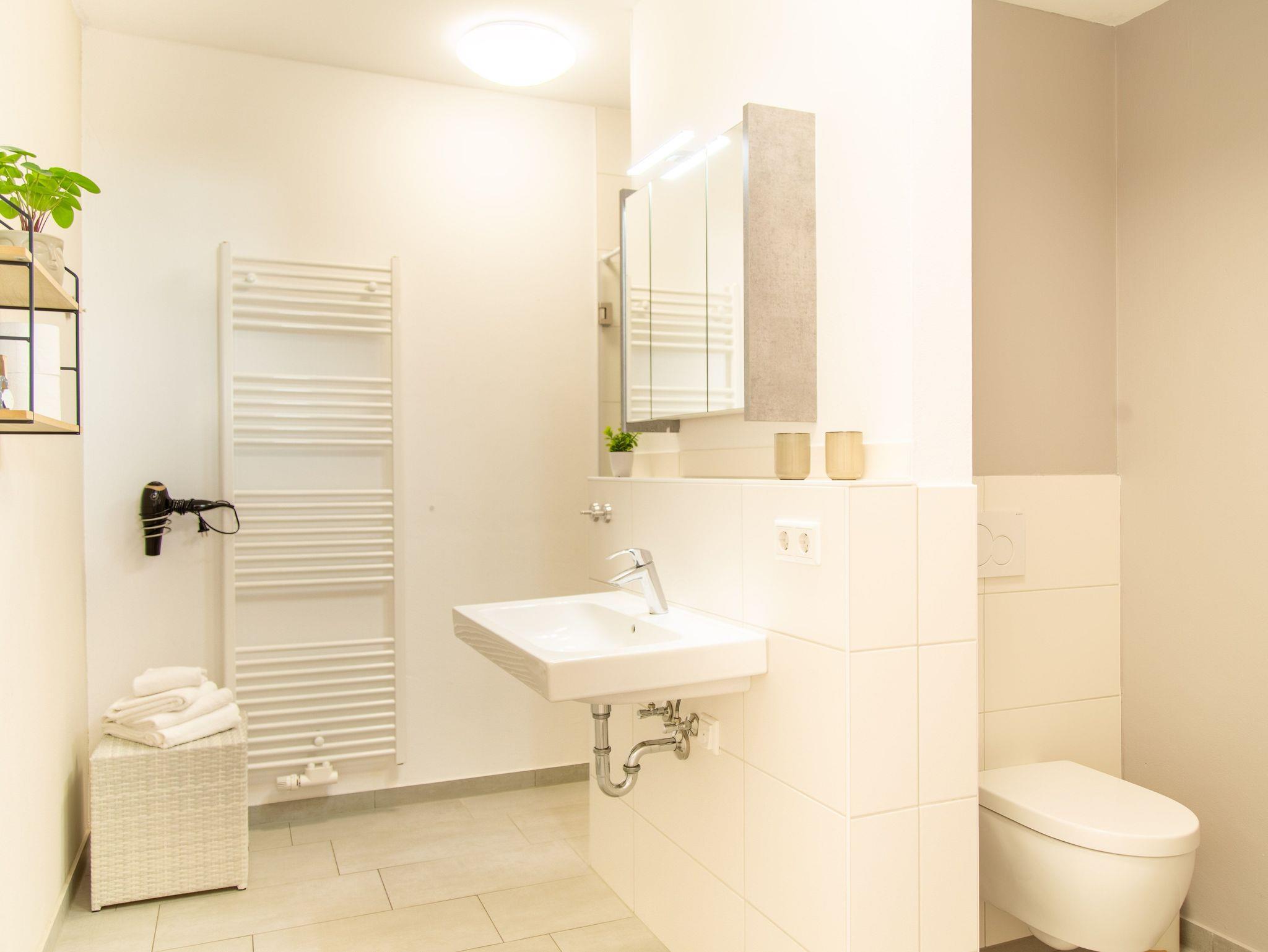 Ein modern gehaltenes Duschbad mit optisch getrenntem WC-Bereich runden diesen Wohntraum am Meer ab.