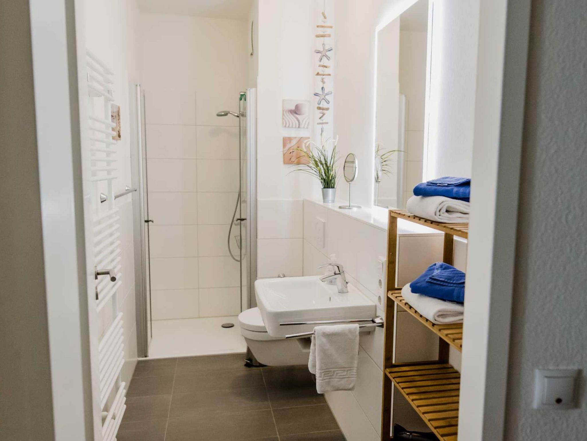 Das Duschbad mit WC verfügt über eine Klarglasduschkabine, die großzügige Spiegelanlage über dem Waschbecken ist beleuchtet. Ein im Duschbad eingebautes Radiogerät rundet den Komfort ab.