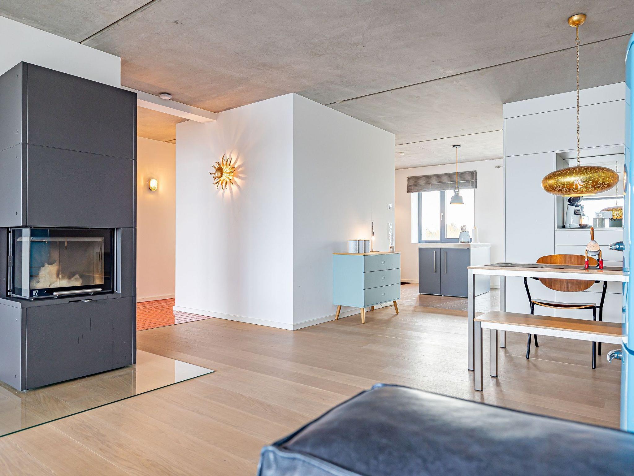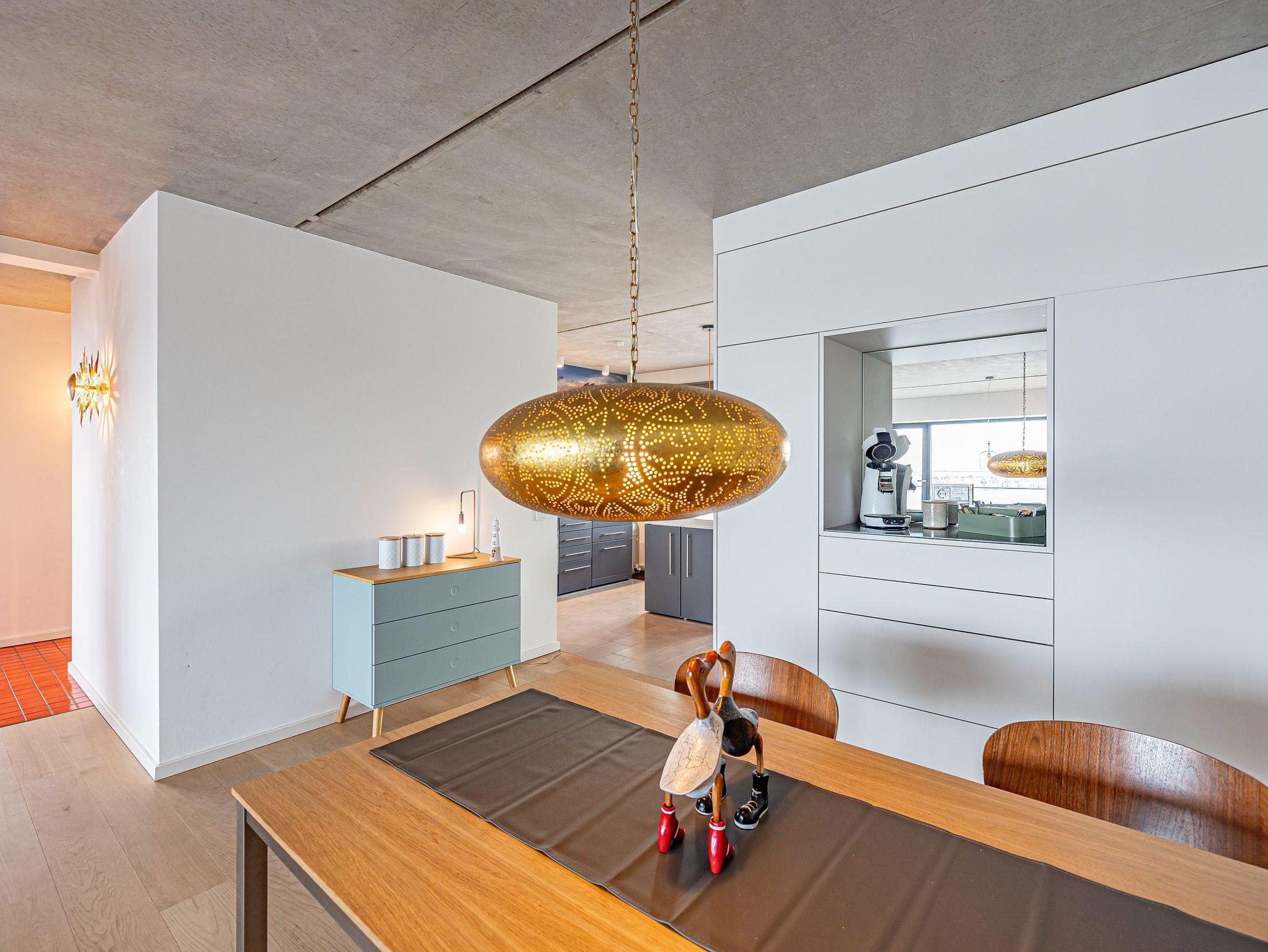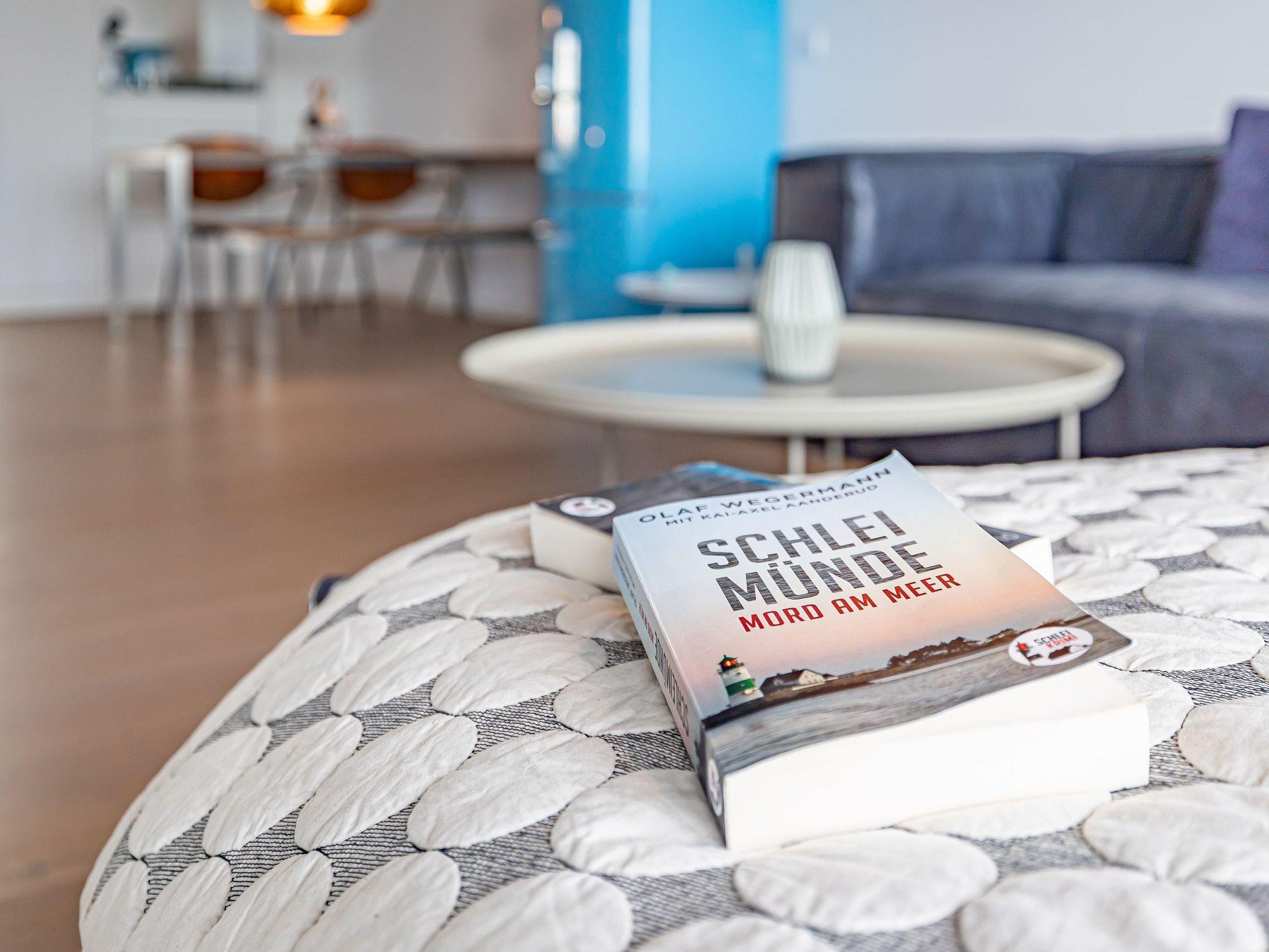 Genießen Sie Ihren Urlaub in einem großzügigen 3-Zimmer-Apartment, das keine Wünsche offenlässt. Die offene, voll ausgestattete Küche mit einem kreativen Wandbild lädt zum gemeinsamen Kochen ein. Im stilvollen Wohnbereich mit Kamin genießen Sie eine warme, einladende Atmosphäre und einen atemberaubenden Panoramablick auf den Hafen, Schleimünde mit seinem Leuchtturm sowie die Ostsee.