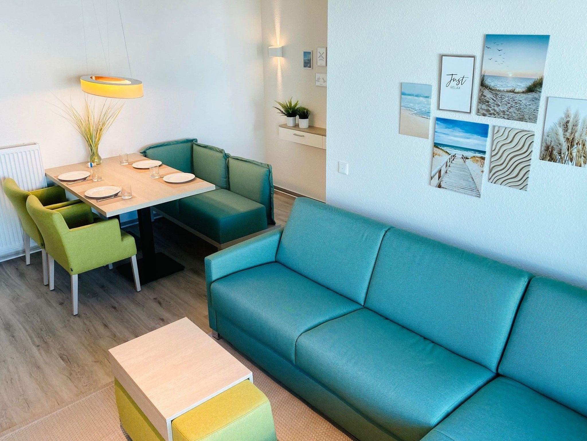 Im großzügigen und offenen Wohn- und Essbereich kann gegessen, relaxt, gespielt, etc. werden. Für Unterhaltung stehen schnelles WLAN, ein Smart-TV und ein Radio (mit Bluetooth) zur Verfügung. Die Couch kann für 2 weitere Schlafplätze genutzt werden.