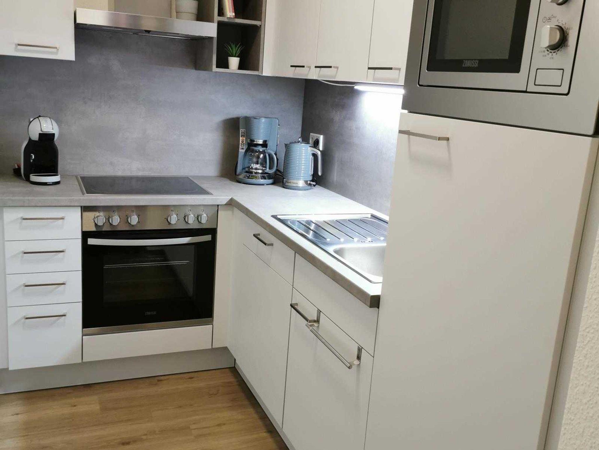 Moderne vollausgestattete Einbauküche: Backofen, Cerankochfeld, Kühlschrank mit Gefrierfach, Einbauspülmaschine, Mikrowelle, Kaffeefiltermaschine, Wasserkocher, Toaster, Nescafé Dolce Gusto, Kontaktgrill.